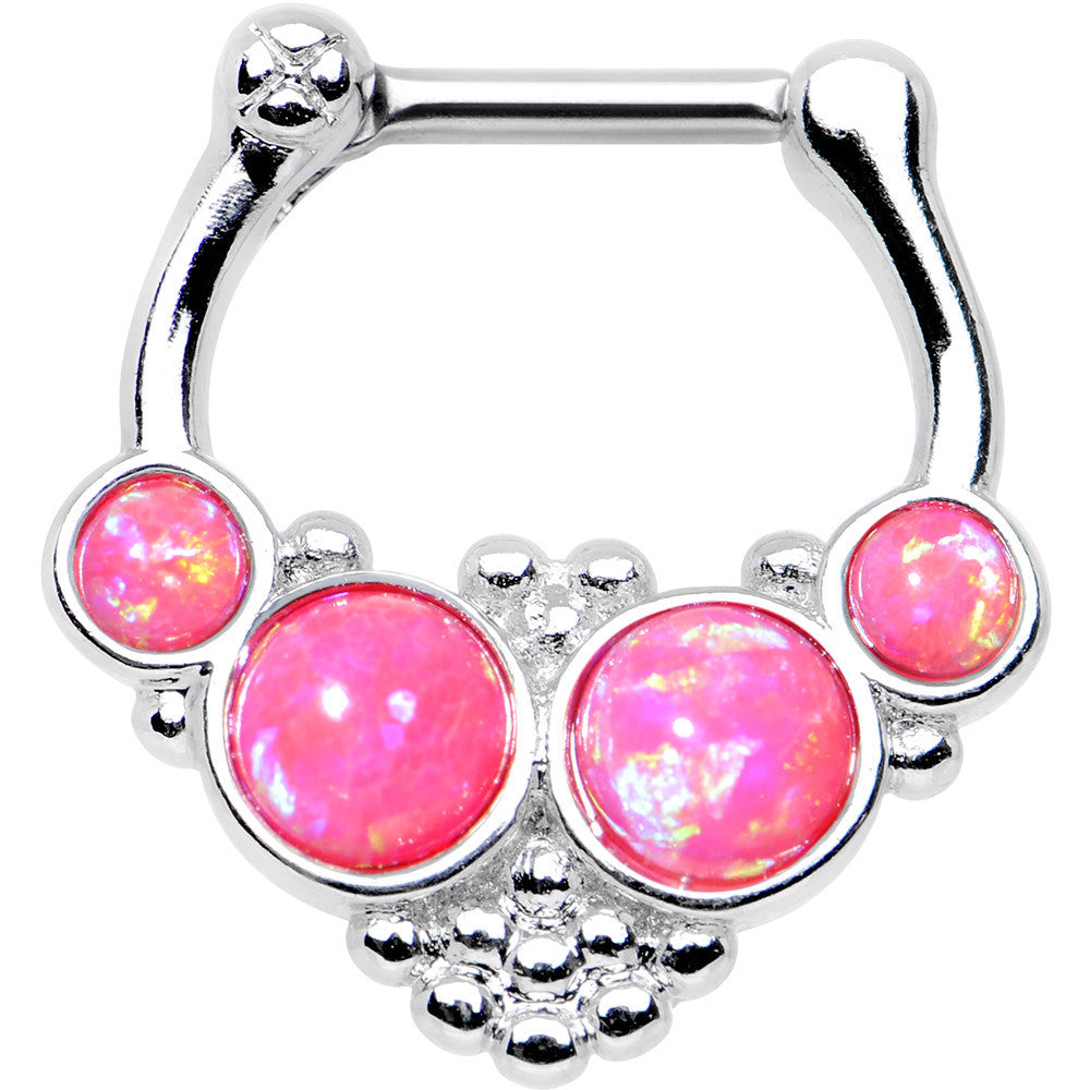 Show off your unique style when you wear this pretty septum piercing. This septum earring is made with a hinged 6mm surgical grade stainless steel straight barbell and a series of pink synthetic opals set on a simple hoop with detail beads that will add simple, charming style to your septum jewelry collection.