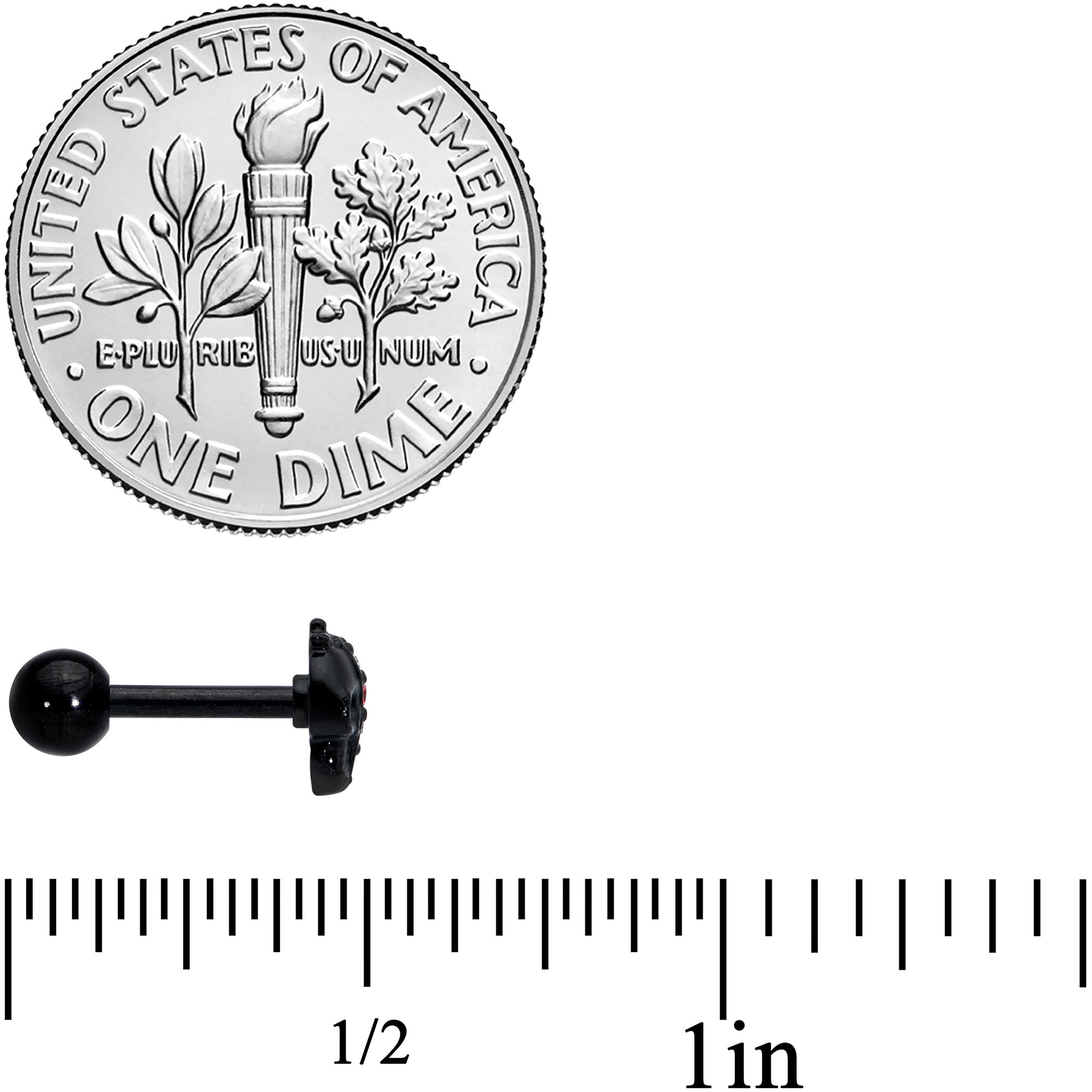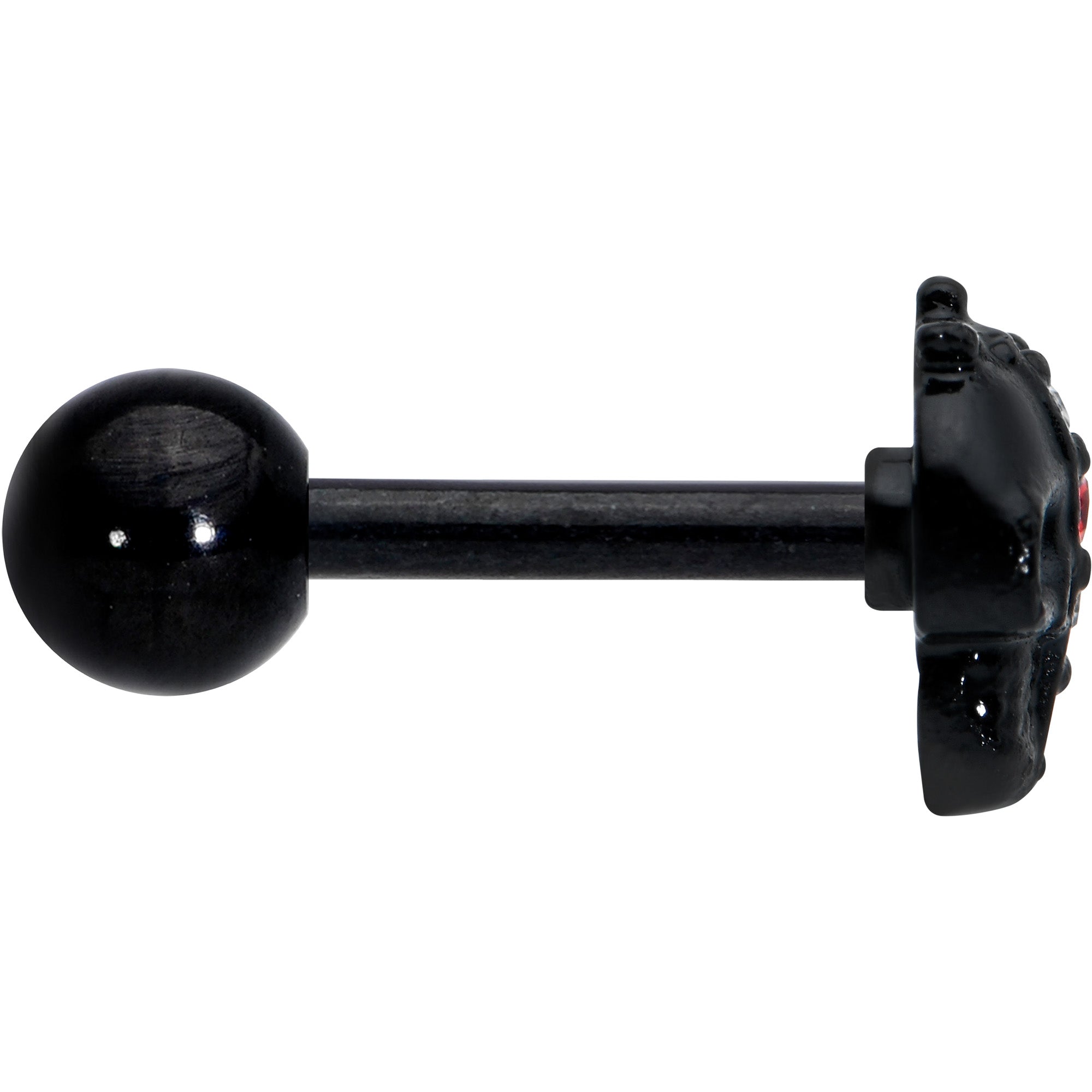 Get spooky, stylish and sexy all at once with this 16 gauge tragus stud! It's made with a 6mm black PVD over 316L surgical grade stainless steel straight barbell with a 4mm ball end. It features a skull charm, with one side of the skull's face paved with clear and red gems. You can even sport this skull in multiple piercings including tragus, helix, and some conch piercings! Add a bit of creepy cool to your cartilage piercings with this skull-themed cartilage piercing ring!