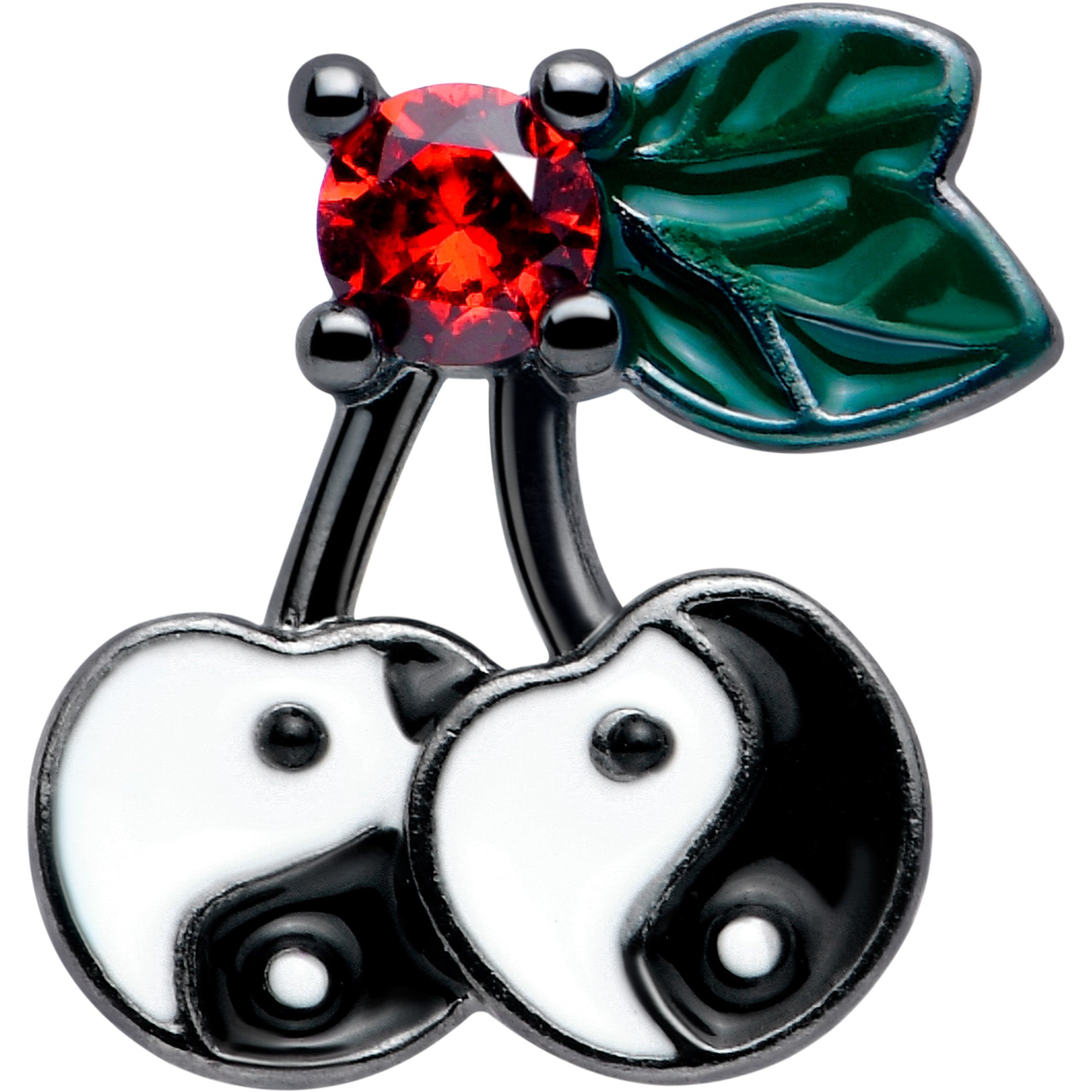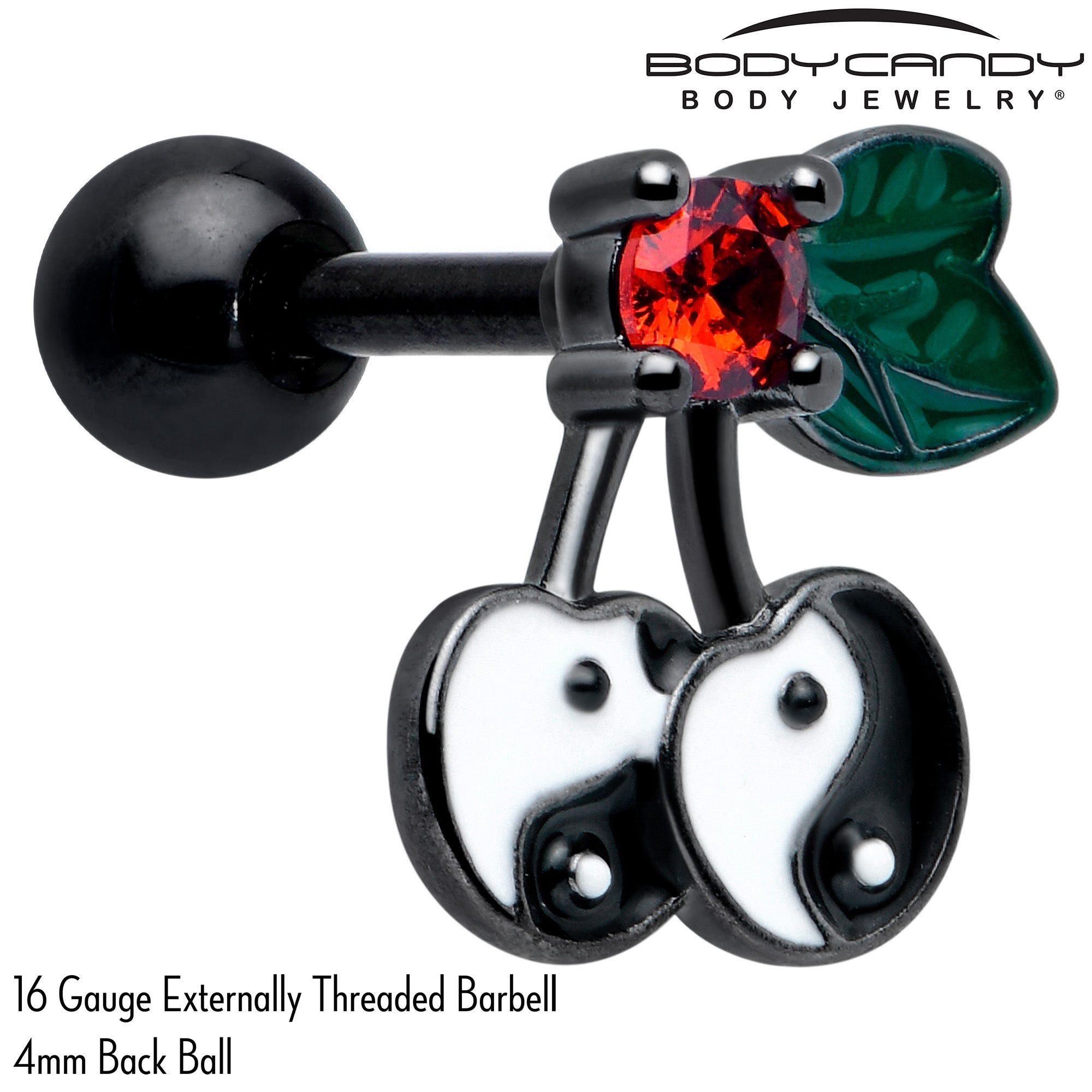Get a whimsical look with a spiritual touch with this 16 gauge tragus stud. It is made with a 6mm black PVD over 316L surgical grade stainless steel straight barbell with a 4mm ball end. It features a cherries charm with a red cubic zirconia gem embellishment. The cherry fruit are feature yin yang symbols, inlaid in black and white. You can even rock it in multiple piercings including tragus, helix, and some conch piercings. You are sure to love this tasty cartilage piercing jewelry all the way down to your soul.