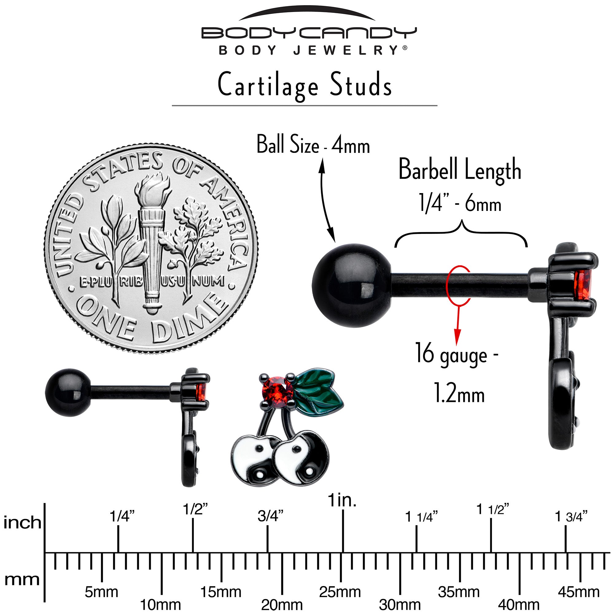 16 Gauge 1/4 Red CZ Gem Black Yin Yang Cherry Cartilage Tragus Earring