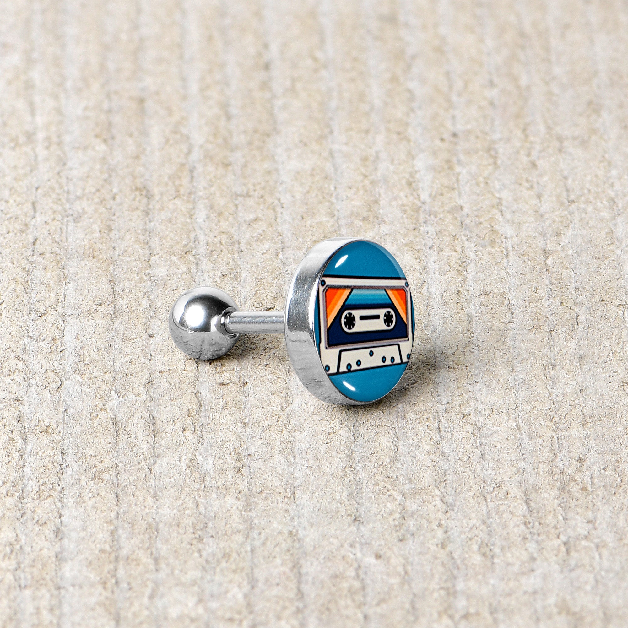 Capture the music and the moment with this retro 16 gauge tragus stud! It's made with a 6mm durable 316L surgical grade stainless steel straight barbell with a 4mm ball end. The disc-shaped front end is blue and features a cassette tape charm. This 80's flashback features a white body and colorful detailing in the corners for maximum impact and you can rock it in multiple piercings including tragus, helix, and some conch piercings. Grab your boombox and get ready to rock with this wonderfully retro cartilage piercing ring!