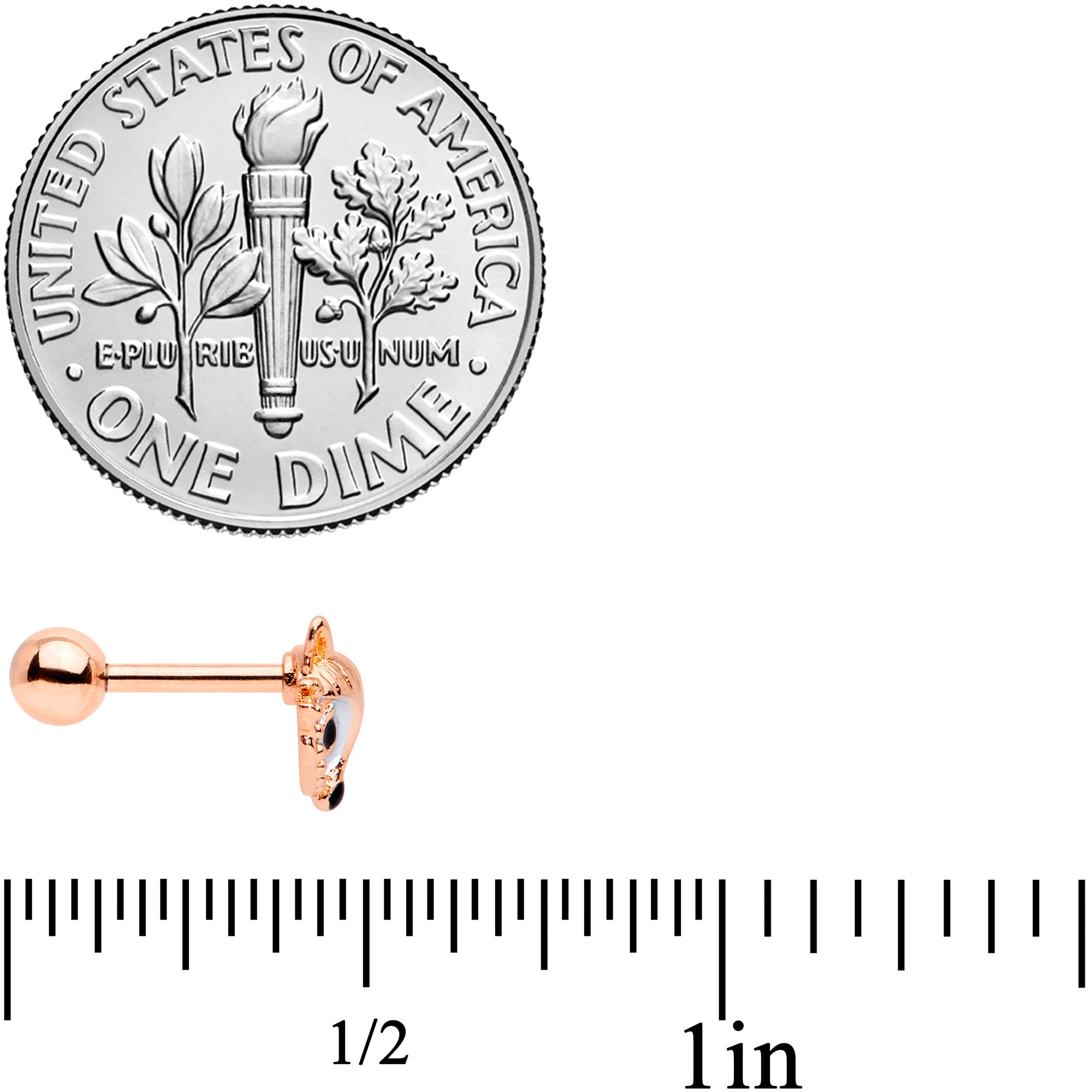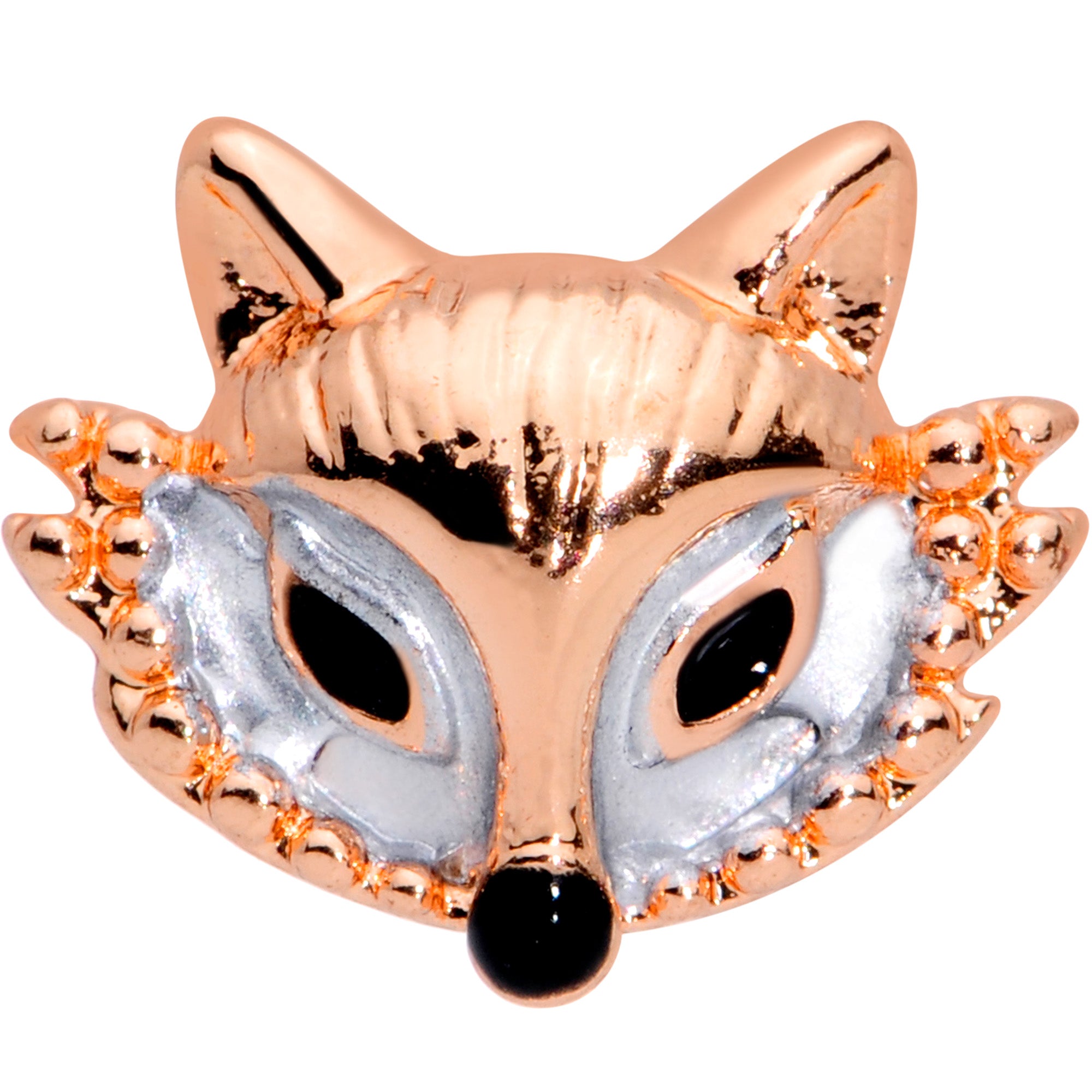 The fox on this 16 gauge cartilage stud will give your piercings a look that's absolutely fabulous! It's made with a 6mm rose gold tone PVD over 316L surgical grade stainless steel straight barbell with a 4mm ball end. The front features the face of a fox charm. It has white embellishment around the eyes for maximum visual impact and black eyes and nose. You can even wear it in multiple piercings including tragus, helix, and some conch piercings. This vulpine vixen is sure to add some foxy fashion to your cartilage piercings!