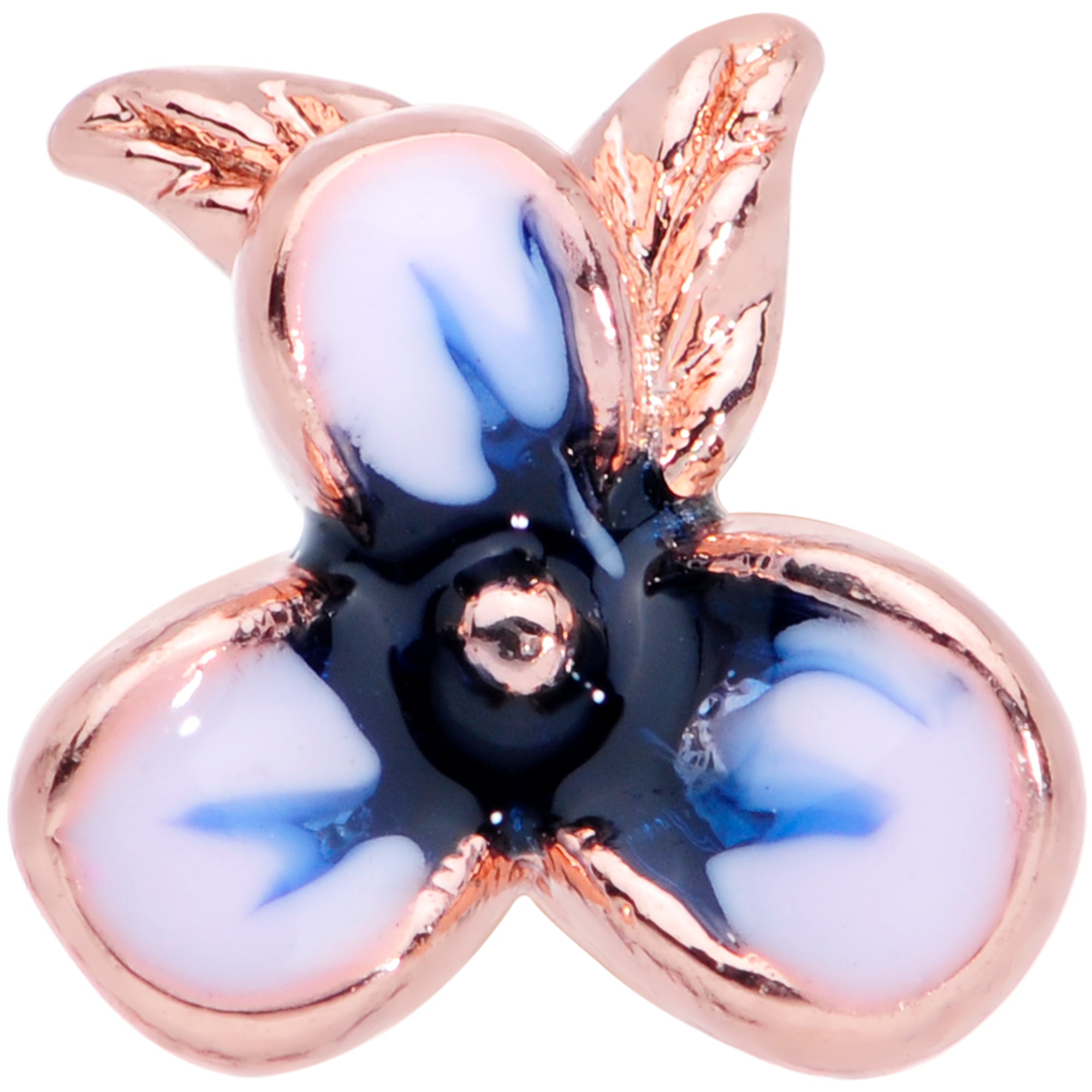 Time to replace the winter blahs with springtime hues with this 16 gauge cartilage stud! It's made with a 6mm rose gold tone PVD over 316L surgical grade stainless steel straight barbell with a 4mm ball end. It features a blue and white flower charm. Best of all, this flower looks fabulous in multiple piercings including helix, tragus, and some conch piercings. Let the blues blossom into beauty with this fabulous floral cartilage jewelry!