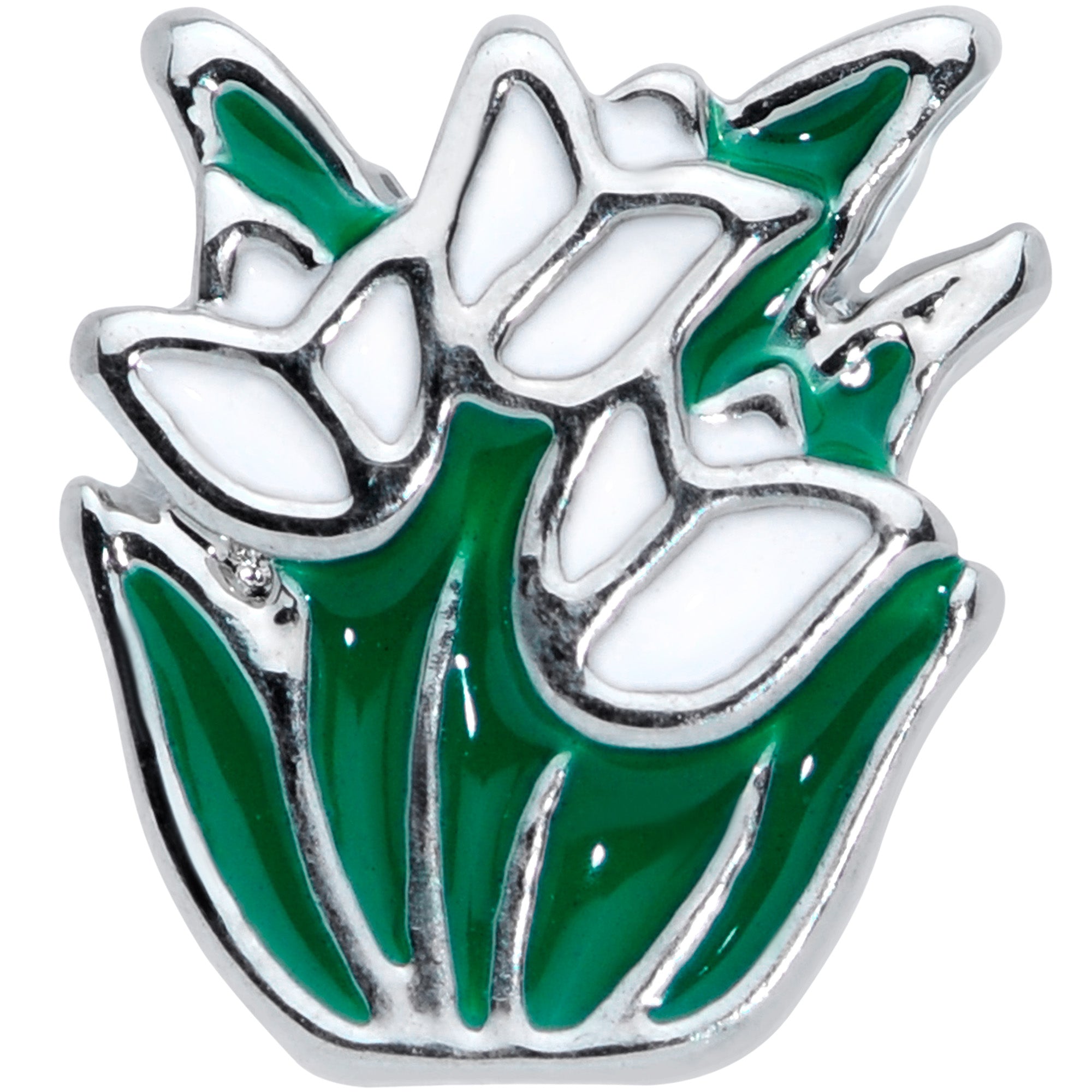 Treat yourself to some Springtime tulips with this 16 gauge cartilage stud! It's made with a 6mm durable 316L surgical grade stainless steel straight barbell with a 4mm ball end. It features a flower charm of tulips, with the leaves and stems inlaid in deep green and the blossoms inlaid in simple white. You can also flaunt these flowers in multiple piercings including tragus, helix, and some conch piercings. Score a sexy and stylish Spring look with this gorgeous floral tragus stud!