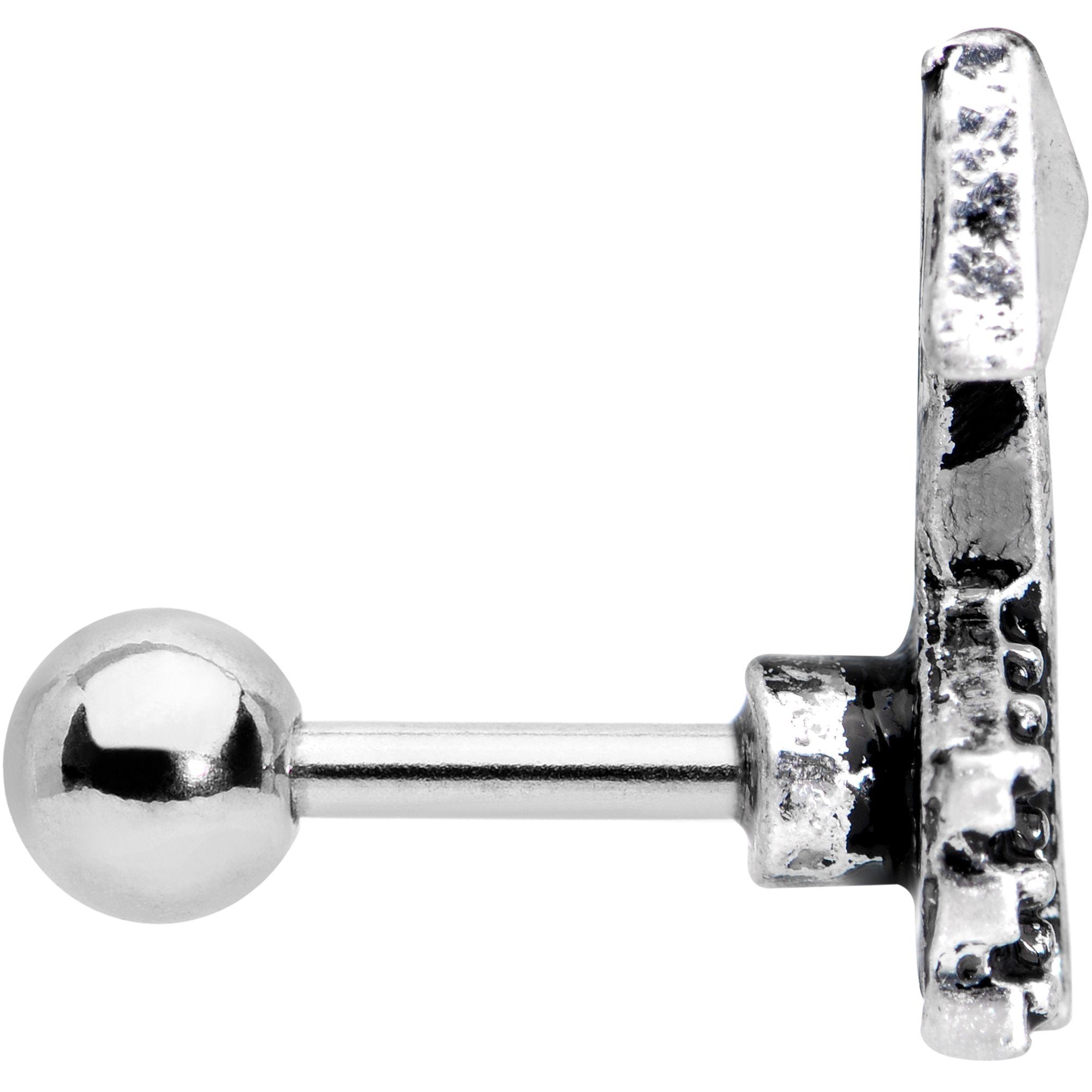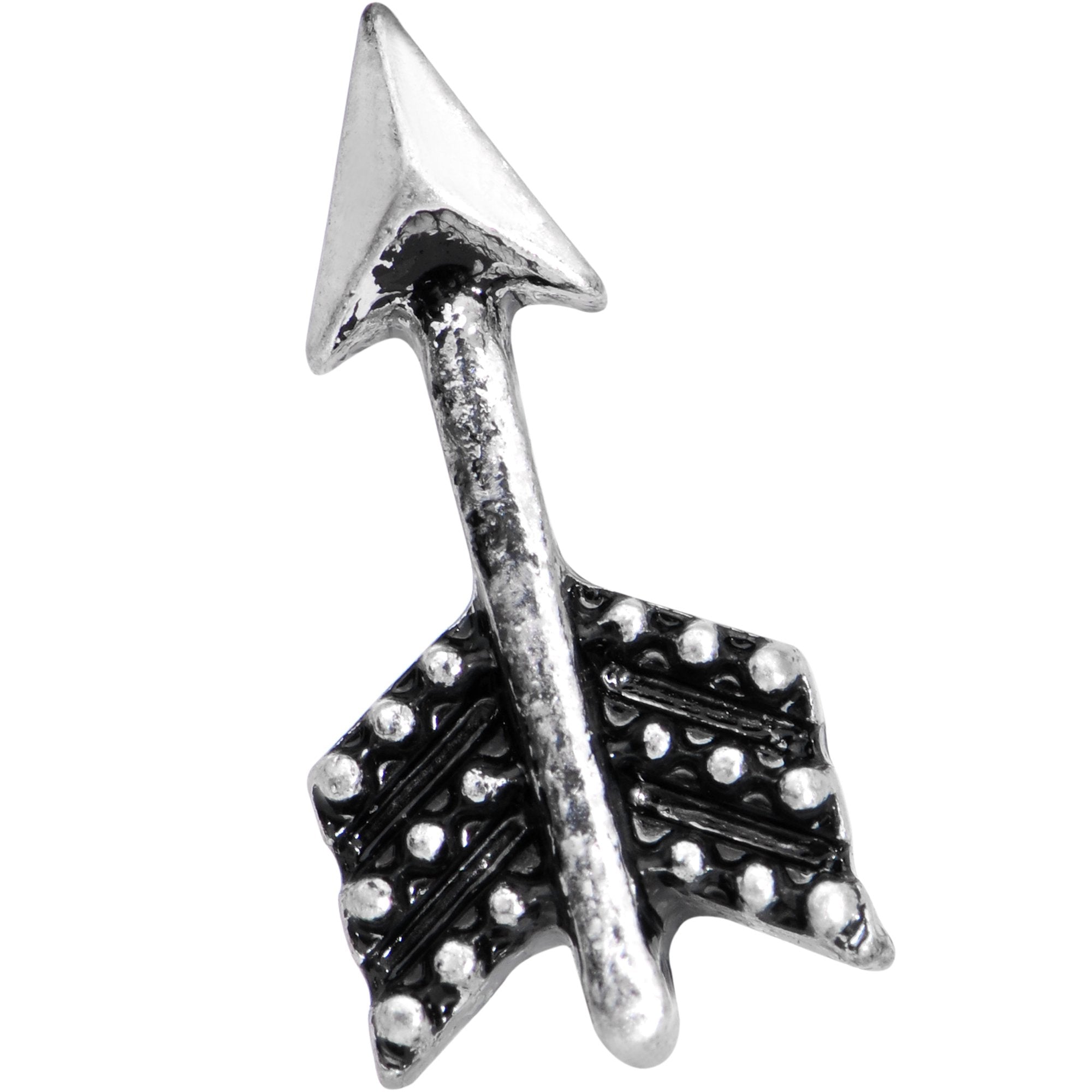 All arrows point to you... looking great with this cool cartilage piercing! An arrow charm with feather-inspired ends is mounted on the end of this 16 gauge tragus piercing. The arrow charm is mounted on a 6mm straight barbell made with durable 316L surgical grade stainless steel.