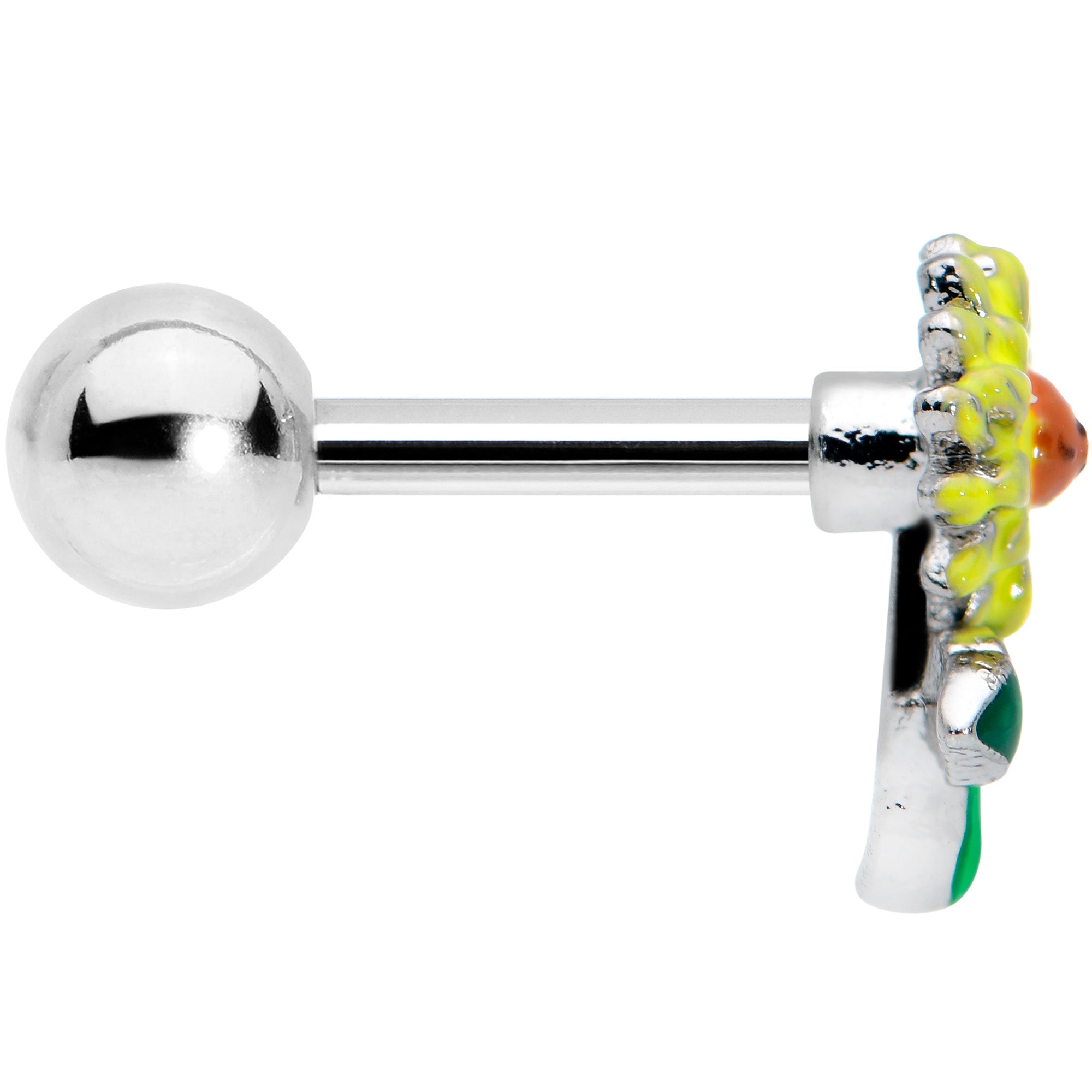 Give your look a sunnier feel with this 16 gauge tragus stud! It's made with a 6mm durable 316L surgical grade stainless steel straight barbell with a 4mm ball end. It features a sunflower charm. The sunflower is yellow and has brown detailing at the center and a green leaf embellishment for a look that's colorful, whimsical, and sure to cure a case of the blues! Plus you can flaunt this flower in multiple piercings including tragus, helix, and some conch piercings. Give yourself a sunnier style with this fabulous floral cartilage stud!