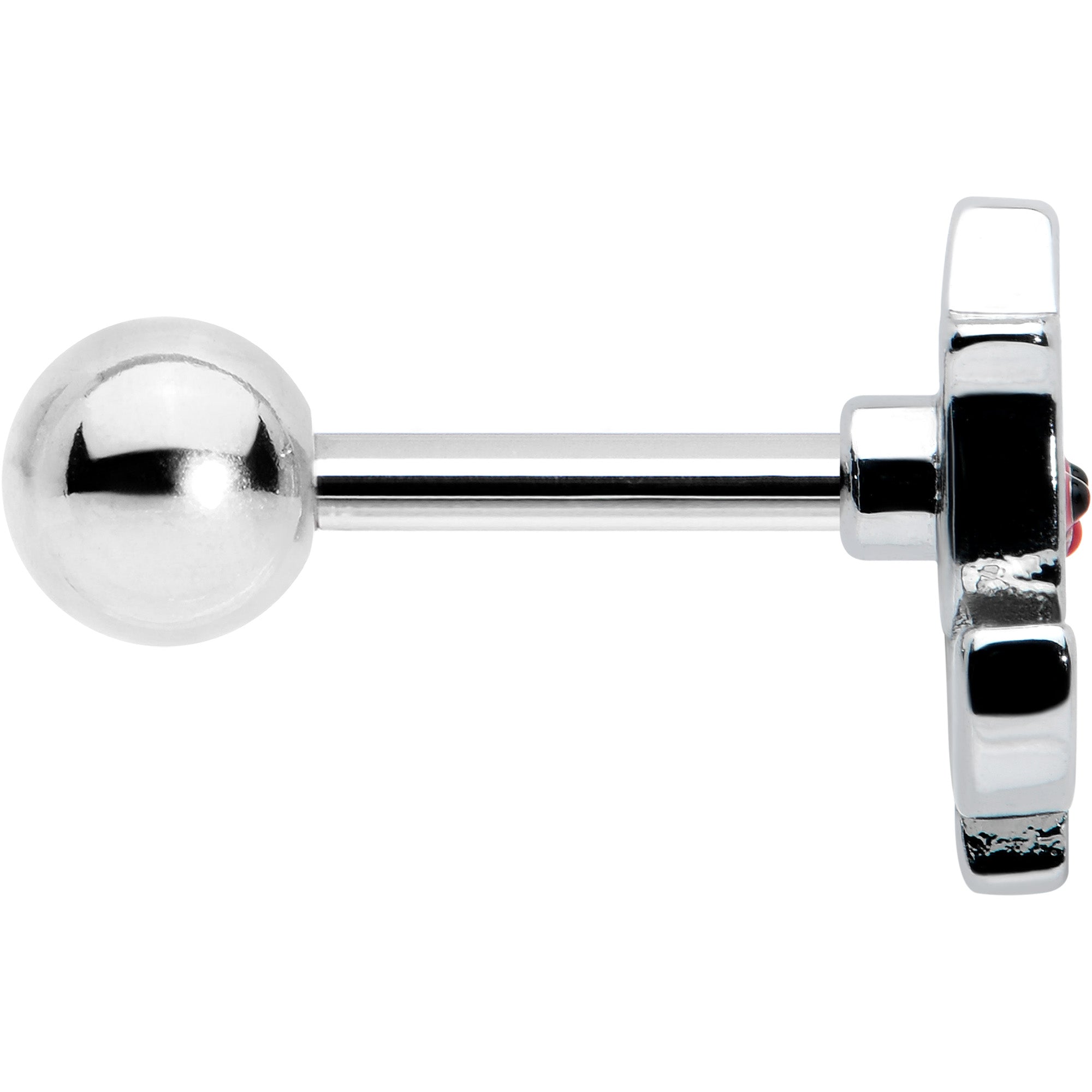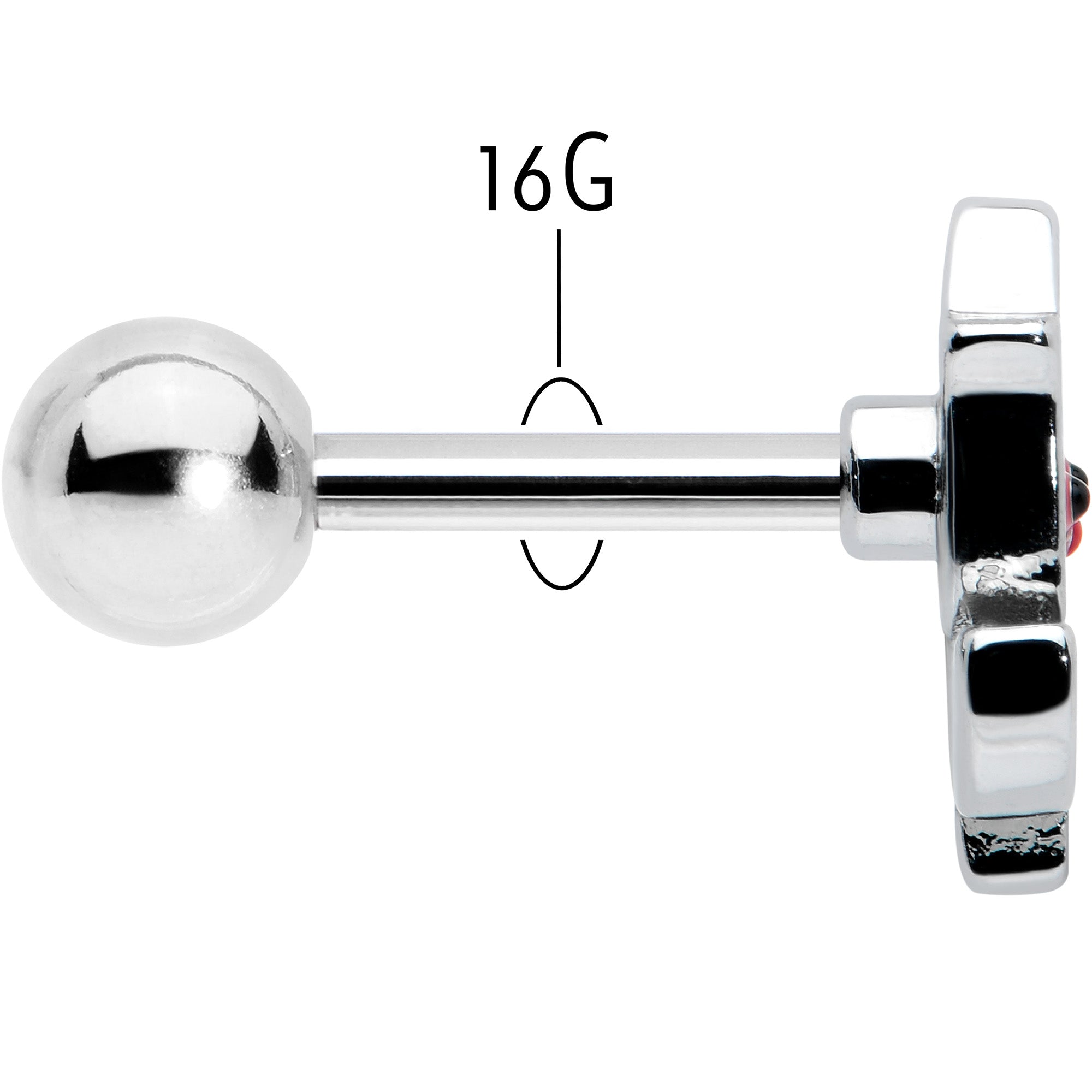 The rose on this 16 gauge tragus stud looks delighted to be adorning your piercings! It's made with a 6mm durable 316L surgical grade stainless steel straight barbell with a 4mm ball end. It features a rose flower charm, with a red inlaid blossom and green inlaid leaves and stem. It also features a cheerful face on the blossom portion, for a truly winsome touch. You can even rock it in multiple piercings including tragus, helix, and some conch piercings. Rise to every occasion with with this endearing floral cartilage piercing ring!