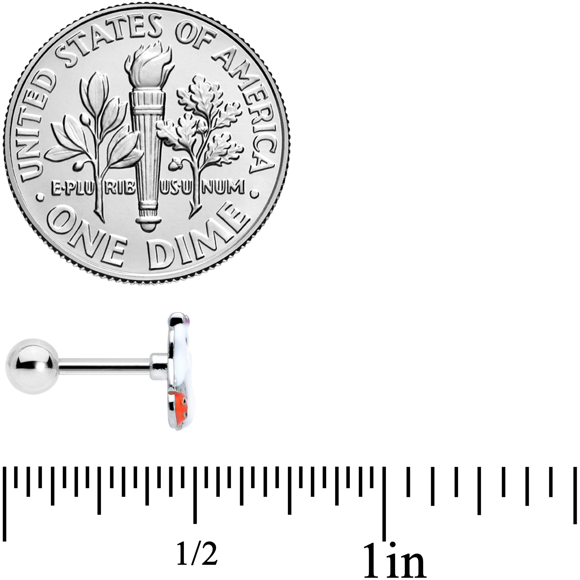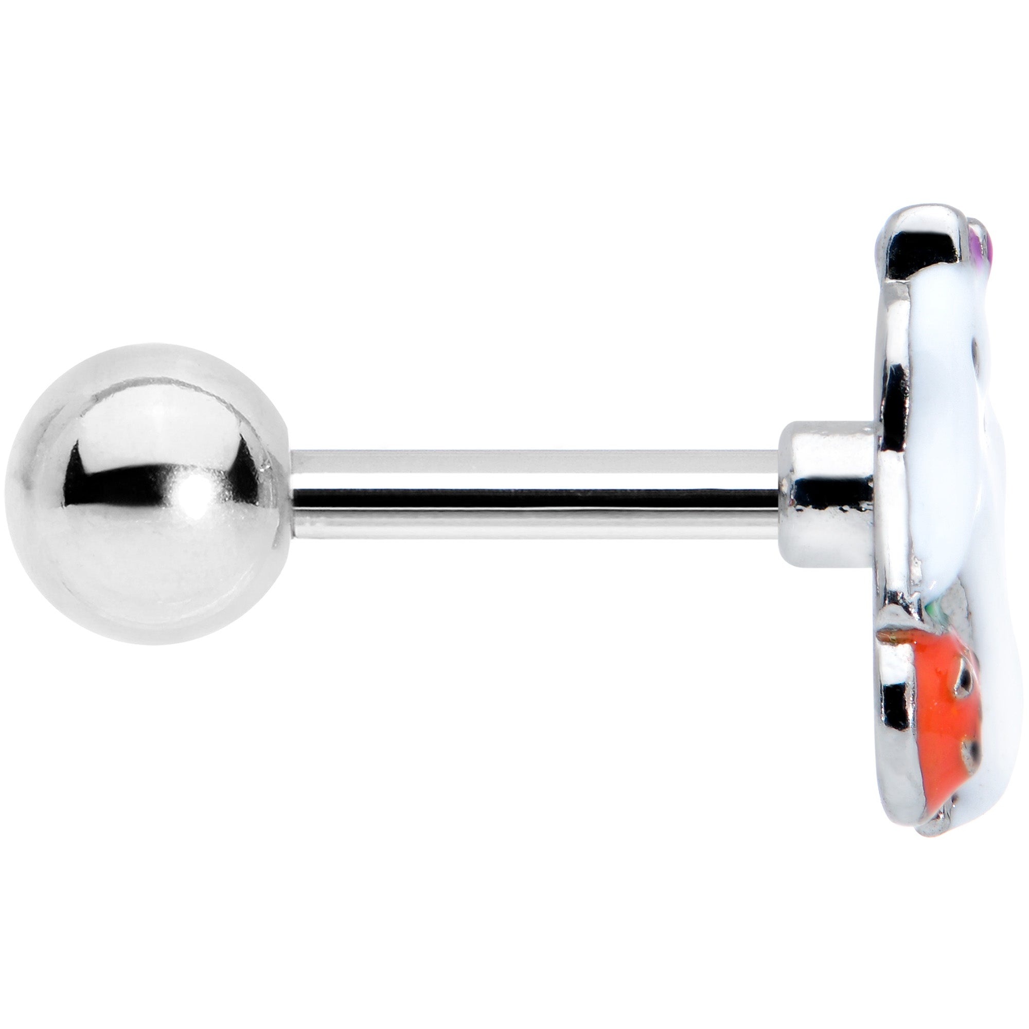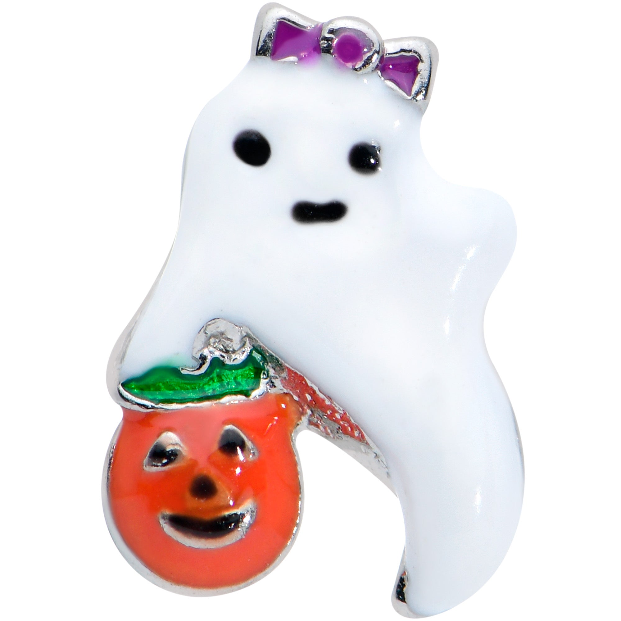 Someone's all dressed up and ready for Halloween on this 16 gauge tragus stud! It's made with a 6mm durable 316L surgical grade stainless steel straight barbell with a 4mm ball end. It features a ghost charm with a purple bow and pumpkin for trick or treating too! You can even wear it in multiple piercings including helix, tragus, and some conch pieercings. Get a look that's absolutely haunting and sweeter than Halloween candy with this trick or treating ghost cartilage jewelry!