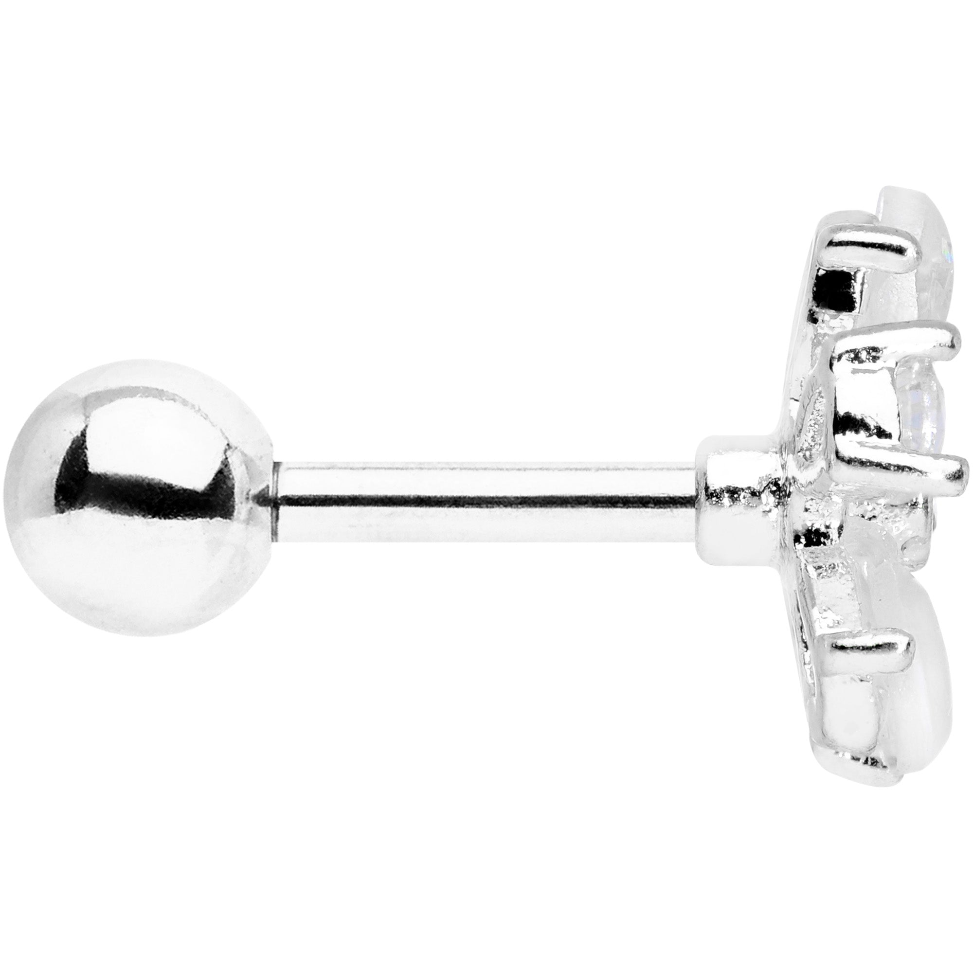 Show off your love of nature's treasure when you wear this fun 16 gauge cartilage stud. Made with a 6mm durable 316L surgical grade stainless steel straight barbell with a 4mm ball end, this tragus jewelry features a five-petal flower charm made with a quintet of beautiful, iridescent white faux opals and central clear gems. The overall look is demure, yet extremely on-trend and perfect for Spring. You can wear this cartilage earring in multiple piercings including the helix, tragus, and some conch piercings! Let your cartilage piercing bloom with this fabulous flower body jewelry!