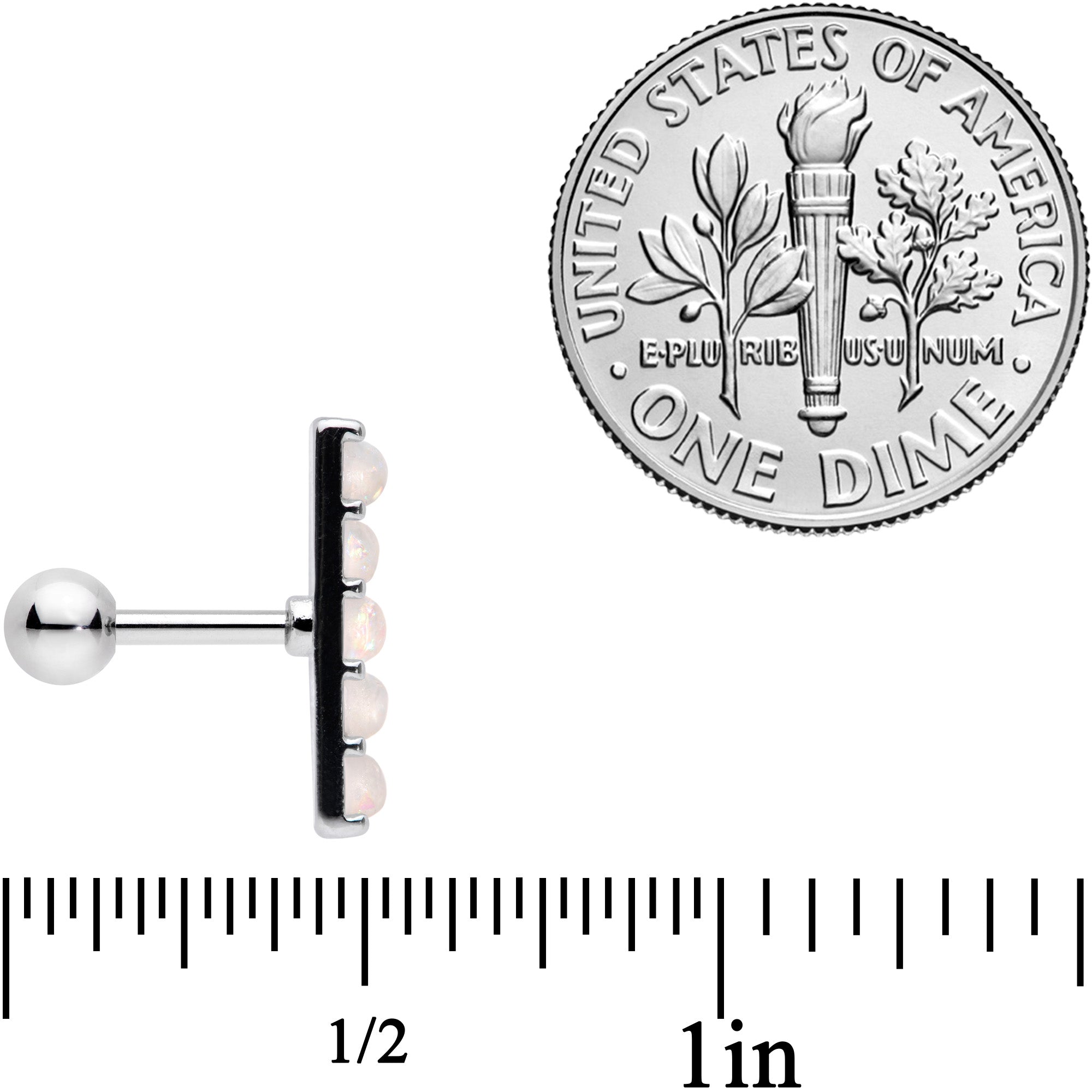 This 16 gauge cartilage earring is made with a 6mm durable 316L surgical grade stainless steel straight barbell and has a 4mm ball end. It features a line of five white faux opals for a look that's both glamorous and on-trend. Even better, this cartilage stud works beautifully in multiple piercings including the tragus, conch, and helix. No need to be contrary - you're sure to love this tragus stud!