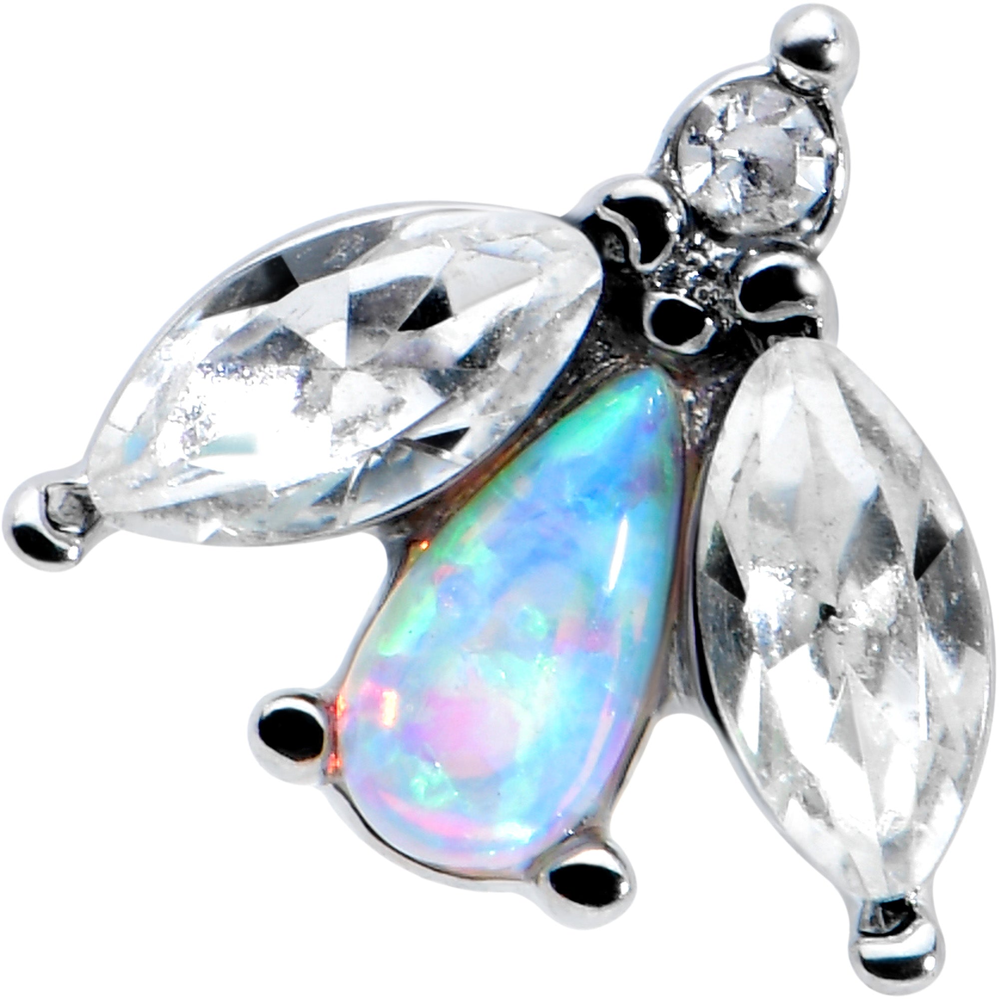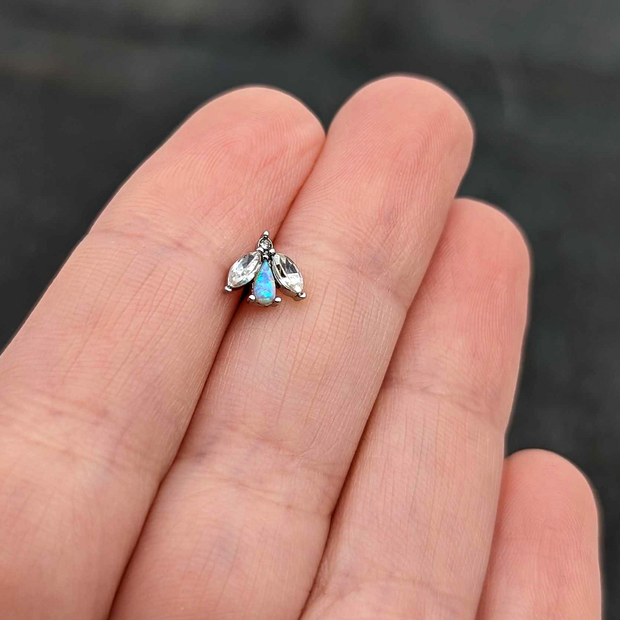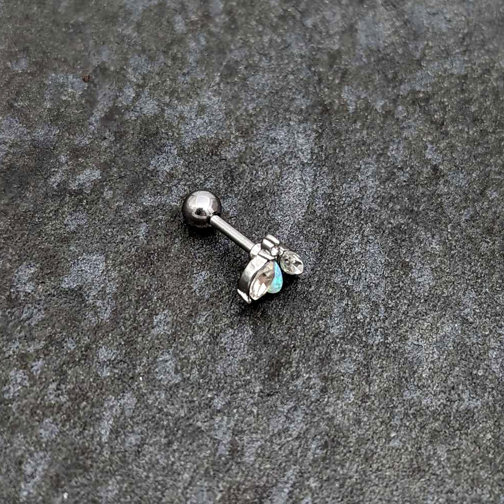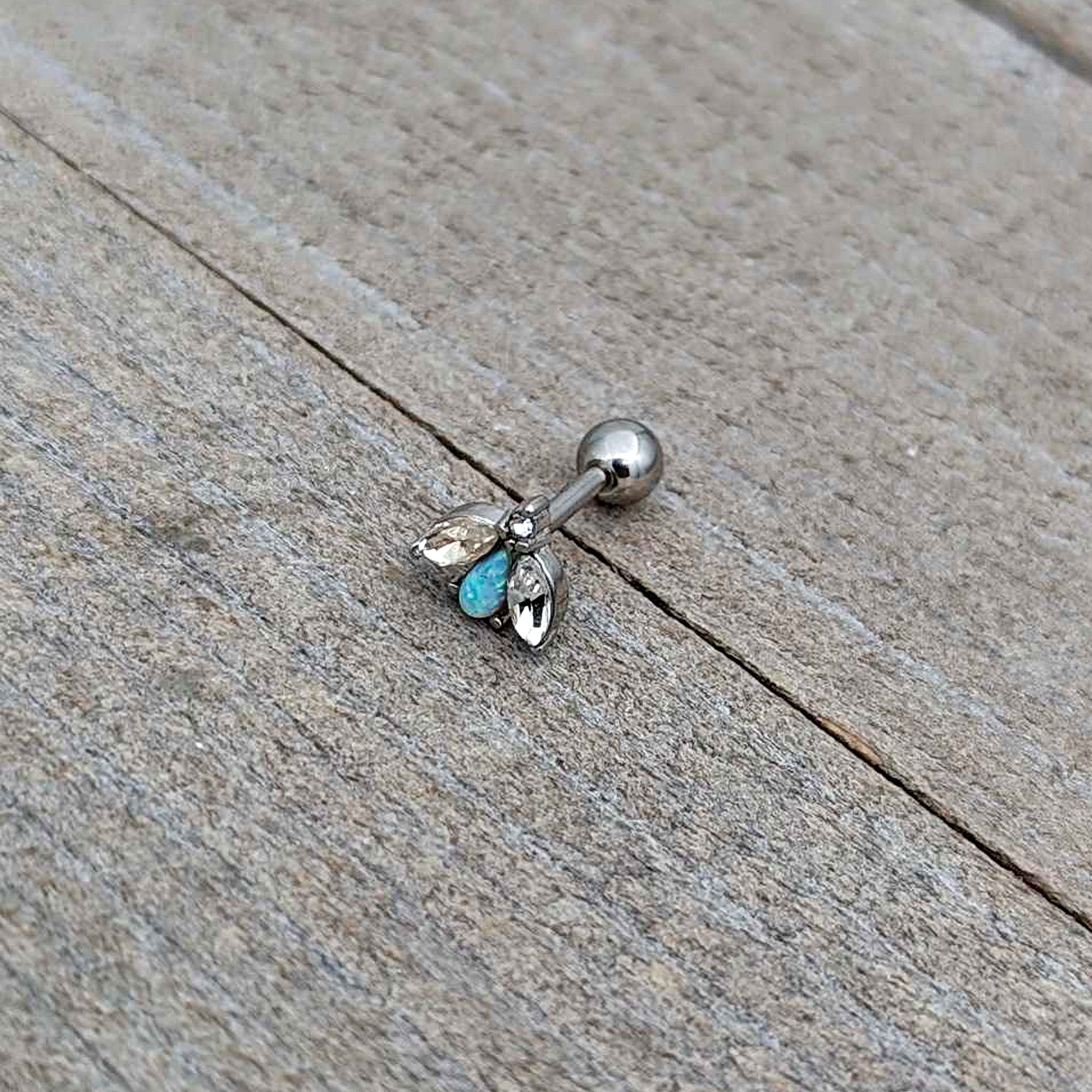 With lovely color and style, you can't help but love this 16 gauge tragus stud! It's made with a 6mm durable 316L surgical grade stainless steel straight barbell with a 4mm ball end. It features a flower charm, the leaves set with small clear gems and the blossom composed of a white synthetic opal. You can even rock it in multiple piercings including tragus, helix, and some conch piercings. Keep it simple while keeping it stylish with this fabulous flower cartilage piercing ring!