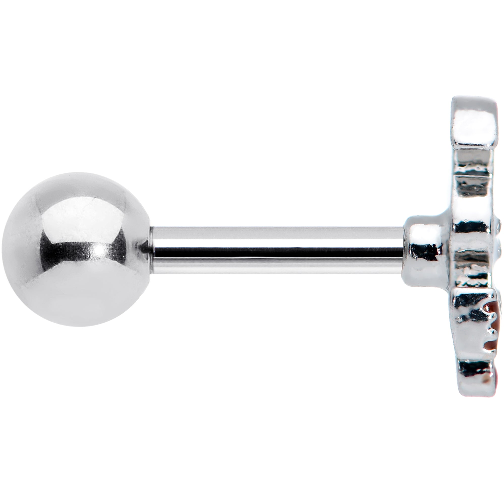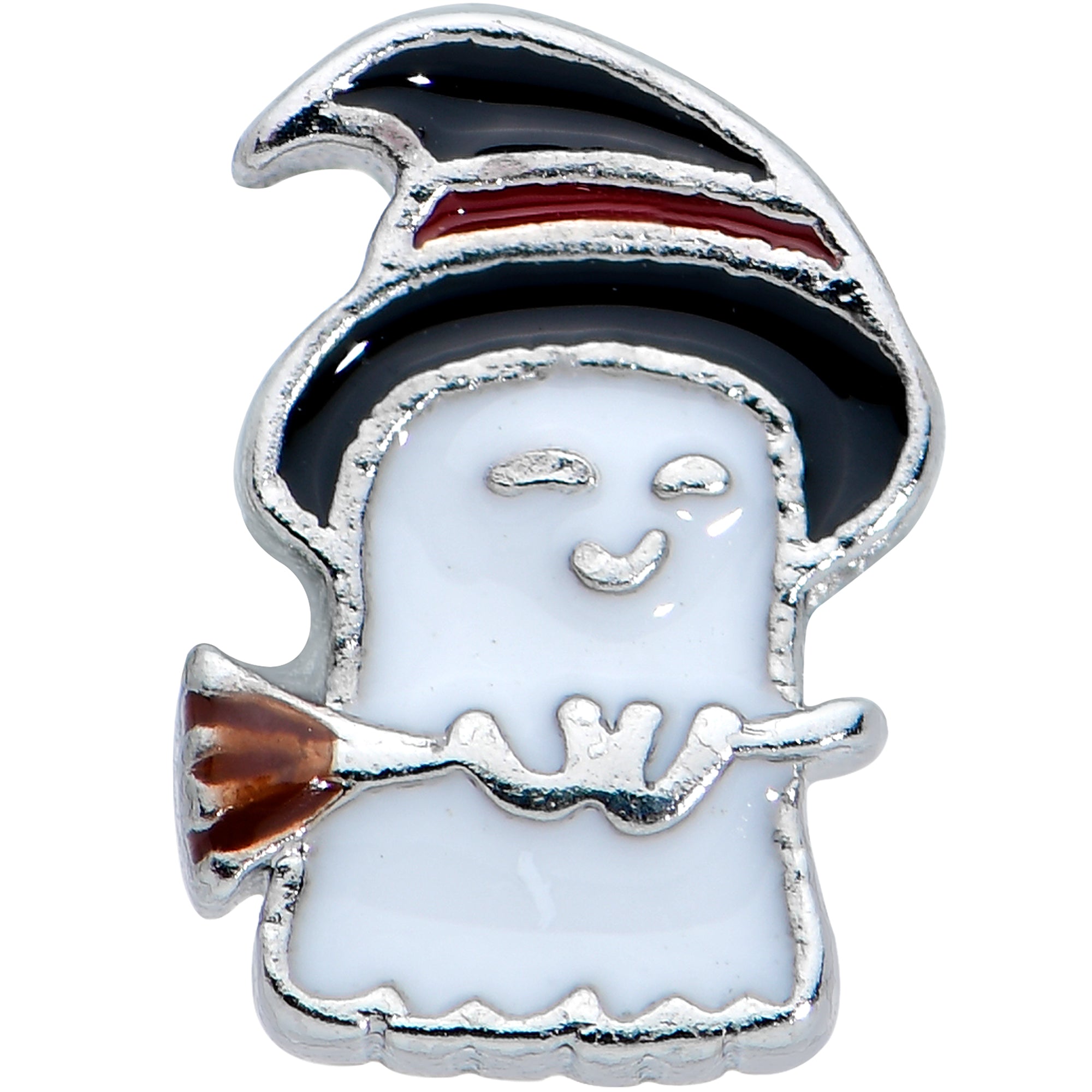 The ghost on this 16 gauge tragus stud is sure to cast a spell on you! It's made with a 6mm durable 316L surgical grade stainless steel straight barbell with a 4mm ball end. It features a ghost charm, wearing a black witch's hat with a red band and carrying a broom. You can even wear it in multiple piercings including helix, tragus, and some conch piercings. This witchy ghost cartilage jewelry is absolutely magic!