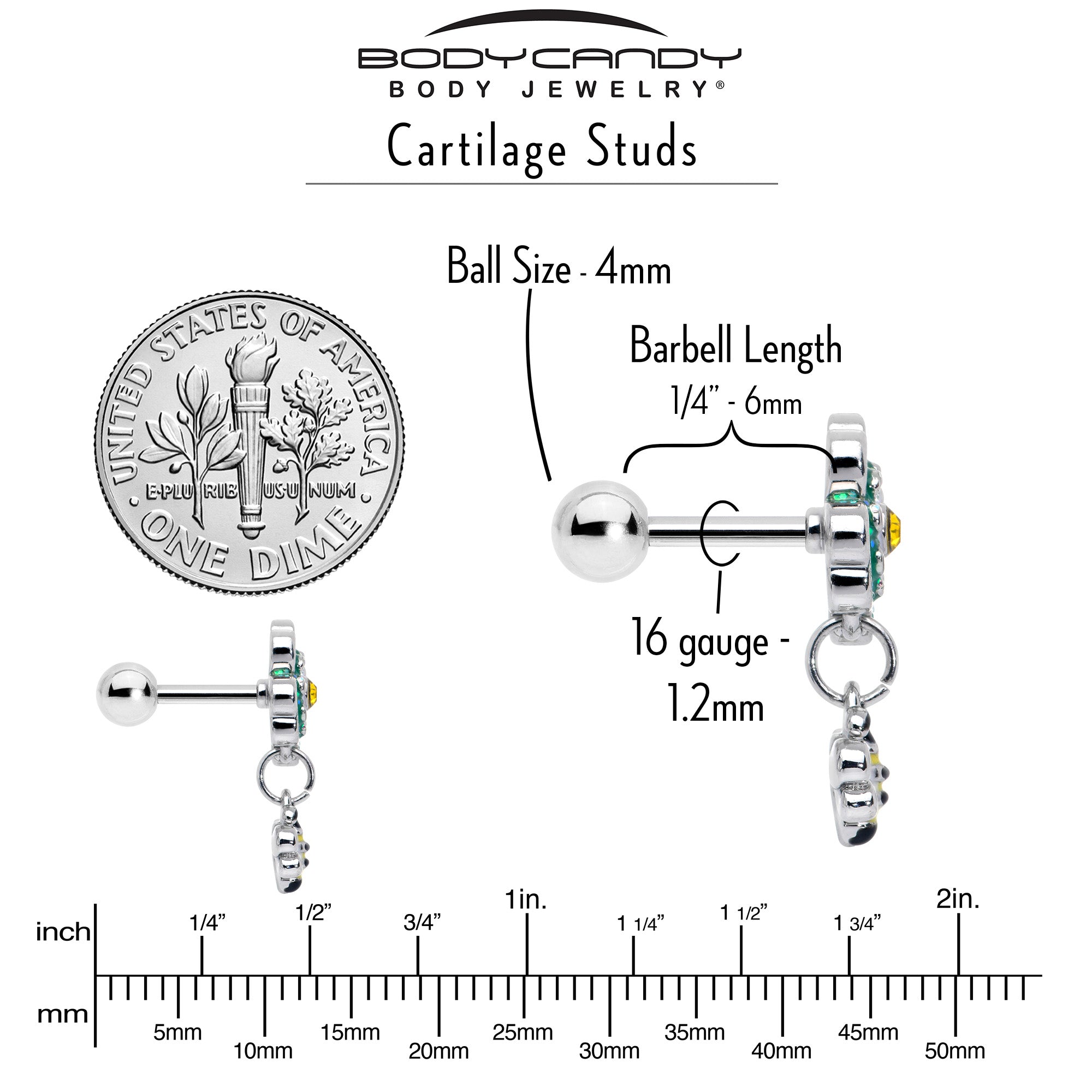 Get your glitter going with this 16 gauge tragus stud. It is made with a 6mm durable 316L surgical grade stainless steel straight barbell with a 4mm ball end. It features a flower charm, with white petals and a yellow gem center. The flower also features a green glitter inlaid trim. Dangling beneath is a bee charm with white wings and inlay stripes and you can even rock it in multiple piercings including tragus, helix, and some conch piercings. You will be absolutely glitter glam when you are rocking this fabulous floral cartilage piercing jewelry.