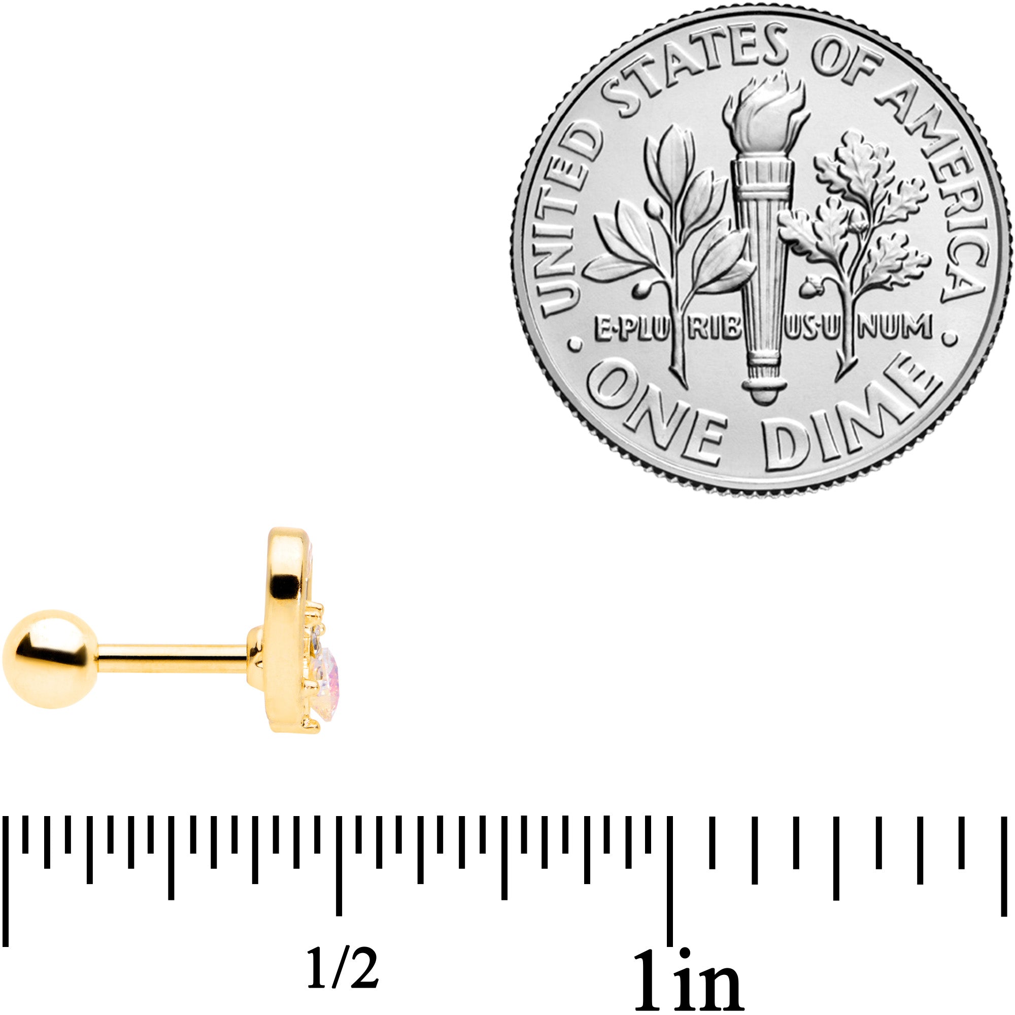If you're an open-hearted person but don't want to wear your heart on your sleeve.....now you can wear it on your ear with this 16 gauge tragus stud! It's made with a 6mm gold tone plated over 316L surgical grade stainless steel straight barbell with a 4mm ball end. It features an open-centered heart set with an aurora gem and several small clear gems for visual contrast. This cartilage earring works well in multiple piercings including the helix and tragus. So pop it in your cartilage piercing and let the whole world see what an open-hearted soul you are!