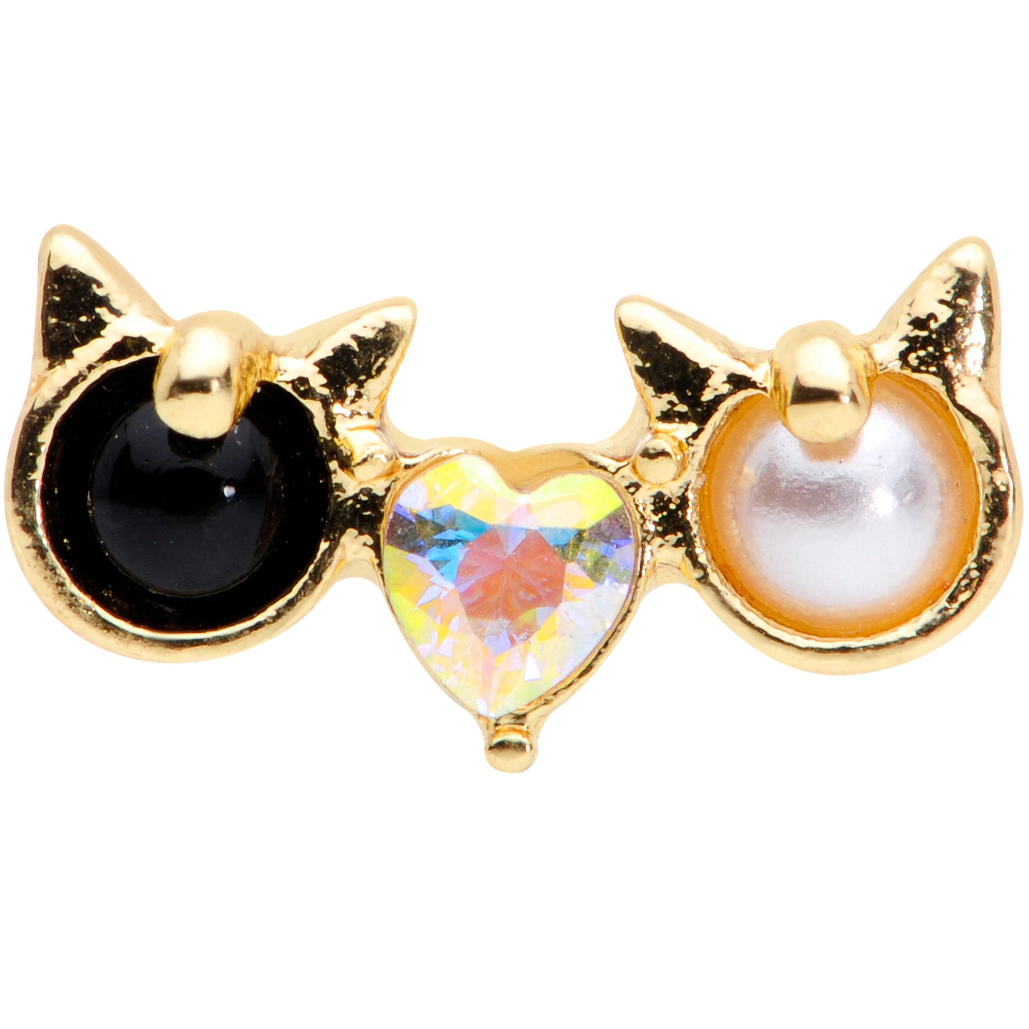 Opposites really do attract - and they'll definitely attract attention when you're wearing this 16 gauge cartilage stud! It's made with a 6mm durable 316L surgical grade stainless steel straight barbell and has a 4mm ball end. It features a double cat charm with pointy cat ears, one made with an opaque black cubic zirconia gem. The other is made with an opaque white cubic zirconia gem. Between them is an aurora color gem in the shape of a heart. And these kitties work well in multiple piercings including cartilage piercings like the tragus, conch, and helix. These two kitties will certainly capture your heart once you pop them in your piercing!