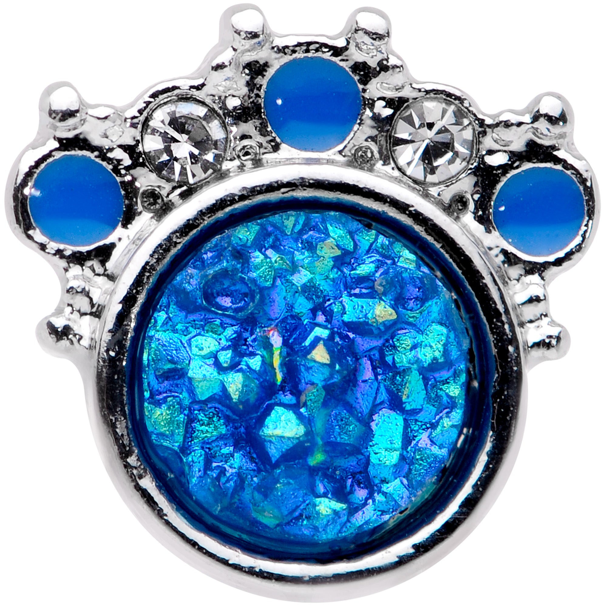 All these circles might leave you feeling a bit dizzy but all these blues won't bring you down at all! This 16 gauge cartilage jewelry is made with a 6mm durable 316L surgical grade stainless steel straight barbell with a 4mm ball end. It features a charm of a large round blue faux druzy with intense color shift when seen under direct light. Above the faux druzy are three blue faux opal rounds which alternate with two clear gems. Even better, this piece works well in multiple piercings including cartilage piercings like the tragus, conch, and helix. These are circles you'll be thrilled to spin in!