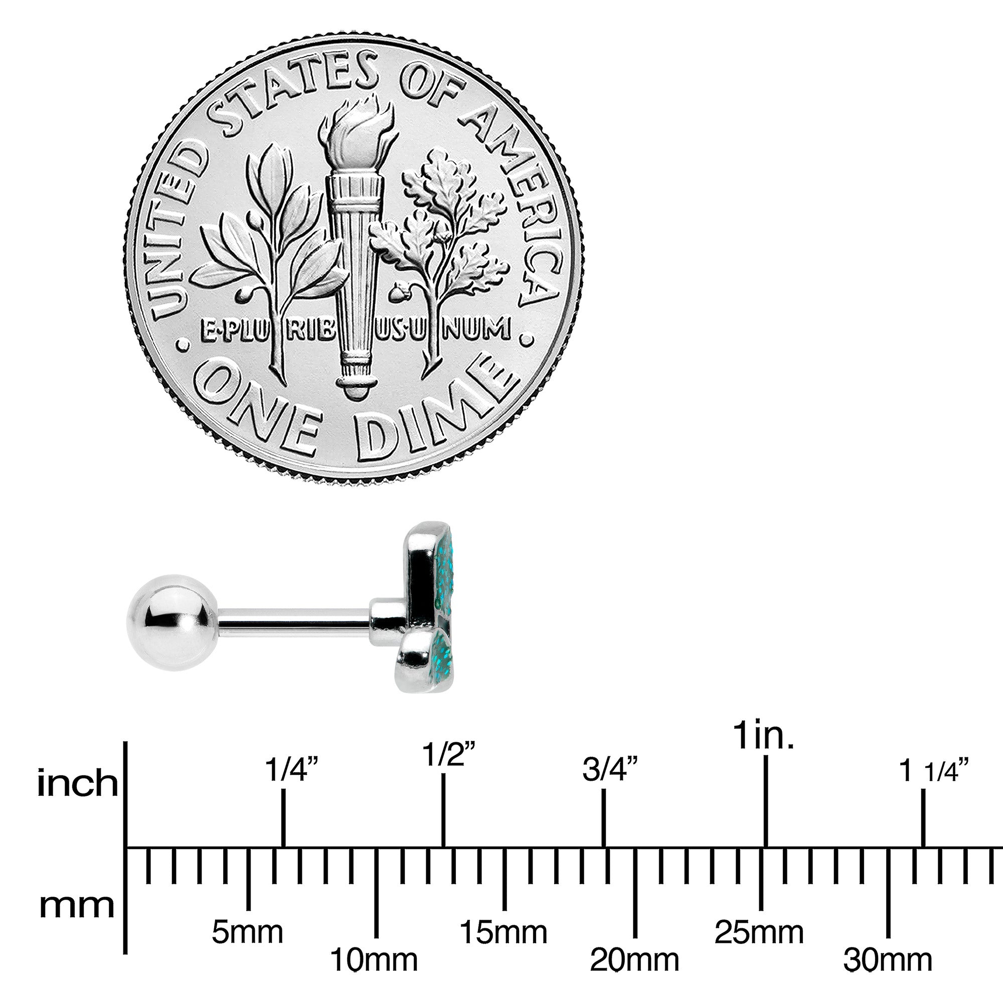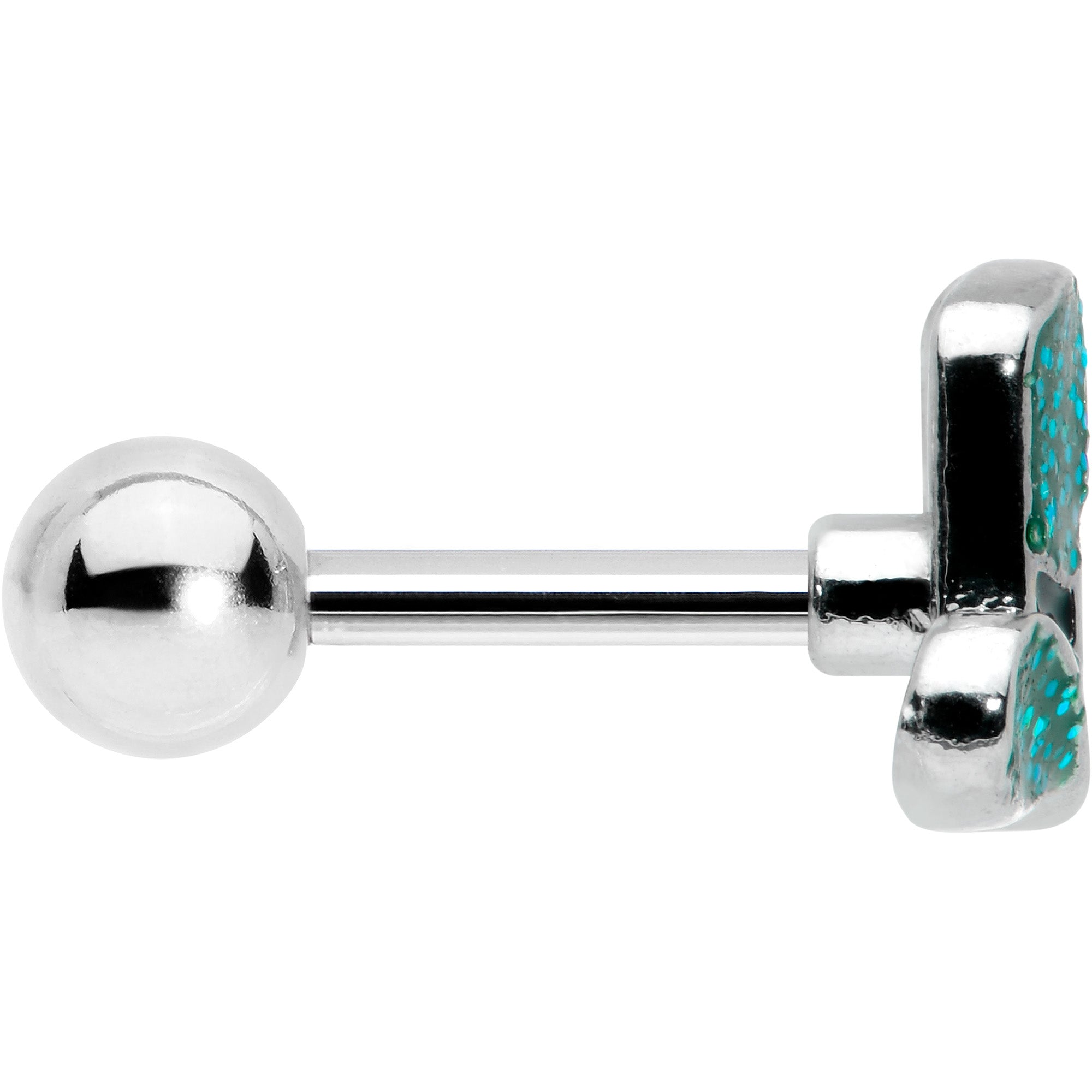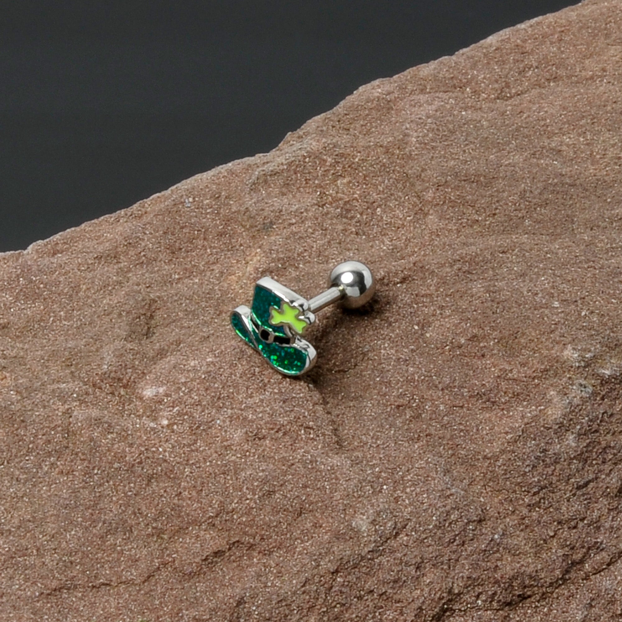Get glitzy with glitter when you're rocking this 16 gauge tragus stud! It's made with a 6mm durable 316L surgical grade stainless steel straight barbell with a 4mm ball end. It features a top hat charm, set with green glitter for a festive appearance. It's embellished with a lighter green shamrock and a black buckle detail and you can even rock it in multiple piercings including tragus, helix, and some conch piercings. Get festive for St Patrick's Day with this glitter top hat cartilage piercing ring!