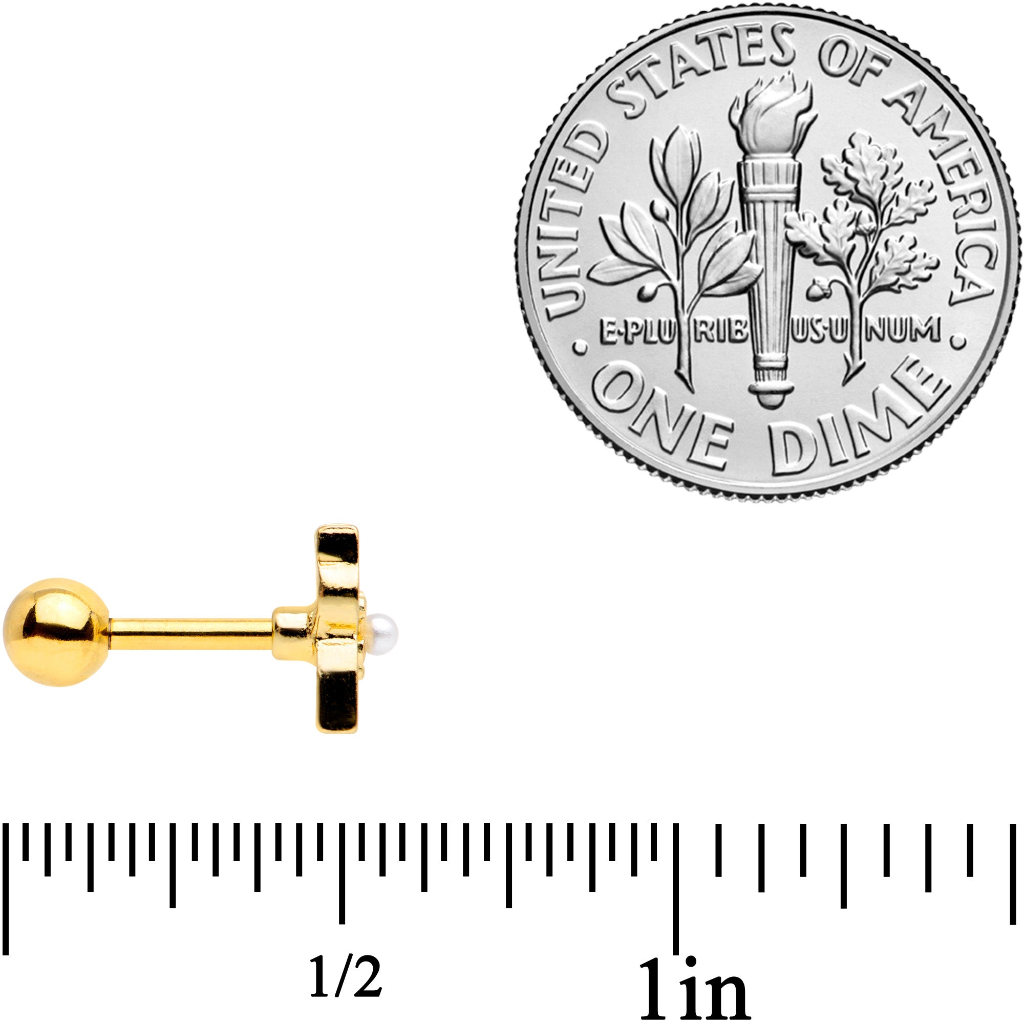 This little kitty is ready for its dinner! This 16 gauge cartilage jewelry is made with a 6mm gold tone PVD over 316L surgical grade stainless steel straight barbell with a 4mm ball end. It features the patient black pussycat charm holding a small white flower with its tail. The flower has a small white orb at the center, adding a charming touch of extra detail. And because kitties have been known to roam, this earring works in multiple cartilage piercings including the tragus, helix and conch. The overall look is upscale, but whimsical and has a subtly retro feel to it. You won't have to fish for compliments when you're wearing this in your tragus stud!