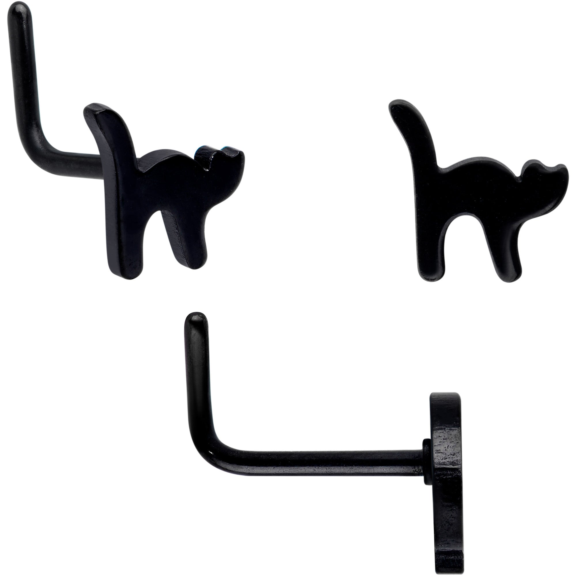 For every look or occasion, this set of 16 gauge lip rings and nose jewelry has your cartilage piercings and your nostril piercing covered this Halloween! The first is made with an 8mm gold tone PVD over 316L surgical grade stainless steel straight barbell with a flat disc end and features an orange jack o' lantern charm that can be worn in the labret, monroe, and cartilage piercings. The second is made with a 6mm black PVD over 316L surgical grade stainless steel straight barbell with a 4mm ball end, features a winged skull charm, and can be worn in the tragus, helix, and some conch piercings. The 20 gauge nostril ring is made with a 6mm length at the bend black PVD over 316L surgical grade stainless steel L-shaped post. It features a black cat charm, in a classic "scaredy-cat" pose. Keep your cartilage piercings and nostril creepy with this stylish set of cartilage jewelry and matching nostril ring! Sold as a set of three.