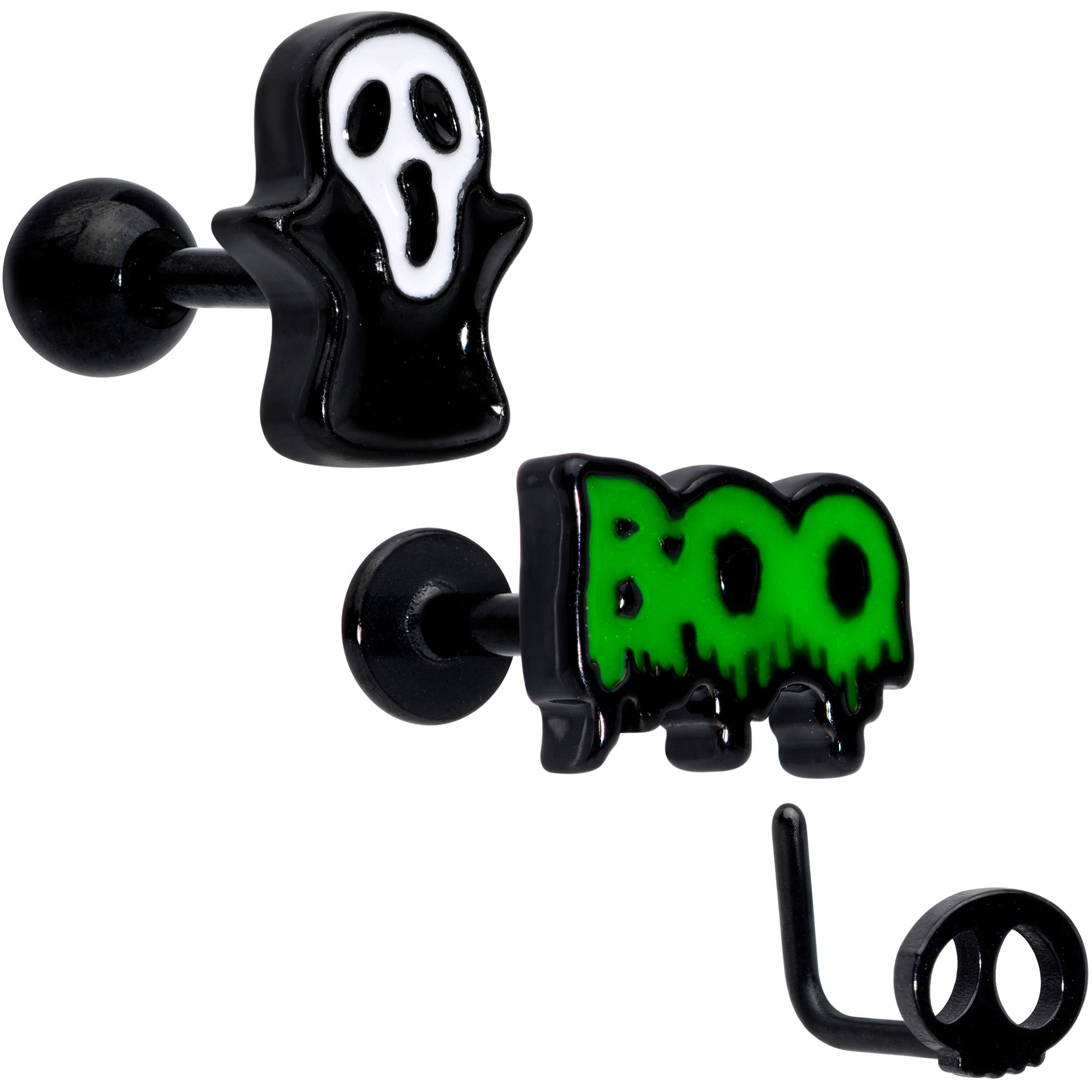 Celebrate Halloween all kinds of ways with this set of creepy body piercing jewelry! The first one is 16 gauge and made with a 6mm black PVD over 316L surgical grade stainless steel straight barbell with a 4mm ball end. It features a creepy screaming ghost charm that can be worn in the tragus, helix, and some conch piercings. The second one is 16 gauge and made with an 8mm black PVD over 316L surgical grade stainless steel straight barbell with a flat disc end, featuring a green charm of the word boo, in a spooky dripping font for added scares that can be worn in cartilage piercings as well as the labret and monroe. The third one is a 20 gauge nostril ring and made with a 6mm length at the bend L-shaped post and features a black skull charm, with cut out features for an eerie and airy appearance. Whether you're wearing one or all three, your piercings will be ready to rock this Halloween! Sold as a set of three.
