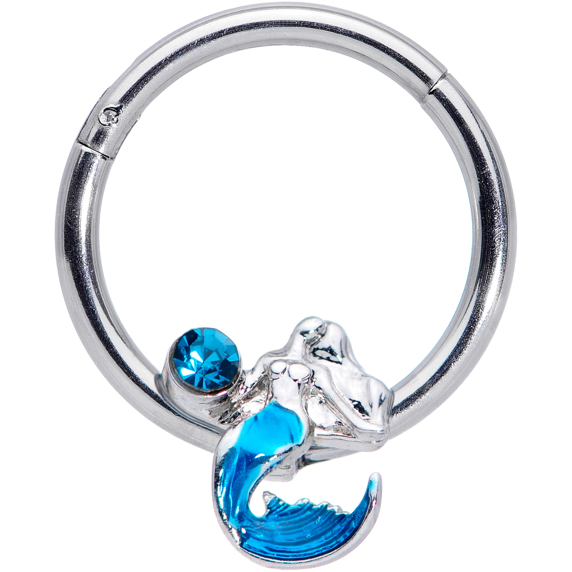 This mermaid has found a treasure that she seems quite fascinated by - like how all eyes will be fascinated by this 16 gauge septum ring! It's made with a 10mm durable 316L surgical grade stainless steel hinged circular ring. It features a mermaid charm, gazing intently into an aqua color gem and the edge of her tail in pale blue. It also features a non-removable, hinged segment and you can wear this lovely lady in multiple piercings including septum, tragus, and helix piercings! This is one cartilage ring that will be the treasure of your jewelry wardrobe!