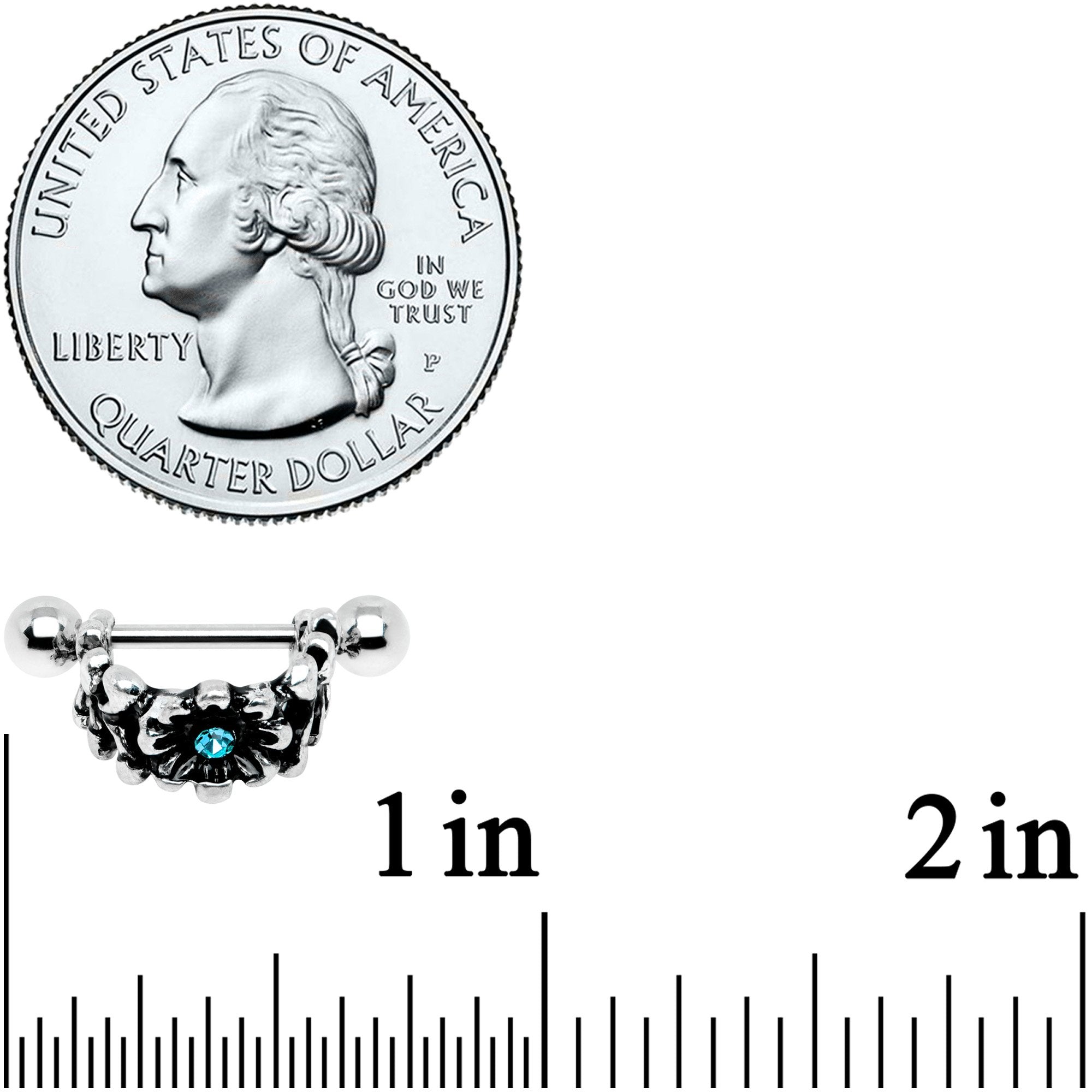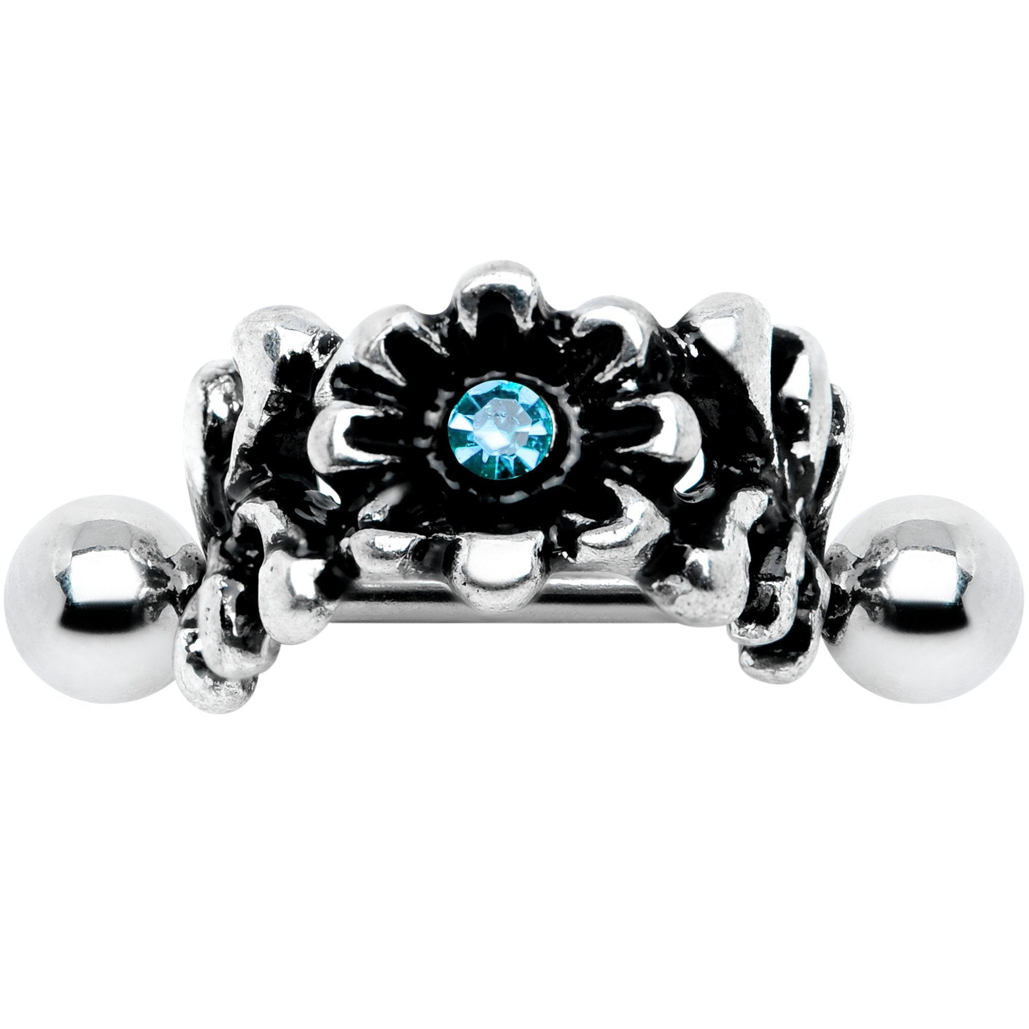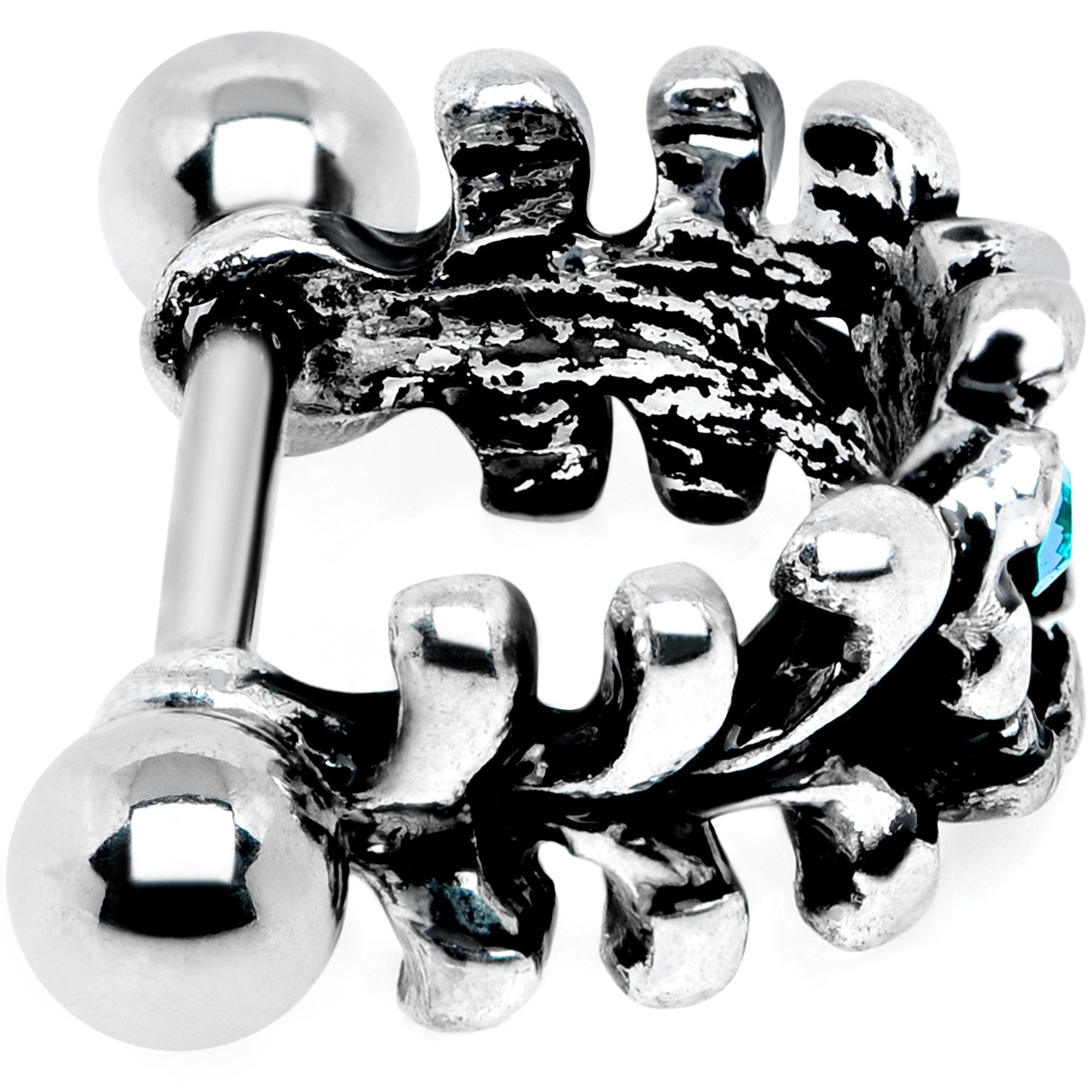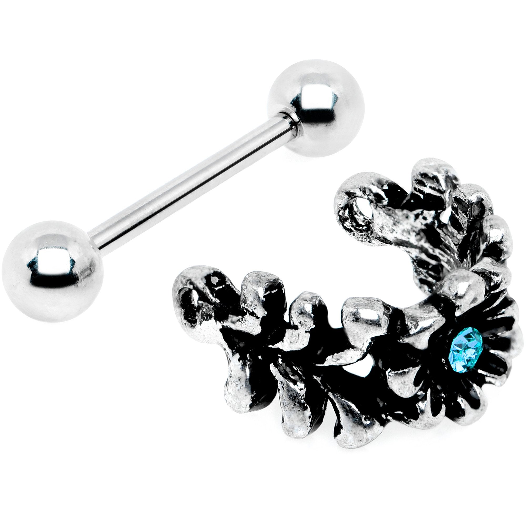 Now you can wrap yourself in flowers and never need to worry about watering them! This 16 gauge helix cuff is made of a 10mm durable 316L surgical grade stainless steel straight barbell. It features a cuff made of a design of leaves with a centerpiece of a beautifully crafted flower that has an aqua gem at the very heart of it. And while you have the option of removing the cuff portion if you so desire, you're going to want to watch this flower bloom all year long.