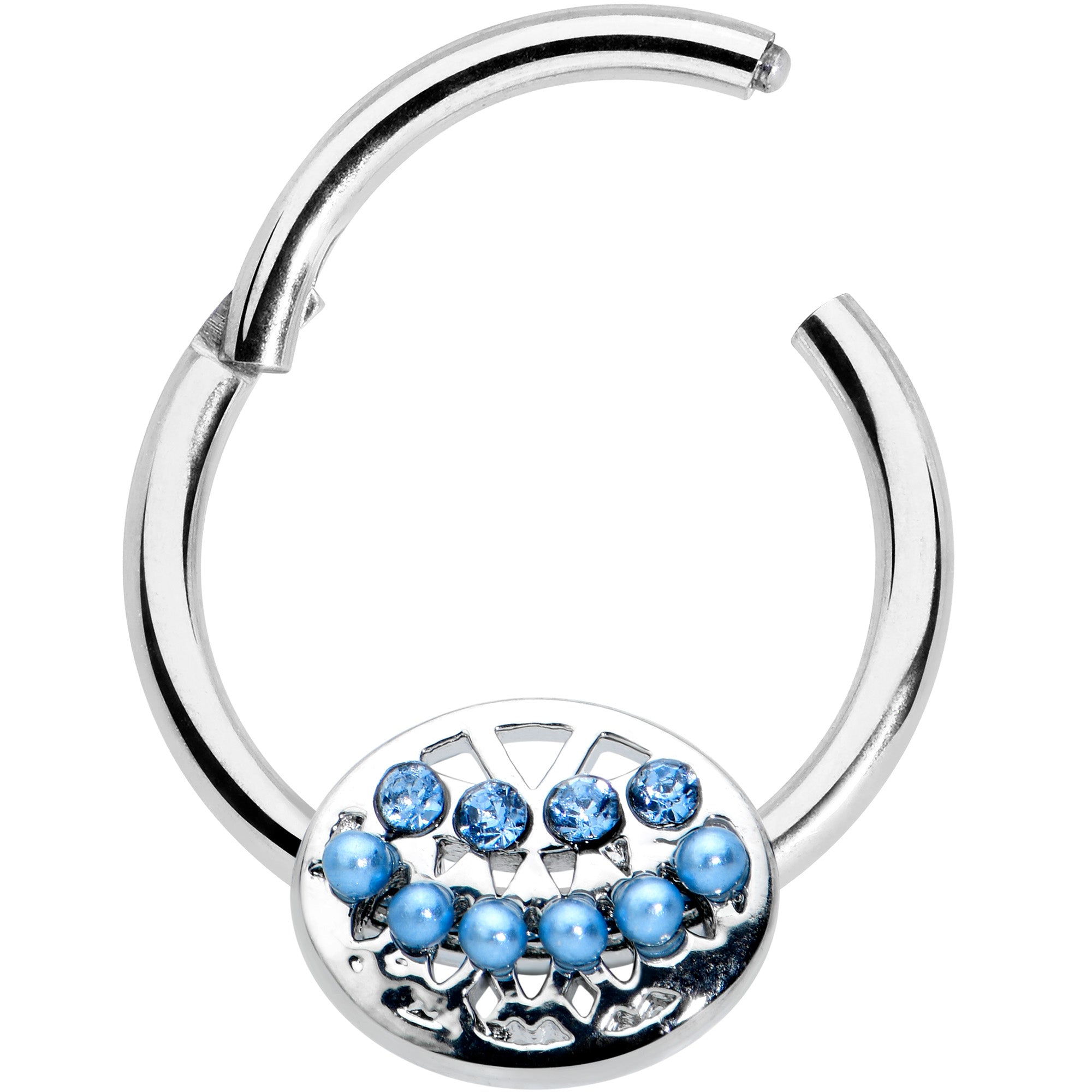 Even if you don't like math, you can't help but love this 16 gauge geometrically-themed septum ring! It's made with a 10mm durable 316L surgical grade stainless steel hinged circular ring. It features a circular charm with a geometric pattern of angles and lines. It's further embellished with tiny blue gems and blue pearlescent orbs for a cohesive appearance. It also features a hinged, non-removable segment that makes insertion and removal a breeze. You can even rock it in multiple piercings including tragus, helix, and some daith piercings. You can toss your slide rule and compass, this geometry-themed cartilage ring is working all the angles!