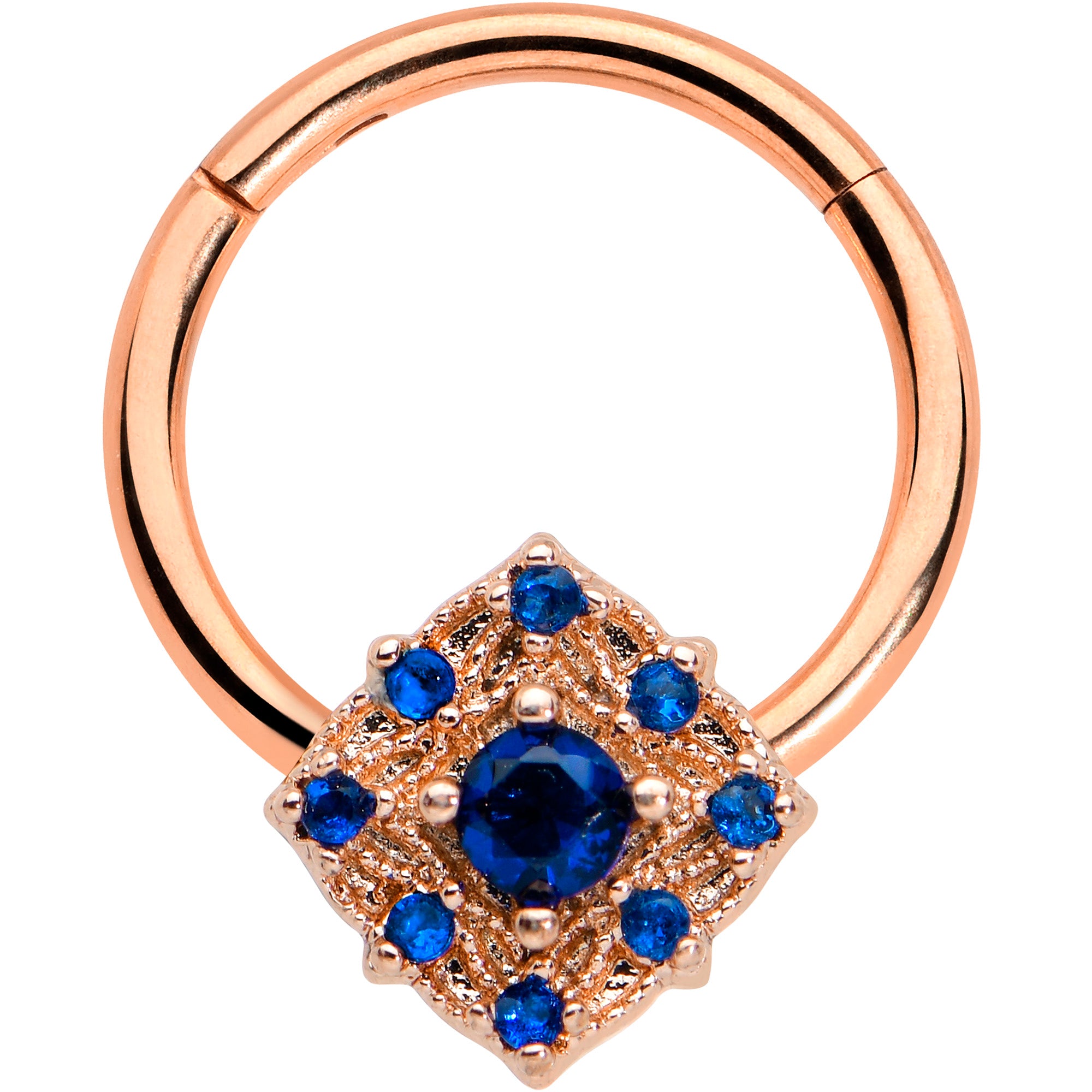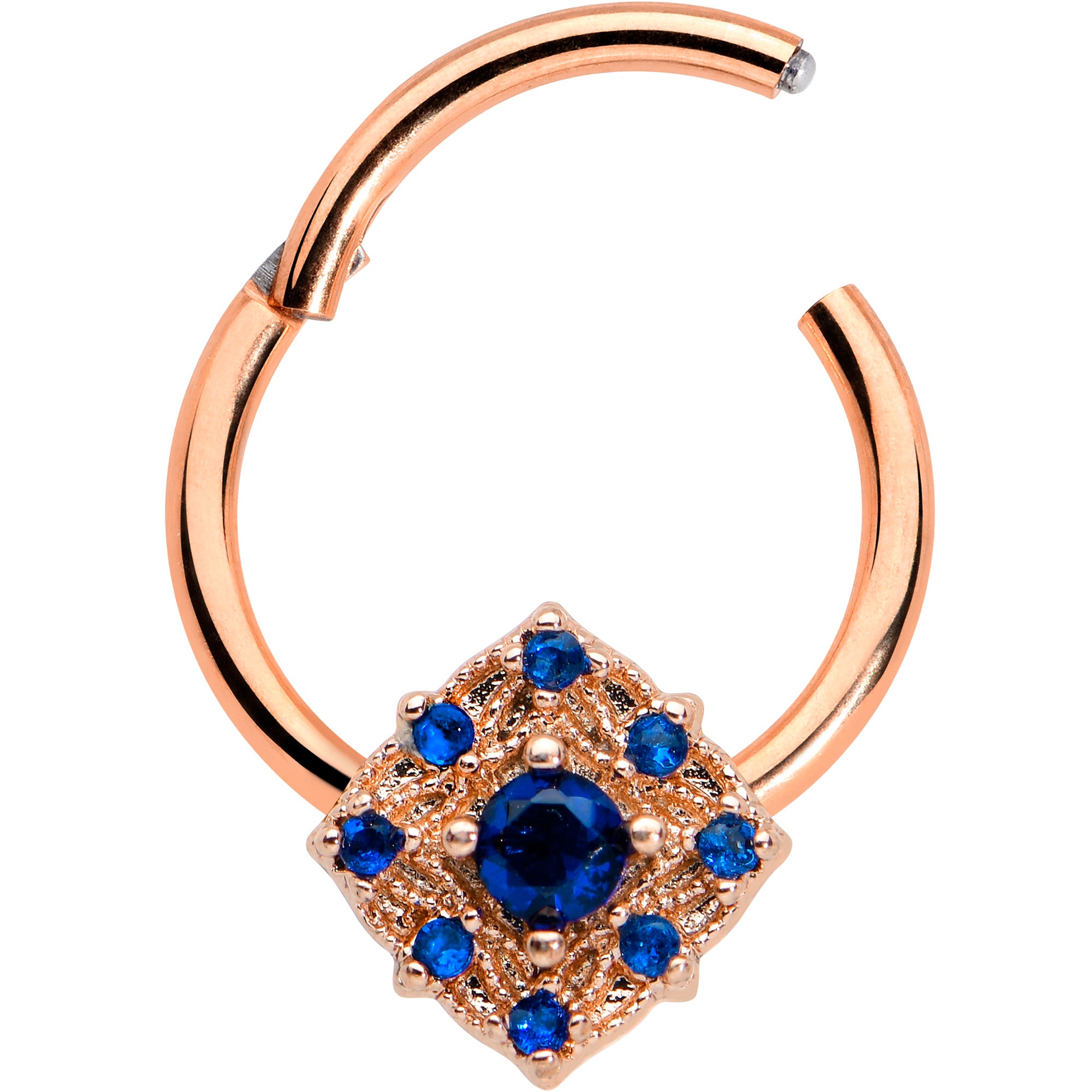 Get a look as hypnotic as the evening stars with this 16 gauge septum ring! It's made with a 10mm rose gold tone PVD over 316L surgical grade stainless steel hinged circular ring. It features a star charm, with textured detailing. The star is set with deep blue gems along the edges and has a matching blue gem at the center for a rich, colorful appearance. It also features a non-removable, hinged segment that makes insertion and removal a breeze and you can wear it in multiple piercings including tragus, helix, and some daith piercings. You're going to be a star when you're rocking this elegant cartilage piercing jewelry!