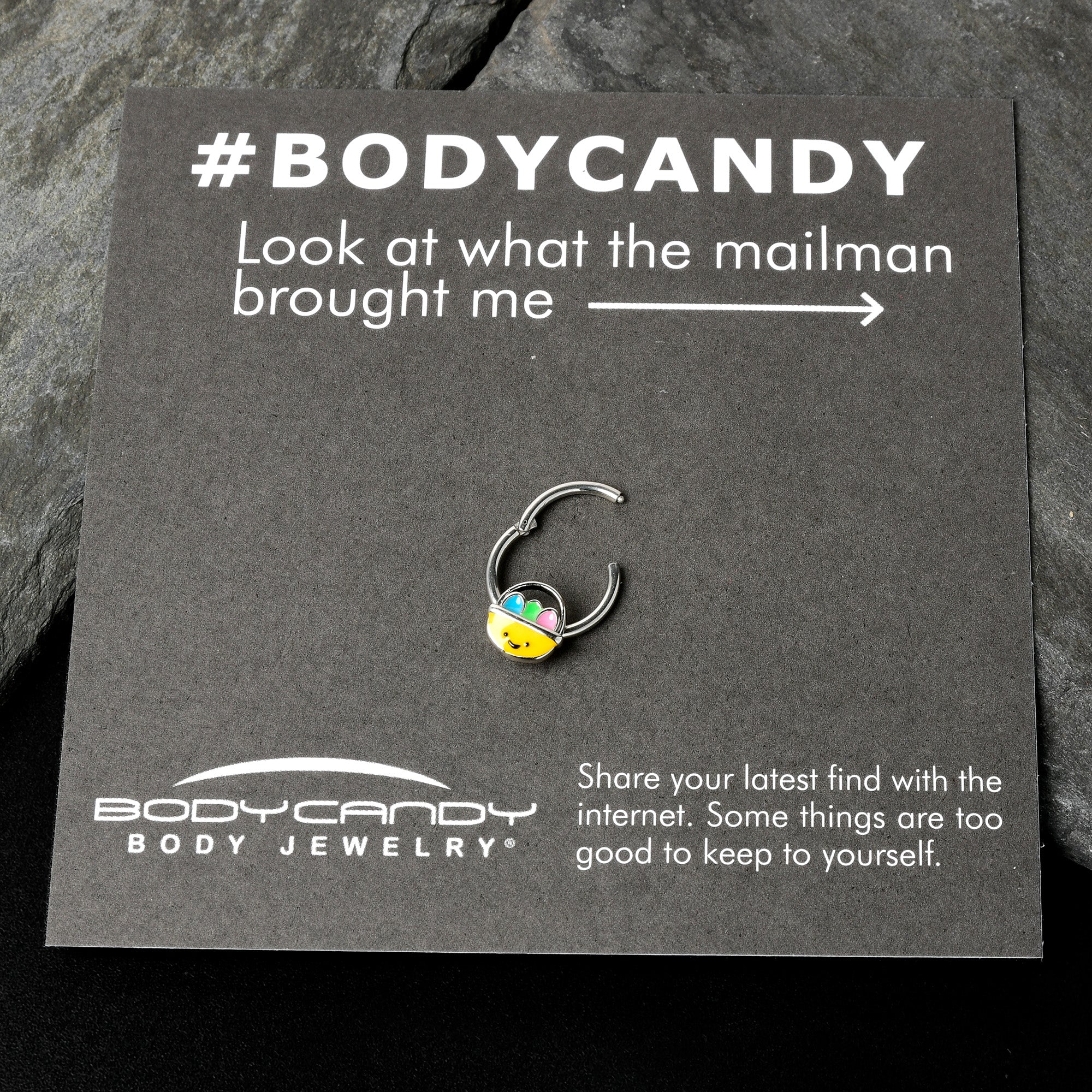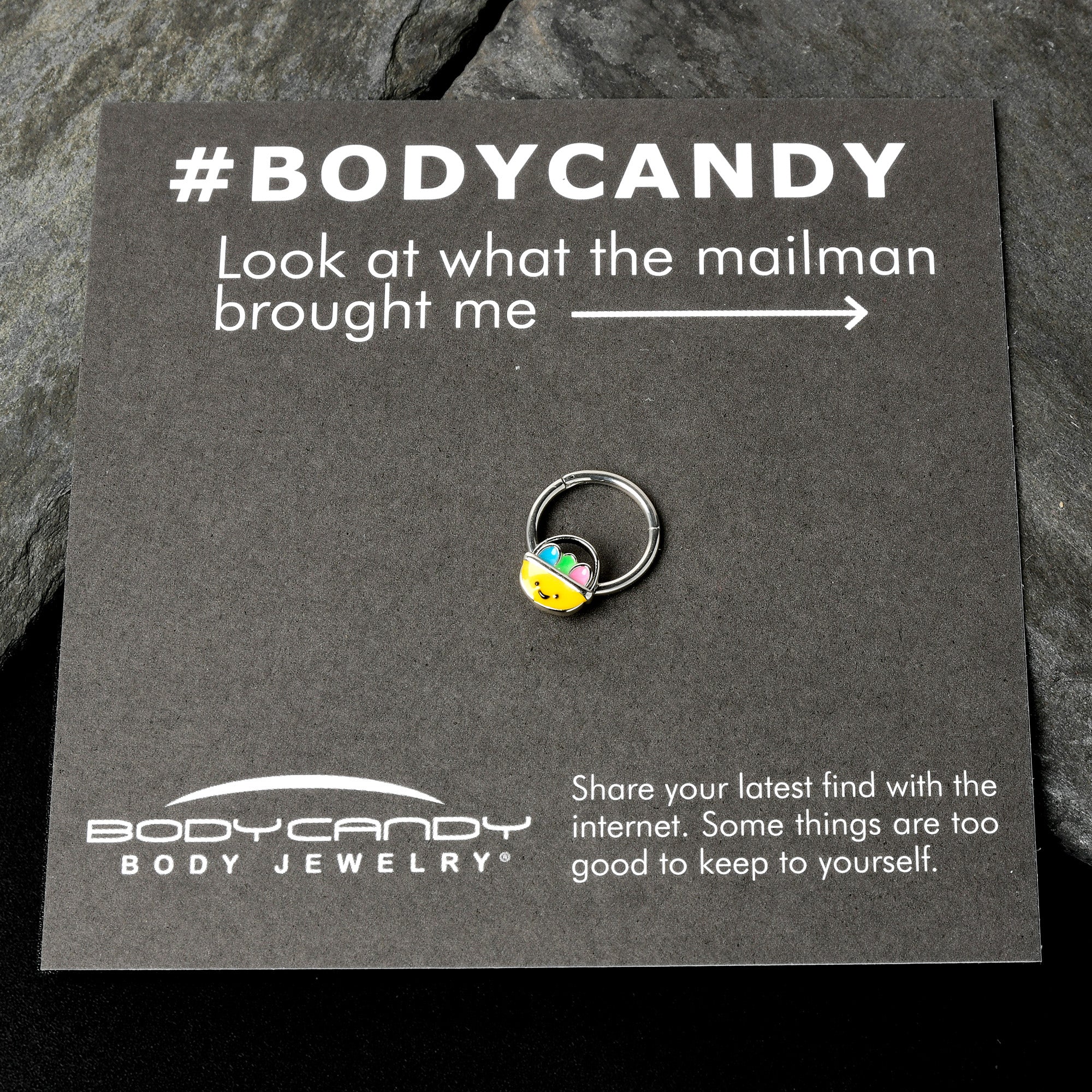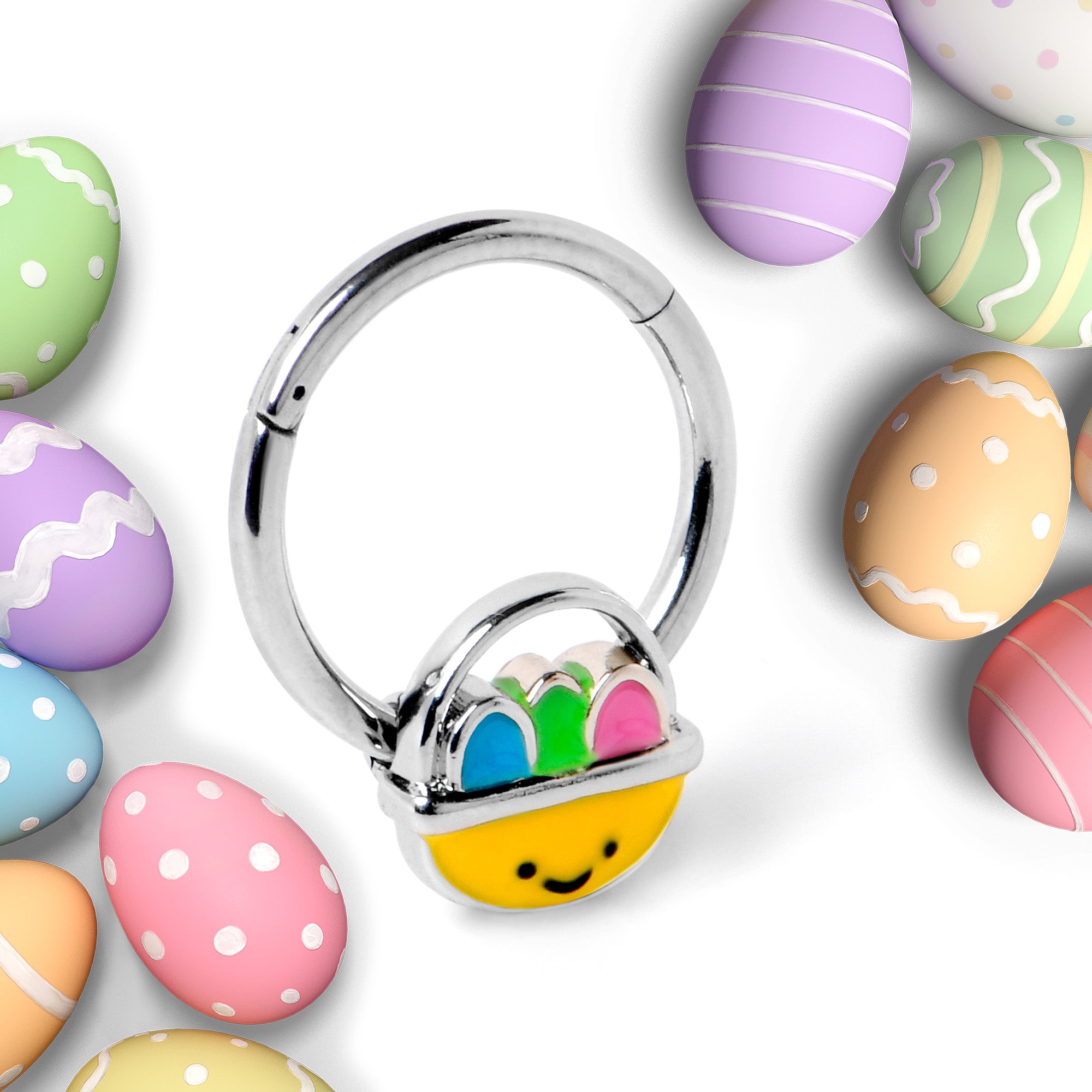 Put all your eggs in one basket with style when you're rocking this 16 gauge septum ring! It's made with a 10mm durable 316L surgical grade stainless steel hinged circular ring. It features a yellow Easter basket charm, with a cheery smiling face. The basket contains Easter eggs in pink, green, and blue, for an added touch of festive color. It also features a non-removable, hinged segment and you can rock it in multiple piercings including tragus, helix, and some daith piercings. You'll be hopping down the bunny trail in kawaii style with this Easter themed cartilage piercing jewelry!