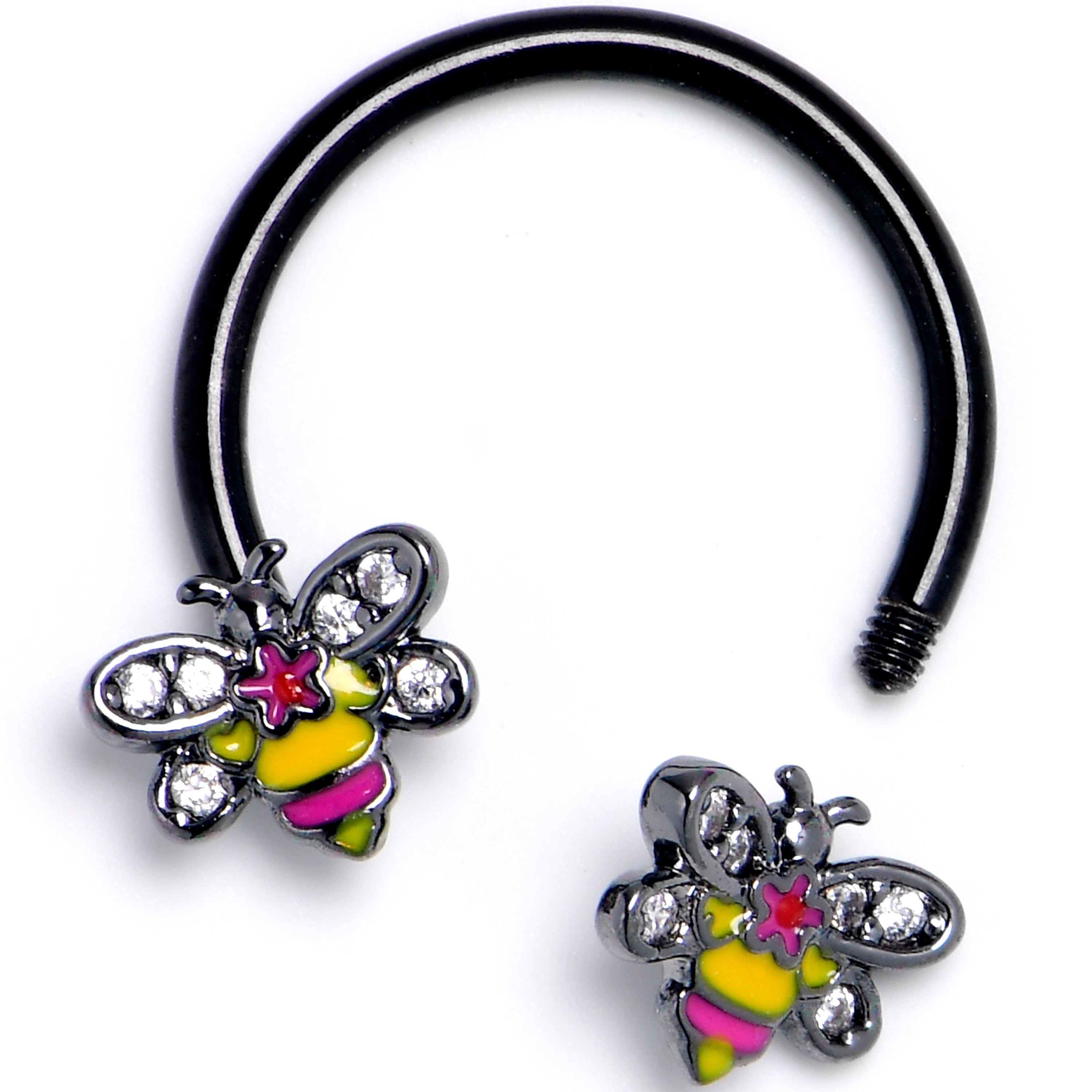You'll be all a-buzz when you're rocking this 16 gauge septum ring. It's made with a 10mm black PVD over 316L surgical grade stainless steel circular barbell. Each of the ends features a bee charm, with clear cubic zirconia gems in their wings and hot pink and yellow stripes on their bodies. You can even rock these bees in multiple piercings including helix, conch, and some daith piercings. Get a bee-utiful look with this crazily colorful cartilage piercing jewelry.