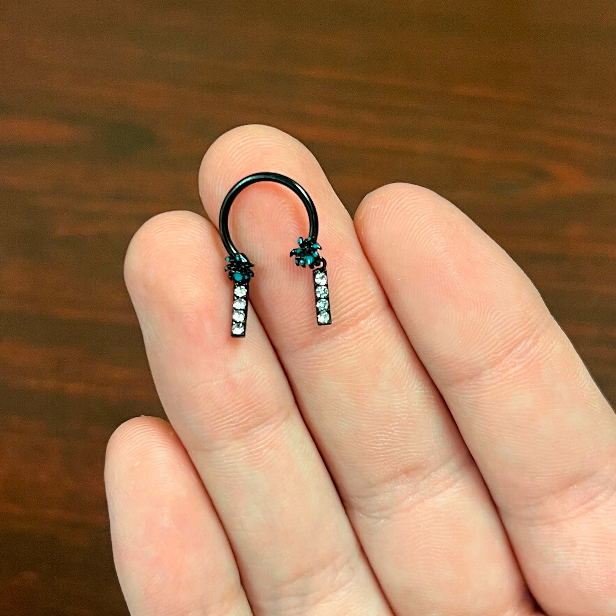 It's like a night in the tropics when you rock this 16 gauge septum ring! It's made with a 10mm black PVD over 316L surgical grade stainless steel circular barbell. Each of the ends features a palm tree charm. The trees have green embellishment on the leaves and clear gems set into the dangling trunks for a truly stylish look. You can even rock it in multiple piercings including tragus, helix, and daith piercings! Feel free to leave your sunscreen at home with this tropical evening palm tree tragus piercing jewelry!
