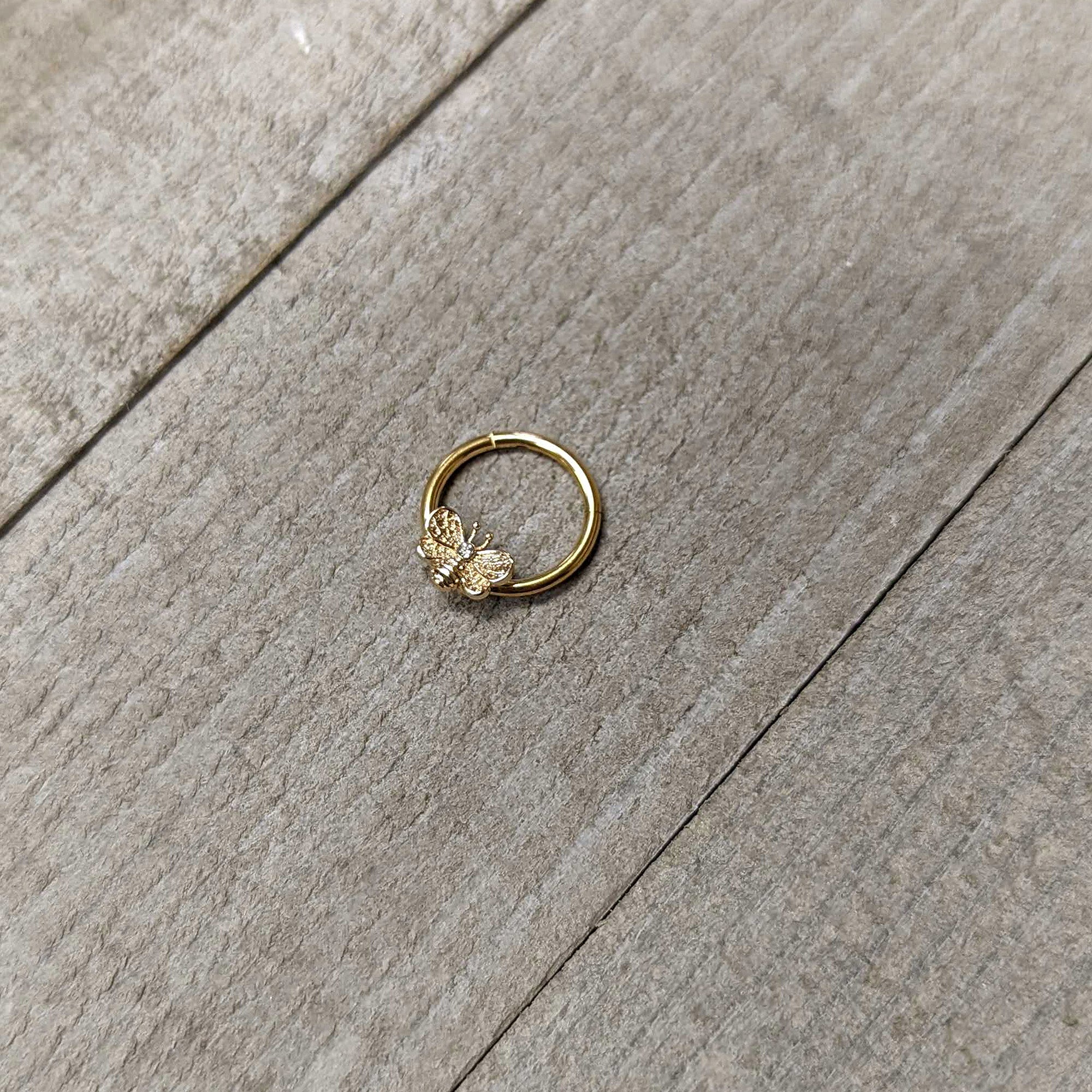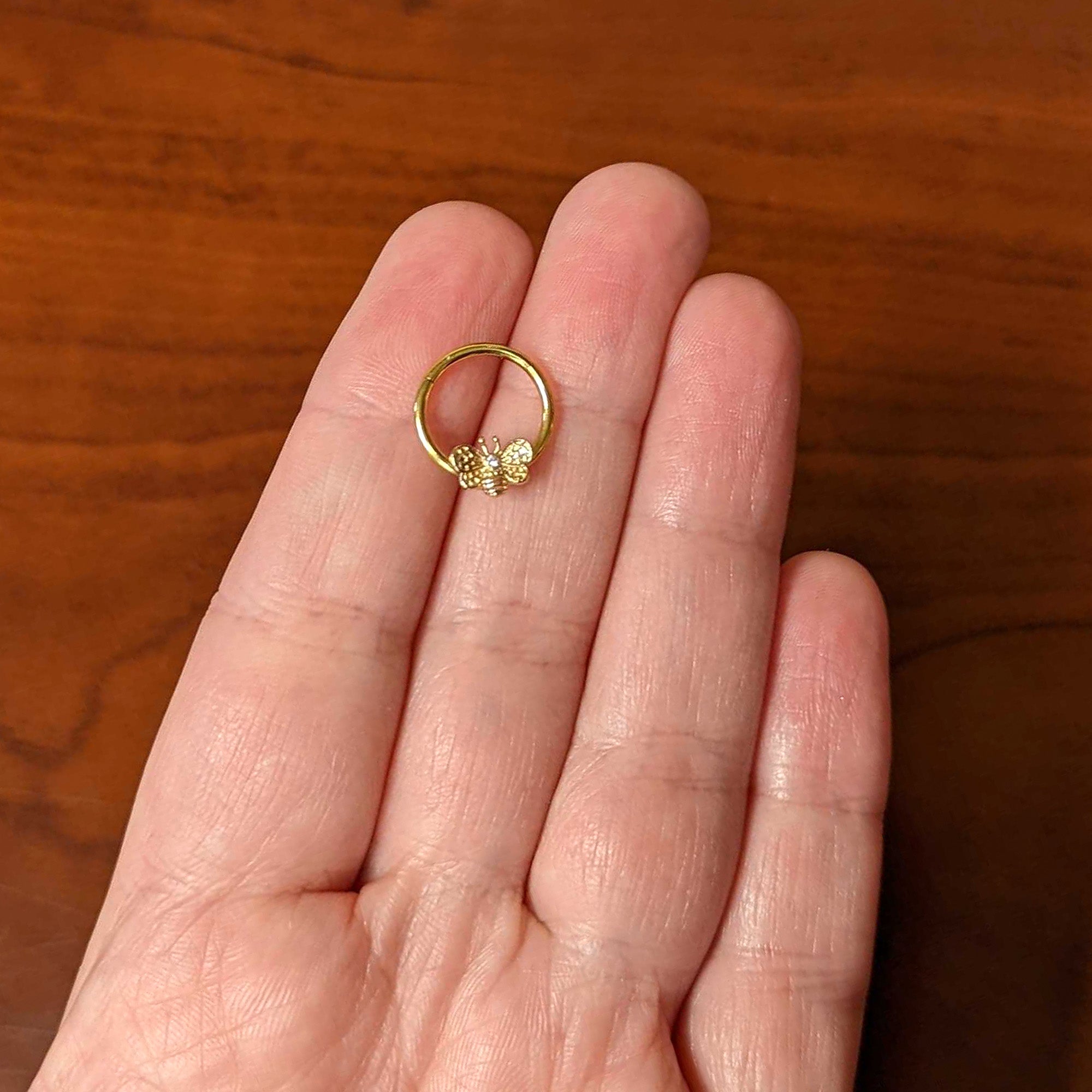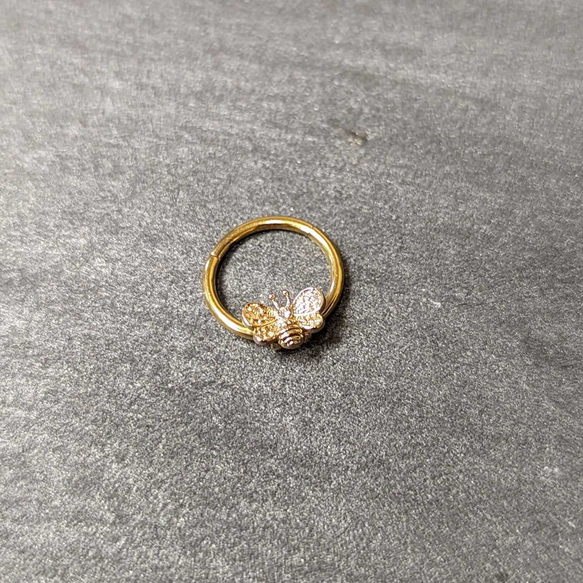 This 16 gauge septum ring is sure to bee-utify your cartilage piercings! It's made with a 10mm gold tone PVD over 316L surgical grade stainless steel hinged circular ring. It features a bee charm with understated detailing, embellished with a tiny clear gem set at the head. The bee also features openwork wings for a cohesive and airy appearance. It also features a hinged, non-removable segment that makes insertion and removal a breeze! You can even boast this bee in multiple piercings including tragus, helix, and some daith piercings. This understated insect jewelry is sure to bee your favorite tragus piercing ring!