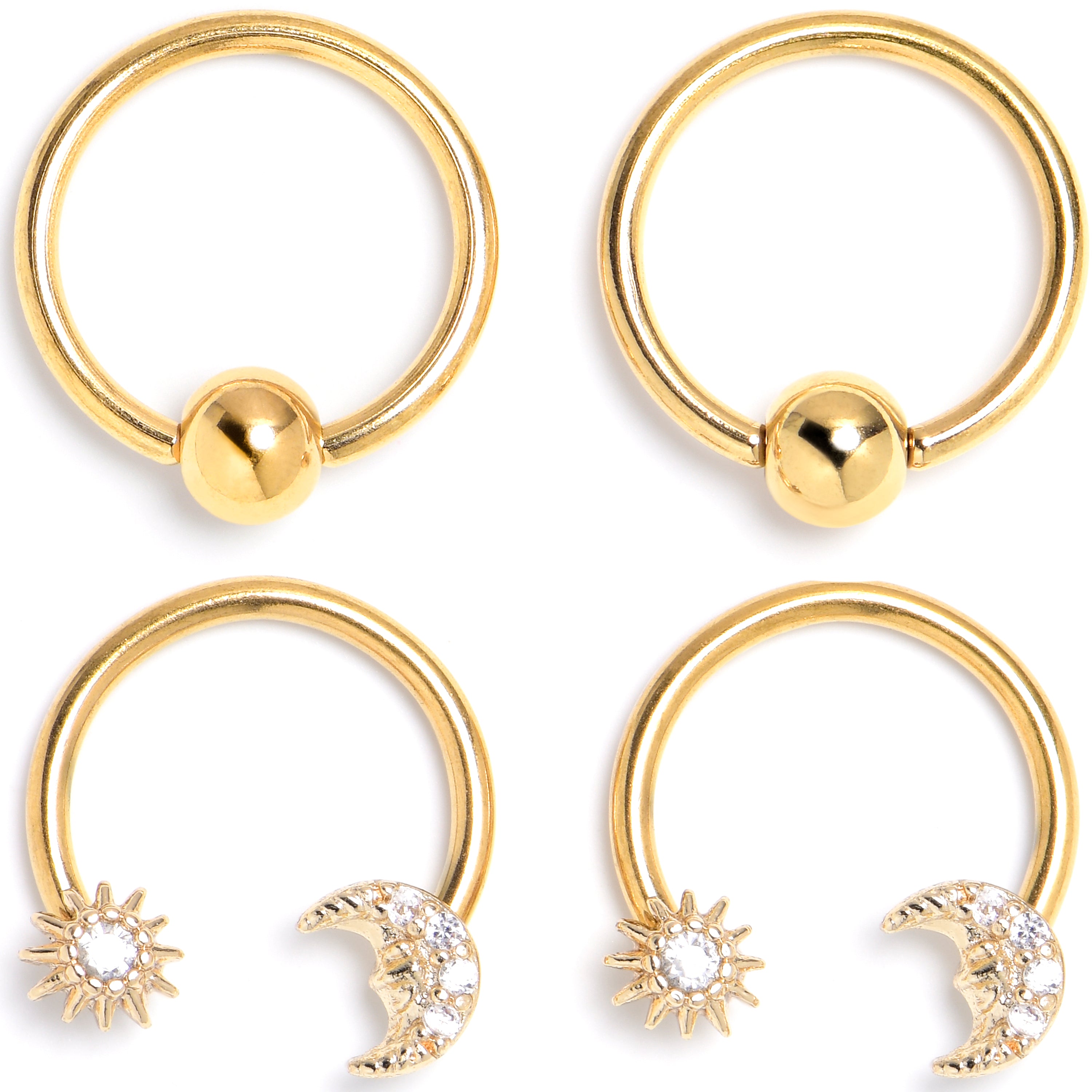 Whether you have a lot of piercings or like a cohesive look, this set of 16 gauge septum rings has you covered. Two are made with 10mm gold tone anodized over 316L surgical grade stainless steel circular rings. They have simple matching captive beads for a classic appearance. The other two are made with 10mm gold tone anodized over 316L surgical grade stainless steel circular barbells. One of the ends features a crescent moon charm, set with clear gems while the other features a sun charm set with a matching clear gem. You can even rock these in multiple piercings including helix, daith, and some conch piercings. You will be ready for anything with this celestial themed cartilage piercing jewelry. Sold as a set of four.