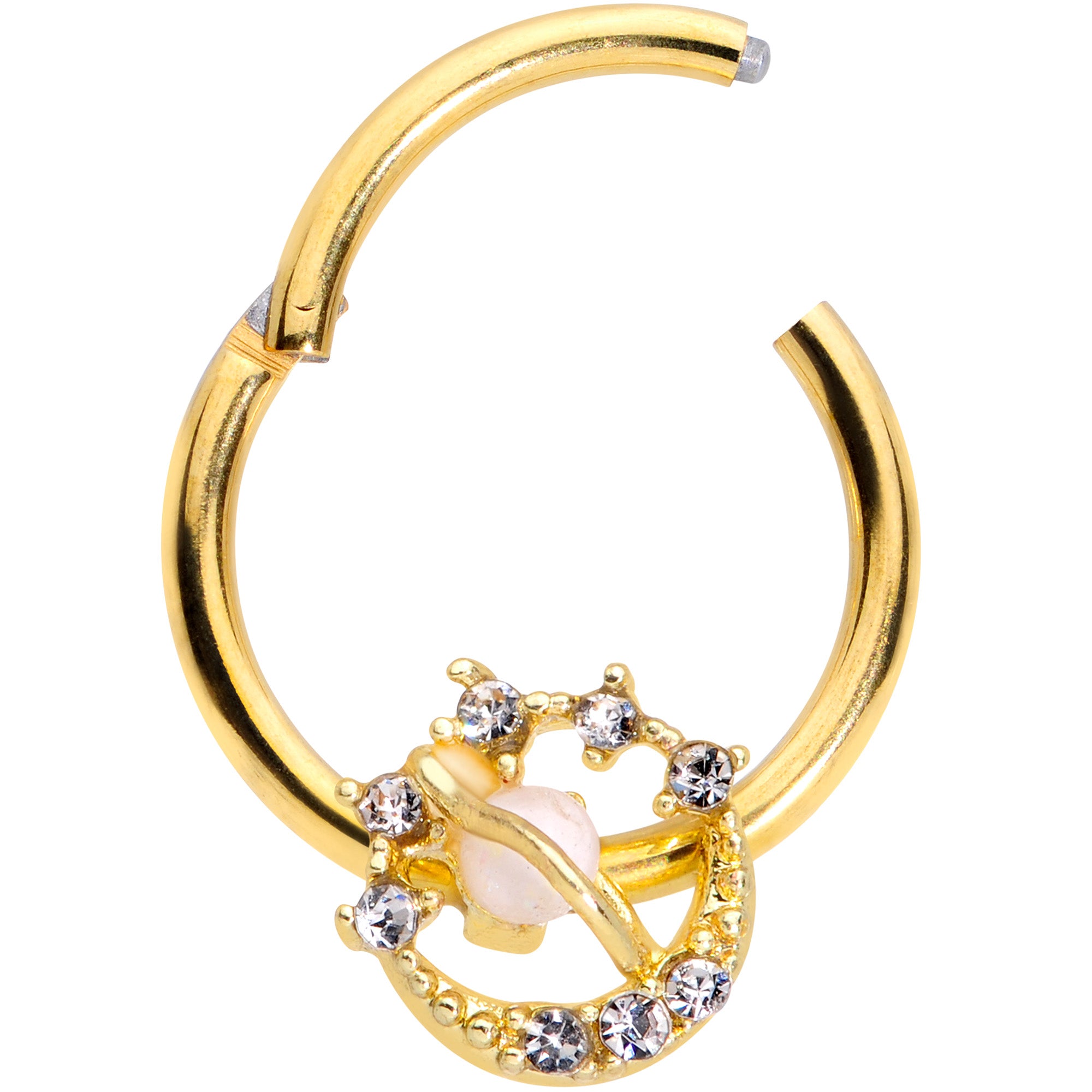 Instead of gazing at the stars, make your navel piercing a star with this 16 gauge cartilage jewelry! It's made with a 10mm gold tone PVD over 316L surgical grade stainless steel hinged circular ring. It features a charm of an ornate crescent moon charm with trails of stars. Inside the lower curve of the moon is the planet Saturn, composed of a single white faux opal. It also features a non-removable, hinged segment that makes insertion and removal a snap and can be worn in multiple piercings including the septum as well as cartilage piercings like the tragus and helix. Let the entire night sky glam up your cartilage piercing with this palatial planetary tragus ring!