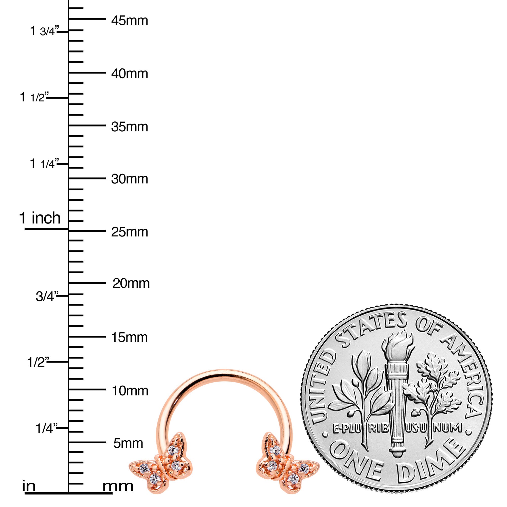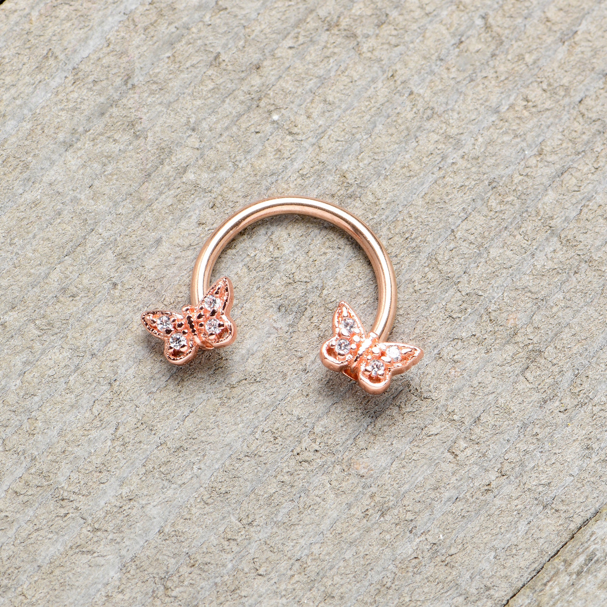 The butterfly on this 16 gauge septum ring will make you want to go for baroque! It's made with a 10mm rose gold tone PVD over 316L surgical grade stainless steel circular barbell. Each of the ends features a butterfly charm, with openwork wings for an airy feel. The butterflies are further embellished with clear gems for an ornate appearance and you can even rock them in multiple piercings such as tragus, helix, and some daith piercings. This rococo butterfly cartilage piercing jewelry will make you want to fly!