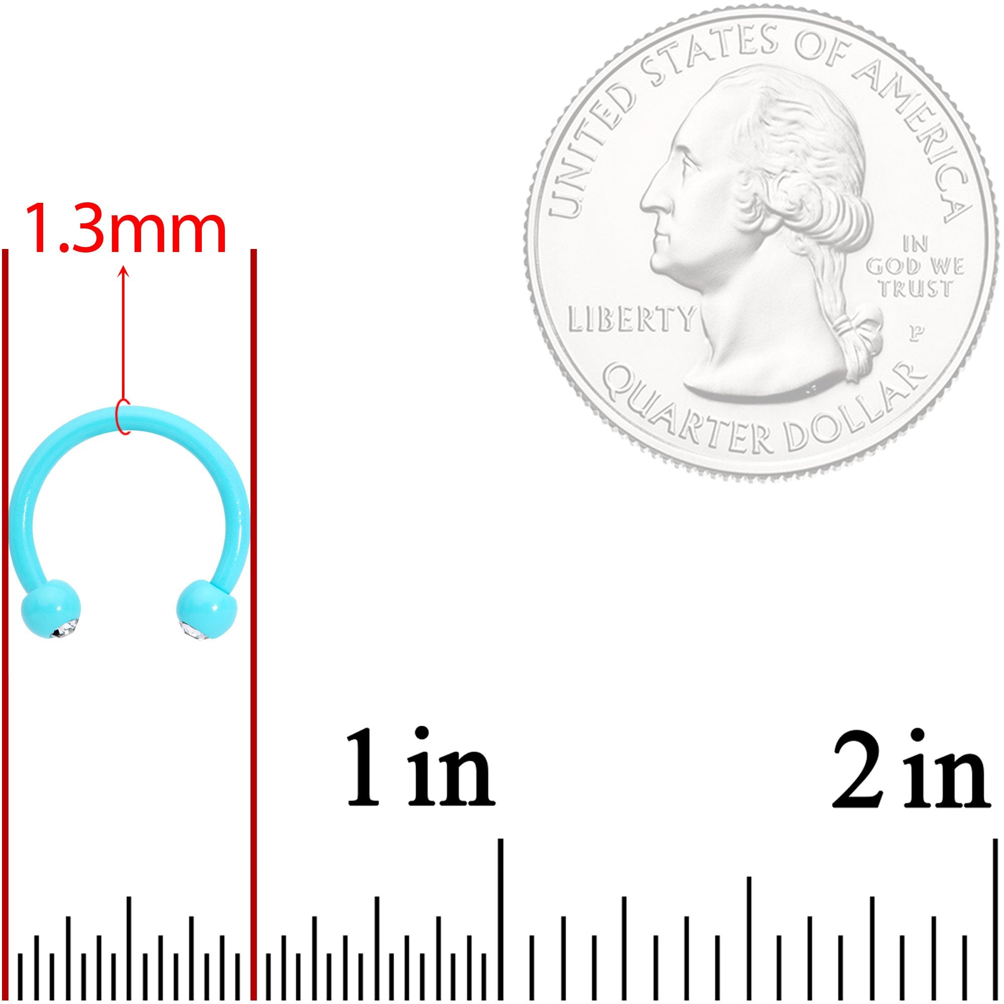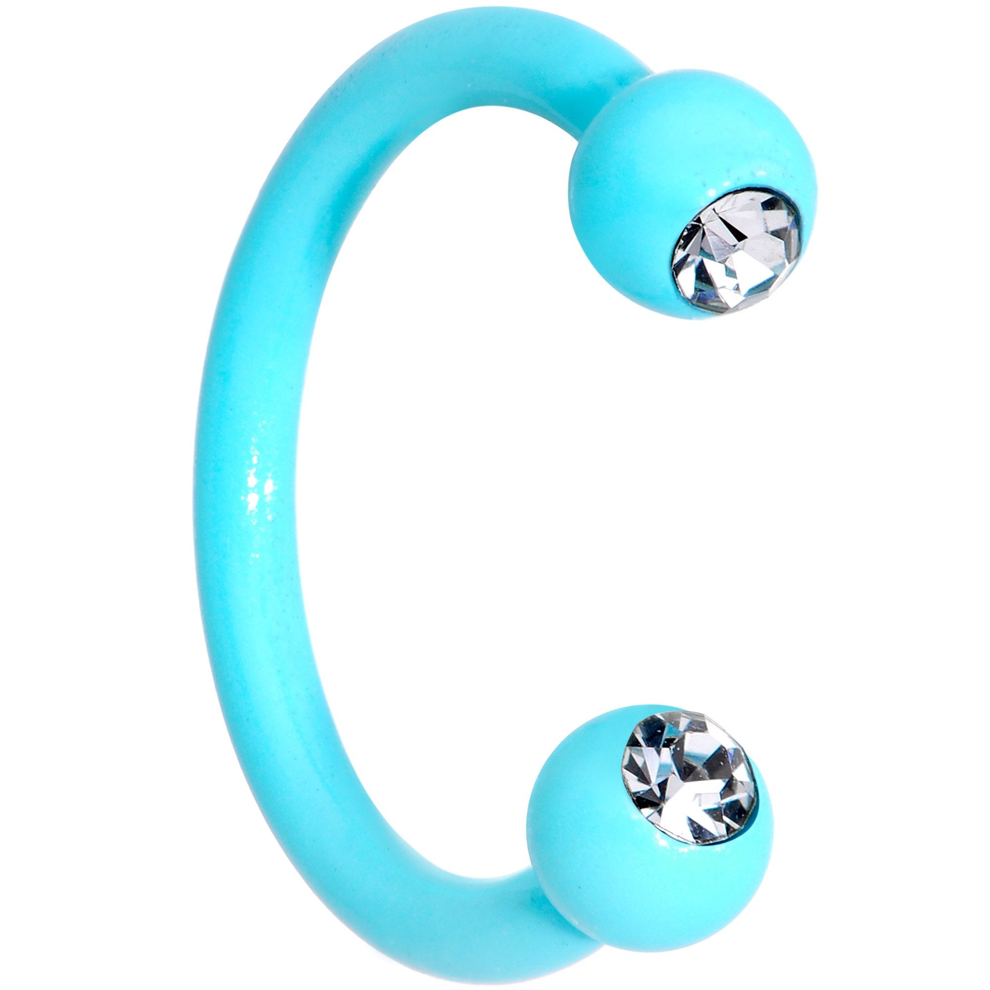 Ready for an illuminated blast of color? Then this vibrant horseshoe barbell ring is perfect for you because it's popping with a pretty teal burst of color and it features a glow in the dark effect! This 16 gauge horseshoe ring is made with a 3/8" teal plated over 316L surgical grade stainless steel curved barbell complete with front-facing clear gems for an extra bit of bling. This horseshoe jewelry can be worn in a variety of piercings and will always look fashion-forward. Collect each color today!