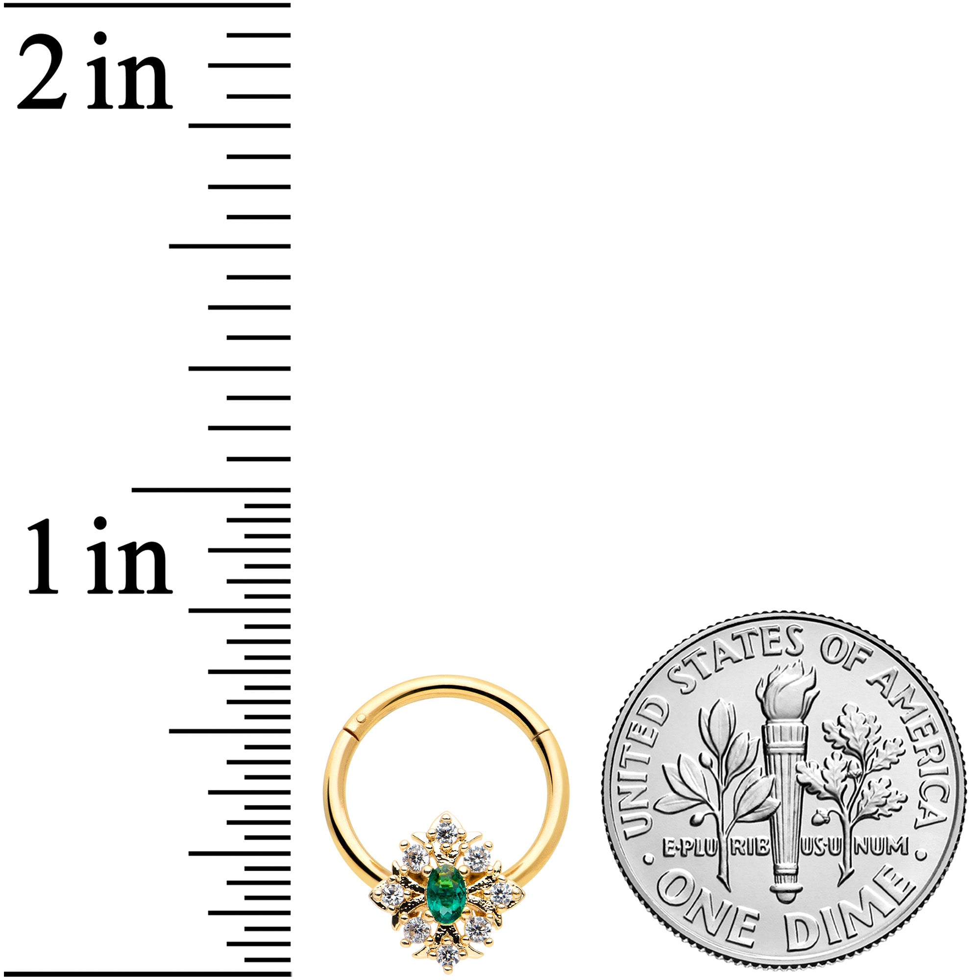 Take your cartilage piercings back in time with this antique-inspired 16 gauge septum ring! It's made with a 10mm gold tone PVD over 316L surgical grade stainless steel hinged circular ring. It features a large, oval green gem charm, set in a stylized rhombus that's embellished with clear gems for an elegantly retro appearance. It also features a hinged, non-removable segment that makes insertion and removal a snap. You can even rock this rhombus in multiple piercings including tragus, helix, and septum piercings. Give an antique-inspired look to a modern piercing with this Art Deco styled cartilage jewelry