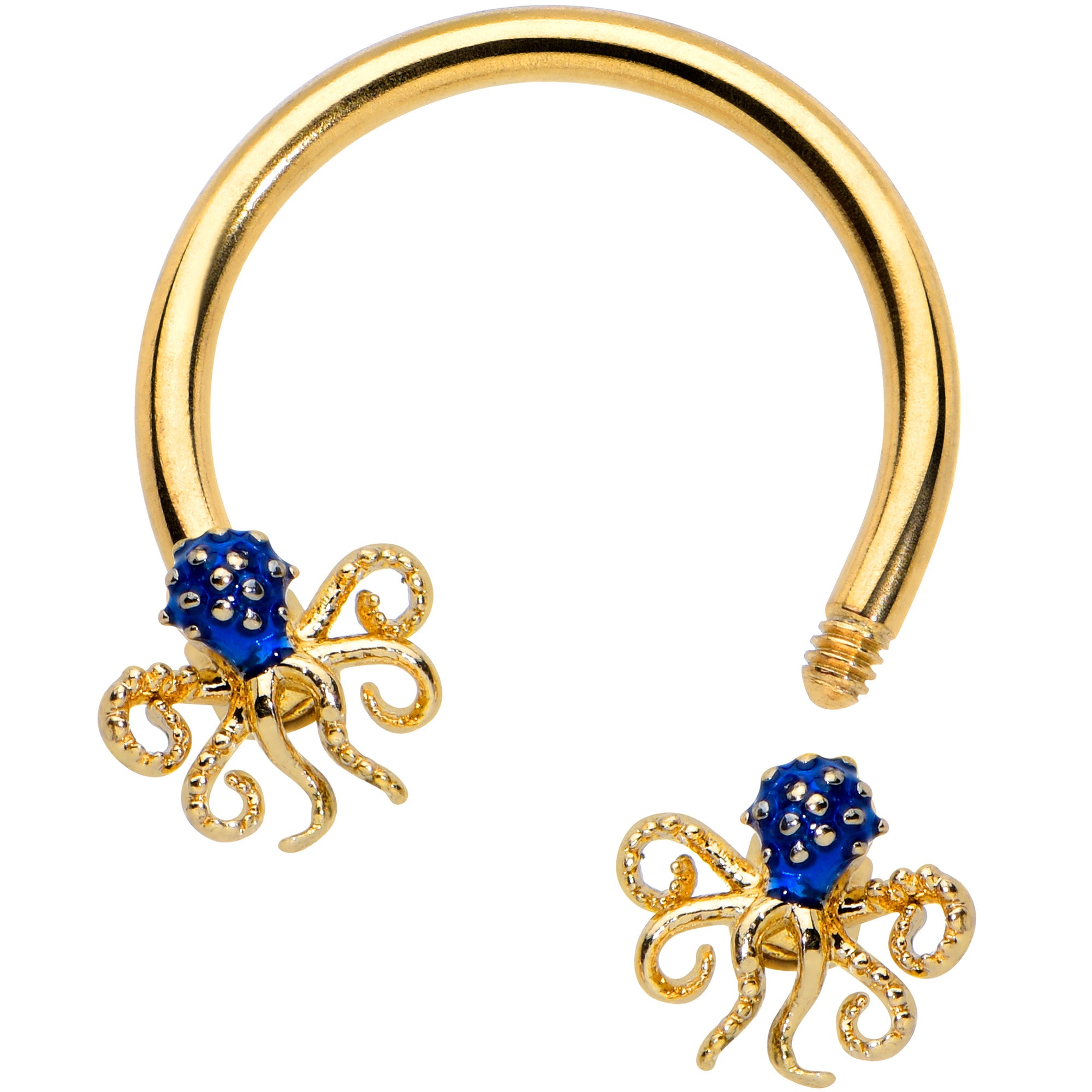 16G 3/8 Gold Tone Blue Octopus Ends Horseshoe Circular Barbell