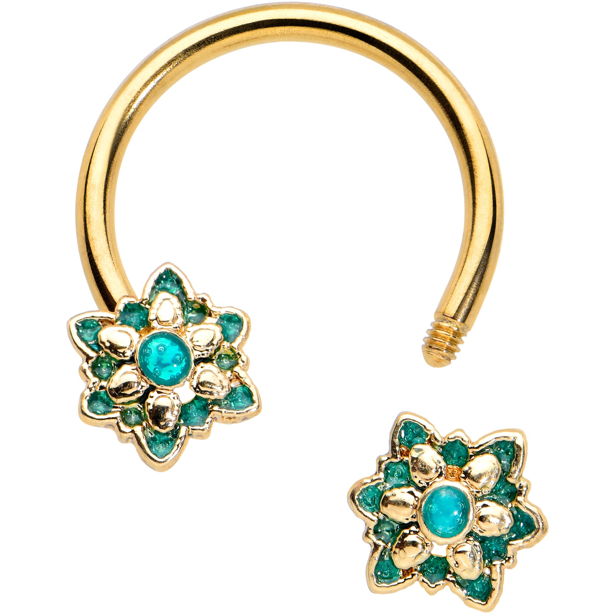 The snowflakes on this 16 gauge helix ring is sure to absolutely melt your heart! It's made with a 10mm gold tone PVD over 316L surgical grade stainless steel circular barbell.Each of the ends features an intricate snowflake charm set with blue inlay as well as a matching blue orb at the center for a luscious touch of color you'll totally fall for! You can even rock this jewelry in multiple piercings including tragus, helix, and some daith piercings! This winter, let the snow spruce up your cartilage piercing with this sweet and snowy cartilage piercing jewelry!