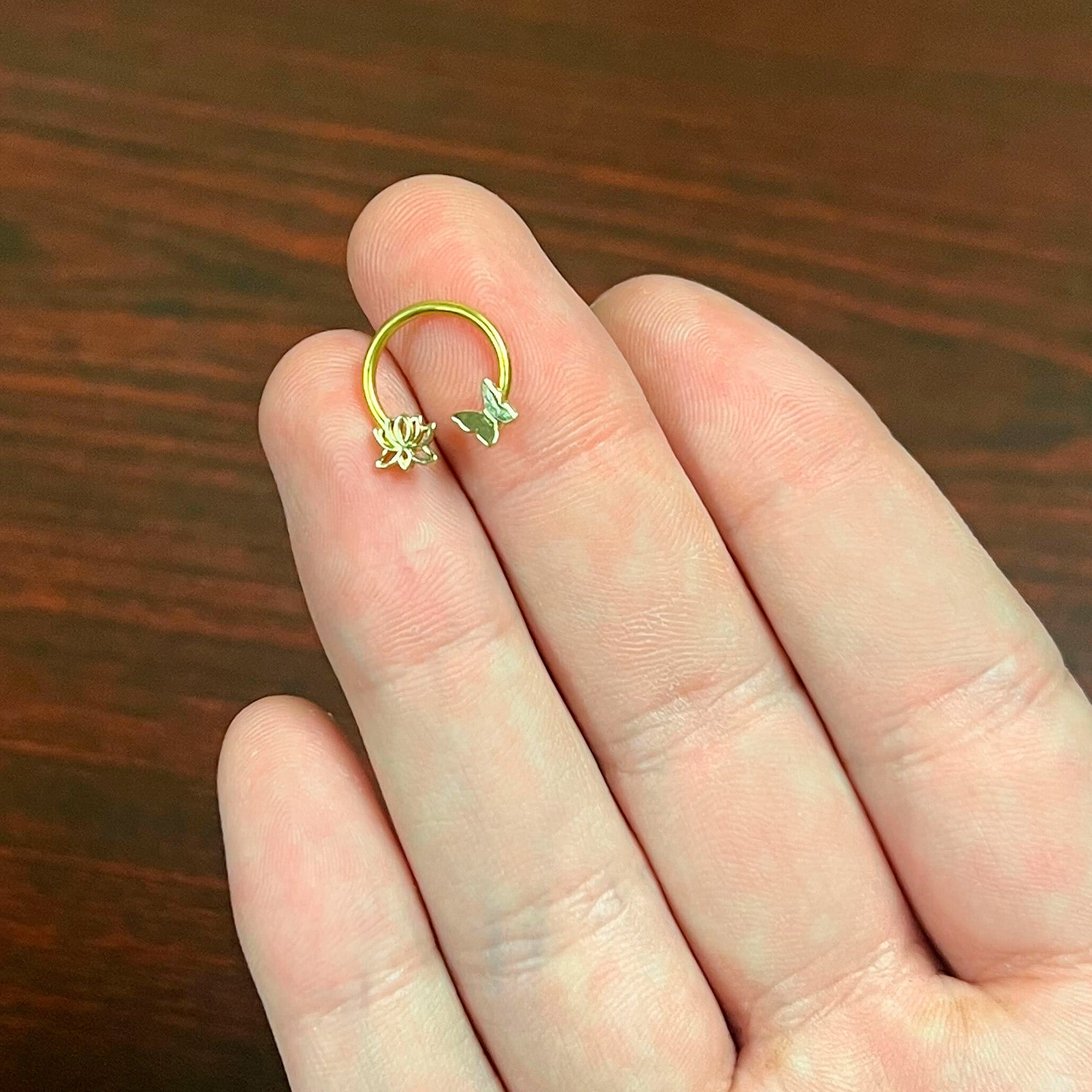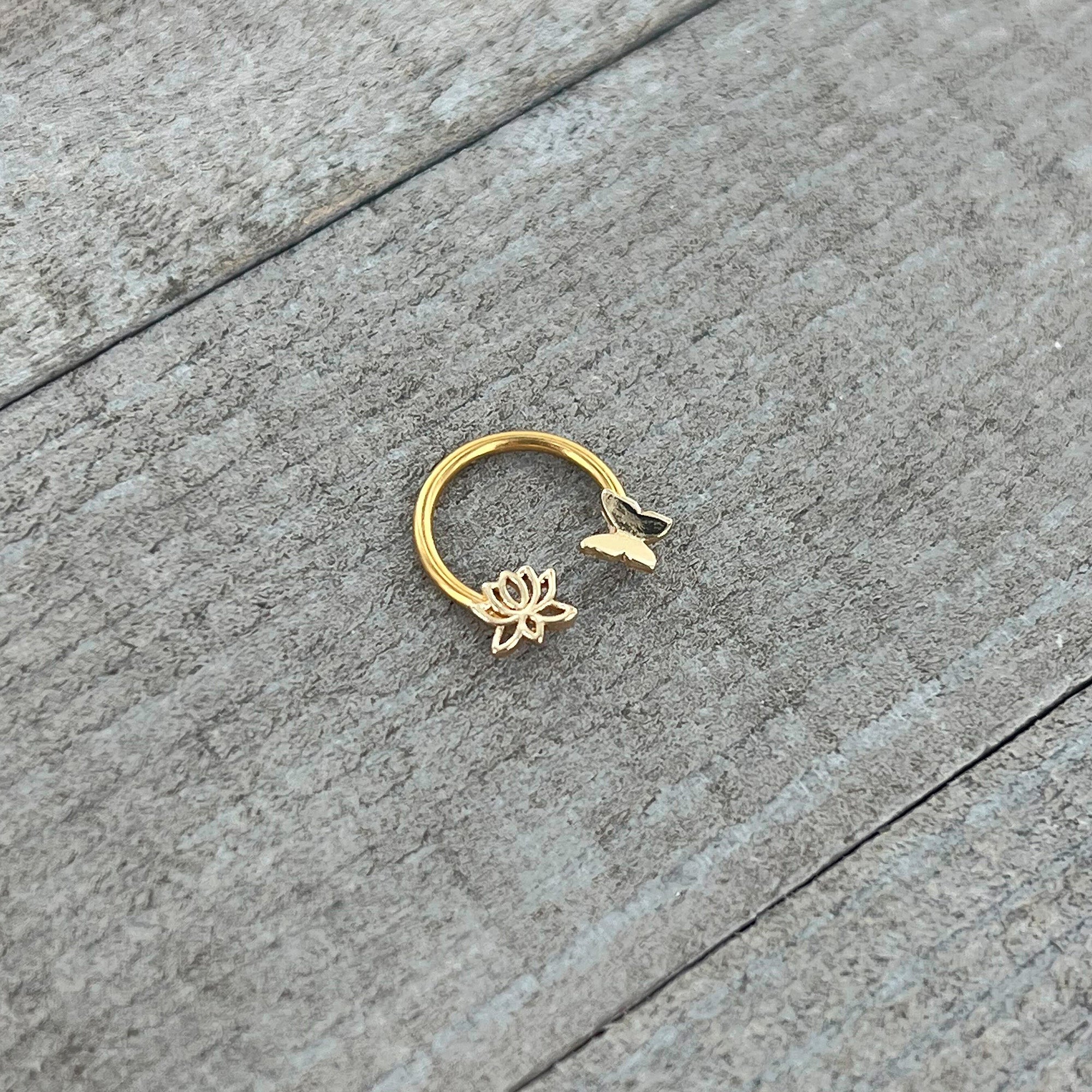 What could feel more like Spring than this 16 gauge septum ring? It's made with a 10mm gold tone PVD over 316L surgical grade stainless steel circular barbell. One end features an openwork lotus flower charm, with an airy and and simple style. The other end features an unadorned butterfly with simple detailing and a matching style. You can even rock this ring in multiple piercings including tragus, helix, and some daith piercings. Let your cartilage piercings sport some springtime style with this charming and stylish cartilage piercing ring!