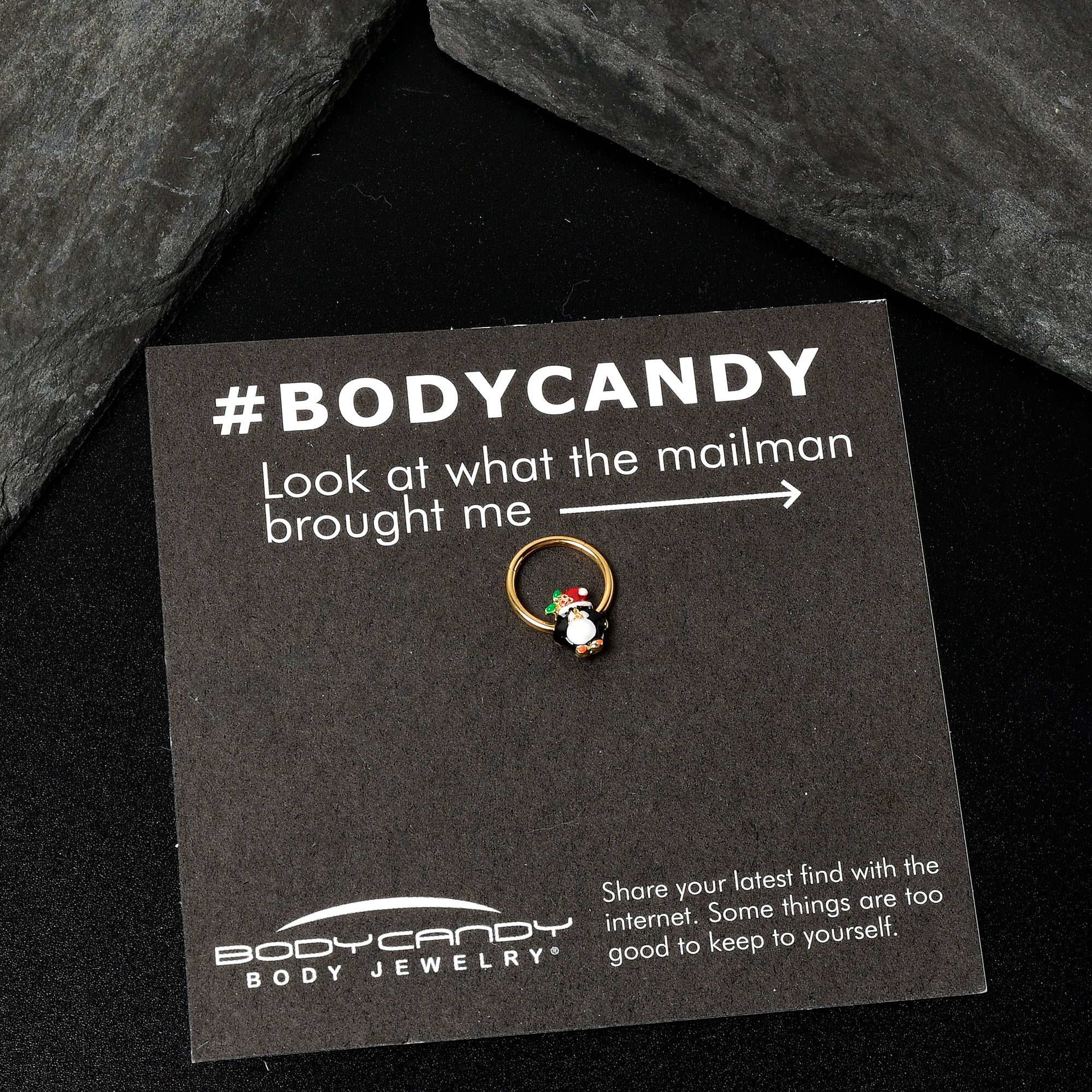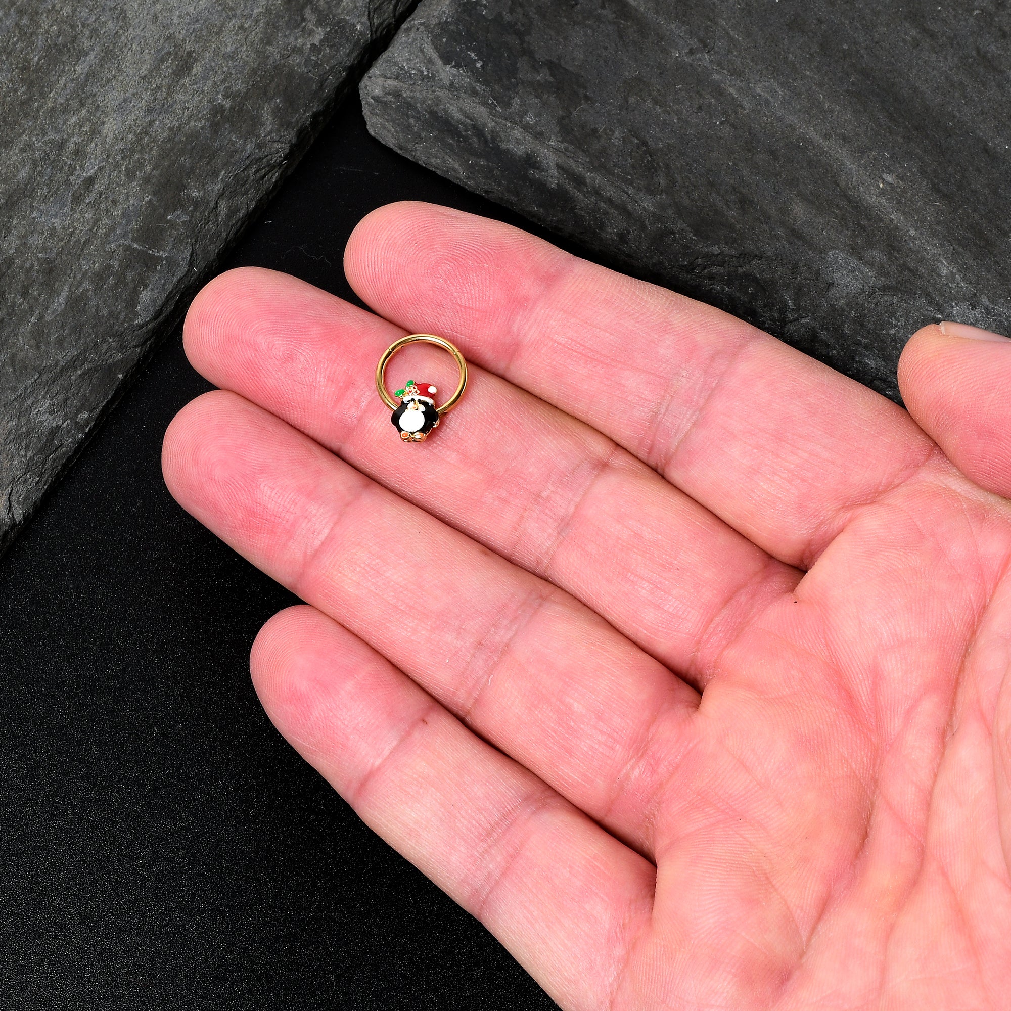 You want to dress to impress for the holidays, like the penguin on this 16 gauge septum ring! It's made with a 10mm gold tone PVD over 316L surgical grade stainless steel hinged circular ring. It features a penguin charm, with the penguin rocking its traditional black and white. The penguin is also sporting a festive Santa cap, embellished with a sprig of holly. It also features a non-removable, hinged segment that makes insertion and removal a breeze and you can rock it in multiple piercings including tragus, helix, and some daith piercings. You'll be rocking your finest when you're rocking this merry penguin cartilage piercing ring.