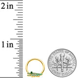 Nom, nom, nom...the alligator on this 16 gauge septum ring is hungry for style! It's made with a 10mm gold tone PVD over 316L surgical grade stainless steel hinged circular ring. It features an alligator charm, simply styled, paved with green embellishments and featuring a green eye. The alligator has its mouth open, giving it a whimsically hungry appearance. It also features a hinged, non-removable segment that makes insertion and removal a breeze and you can wear it in multiple piercings including tragus, helix, and some daith piercings. This is one cartilage piercing ring you'll be hungry to wear!