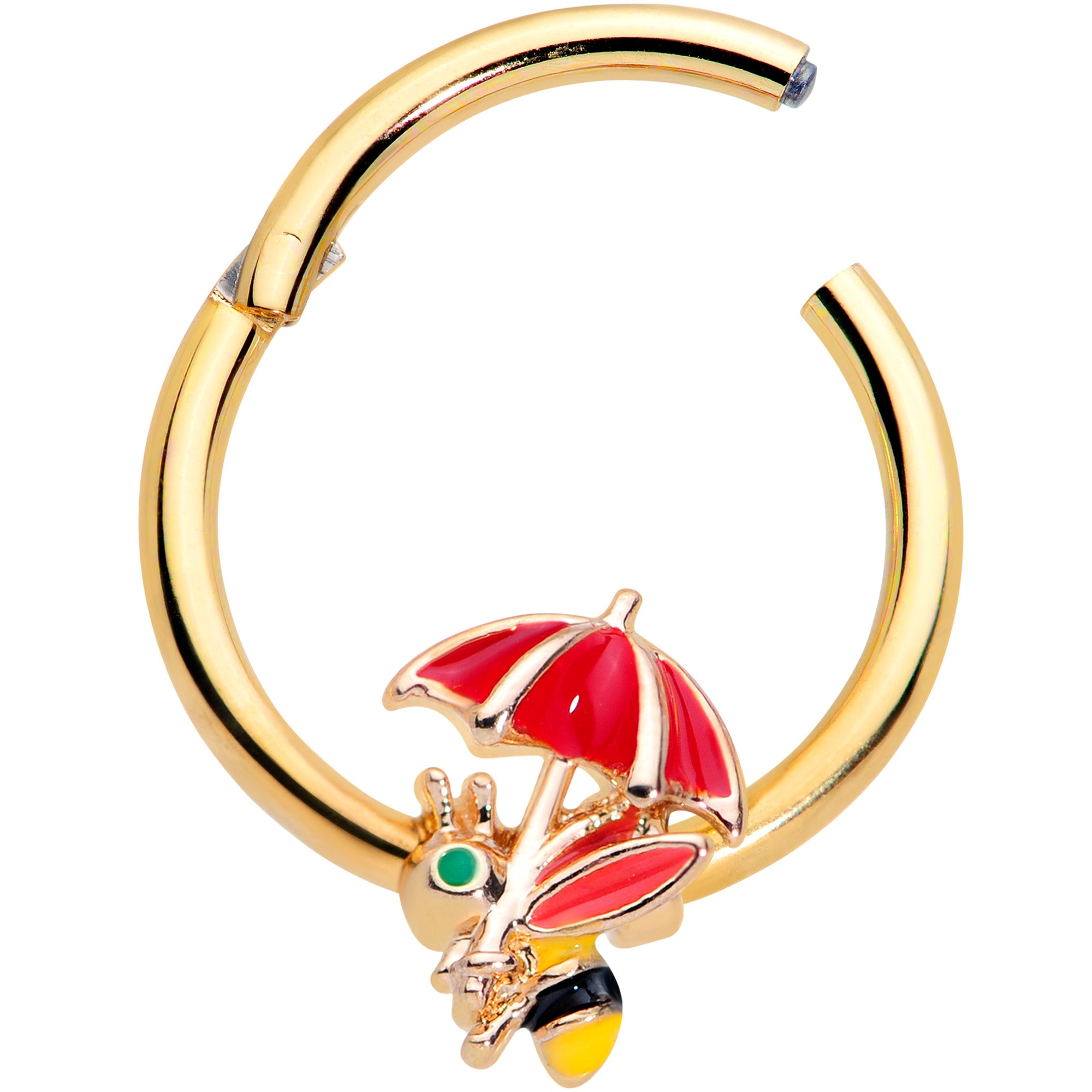 Even rainy days can bee beautiful, like on this 16 gauge septum ring! It's made with a 10mm gold tone PVD over 316L surgical grade stainless steel hinged circular ring. It features a bee charm, inlaid in yellow and black. The bee is carrying a red umbrella and features matching red embellishment on its wings. It also features a green eye for an added touch of style and color! It also features a non-removable, hinged segment that makes insertion and removal a breeze and you can wear it in multiple piercings including tragus, helix, and septum piercings. This is one honey of a cartilage piercing ring!