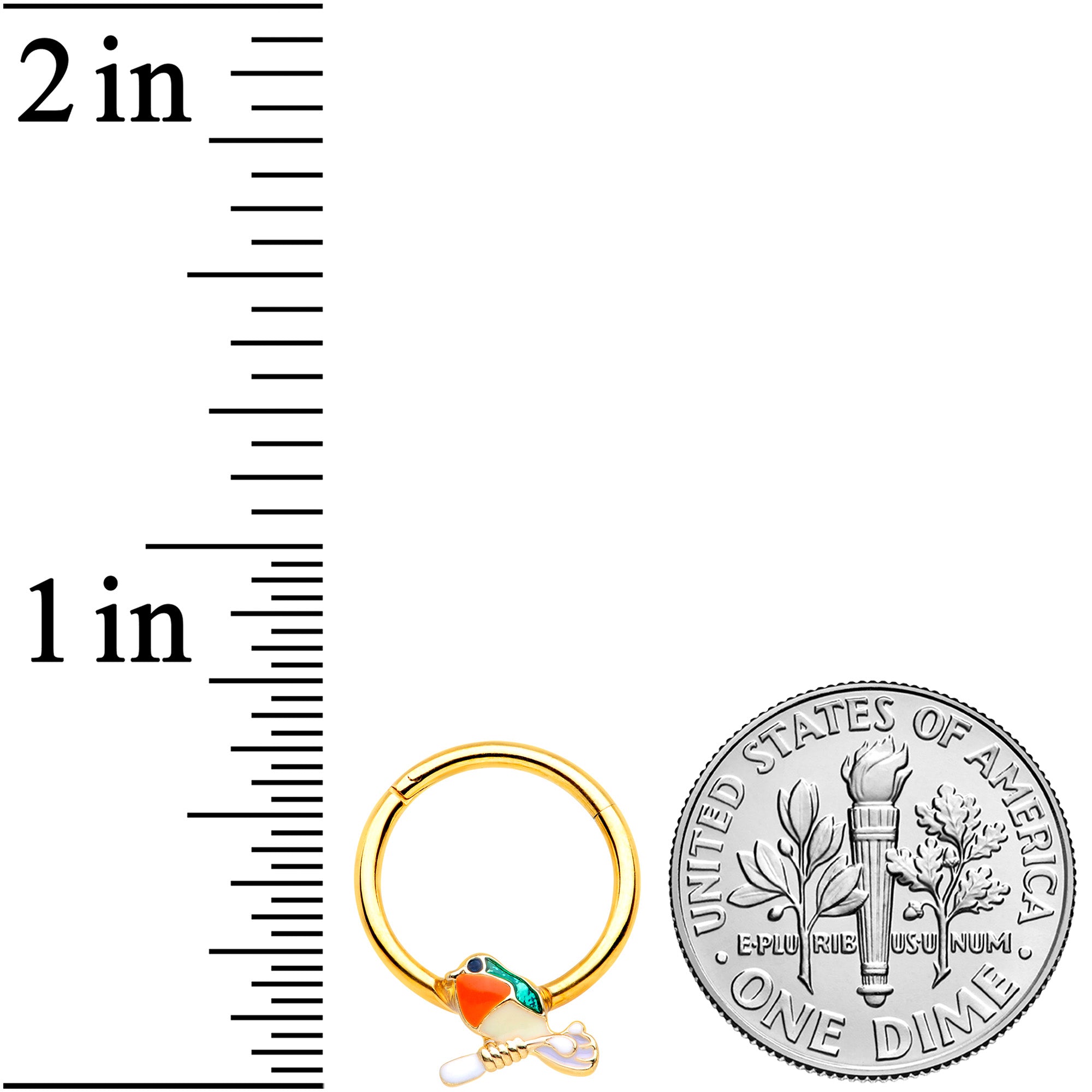Let this beautiful bird pull up a perch in your cartilage piercing with this 16 gauge cartilage earring! It's made with a 10mm gold tone PVD over 316L surgical grade stainless steel hinged circular ring. It features a gorgeous orange and white songbird charm with a green gem eye and matching green embellishment. It also features a non-removable, hinged segment that makes insertion and removal a breeze. Best of all, this little bird can perch in multiple piercings including helix, daith, rook, tragus, and septum piercings. With such stunning details, this beautiful bird cartilage jewelry will make you want to burst into song!