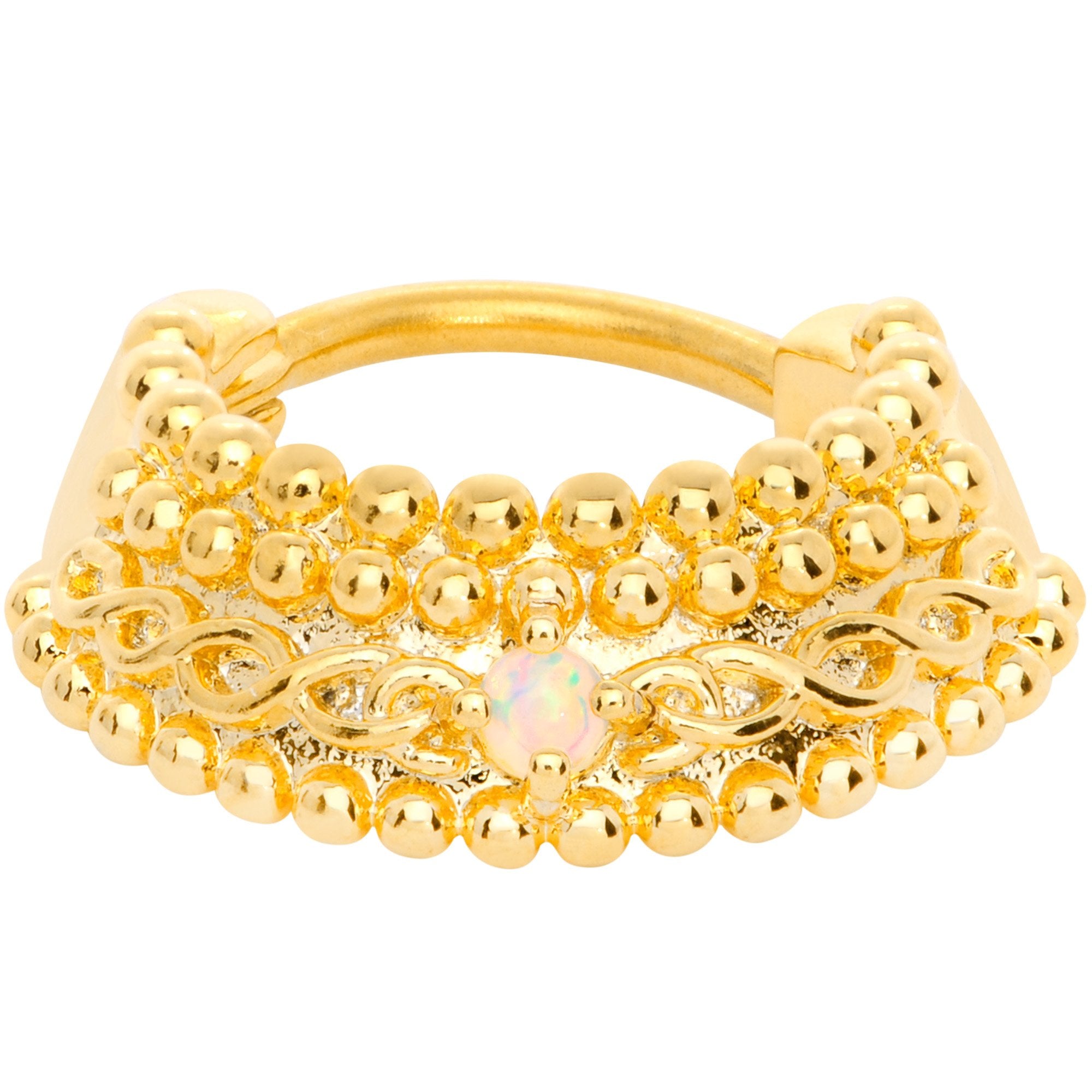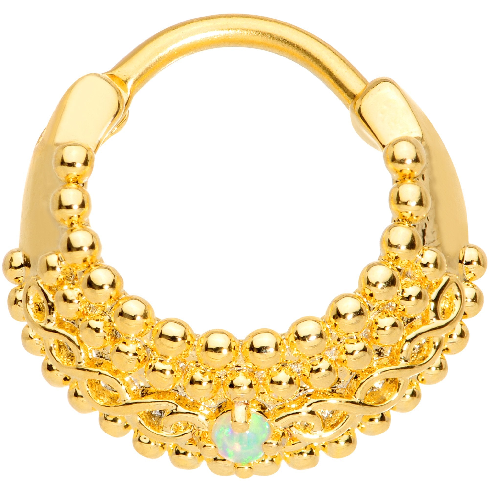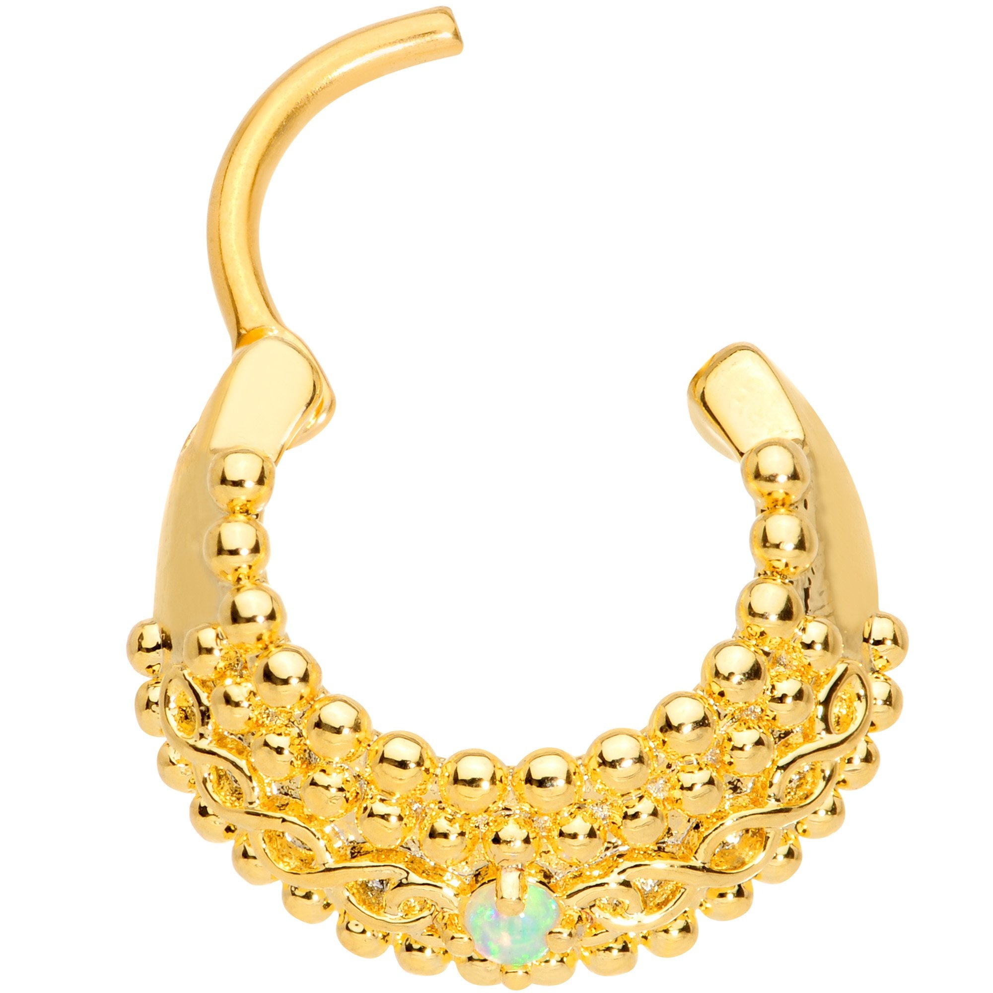 If you like a little bit of eye-catching style in your septum piercing then you will love this 16 gauge septum jewelry! Made with a 10mm gold tone plated over 316L surgical grade stainless steel hinged curved barbell, this nose ring features a hinged barbell for easy insertion and removal as well as a bottom arc set with a green synthetic opal and a textured, layered look that no one can ignore.