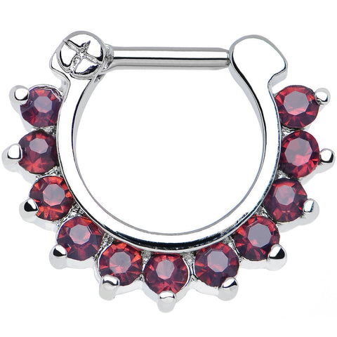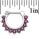 Change up your look with this brilliant septum clicker and its row of glimmering purple gems. This 16 gauge stainless steel septum clicker has a hinge that easily opens and clicks closed. Pierced septum Body Jewelry.