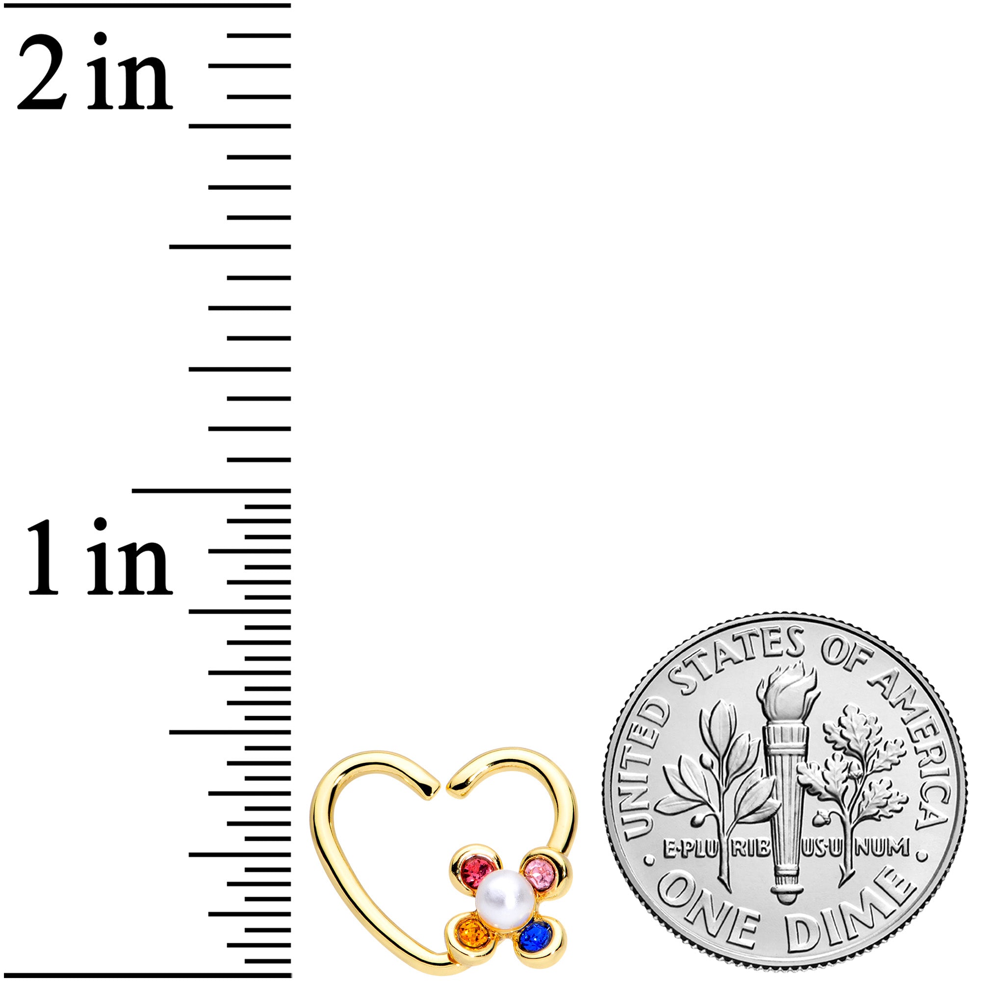 Put a little flower power in your cartilage piercing this Valentine's Day with this right side 16 gauge closure ring! It's 10mm and made with gold tone PVD over 316L surgical grade stainless steel. This heart-shaped jewelry features a flower charm composed entirely of gems, with each petal a different color. There's one petal each in light pink, deep blue, golden yellow, and hot fuschia pink. At the center, the flower is further embellished with a white pearlescent orb. It's super easy to insert and remove - simply twist the ring open, insert, and then twist gently shut again. This cartilage jewelry works well in multiple piercings including your helix, tragus, daith, rook, and more.