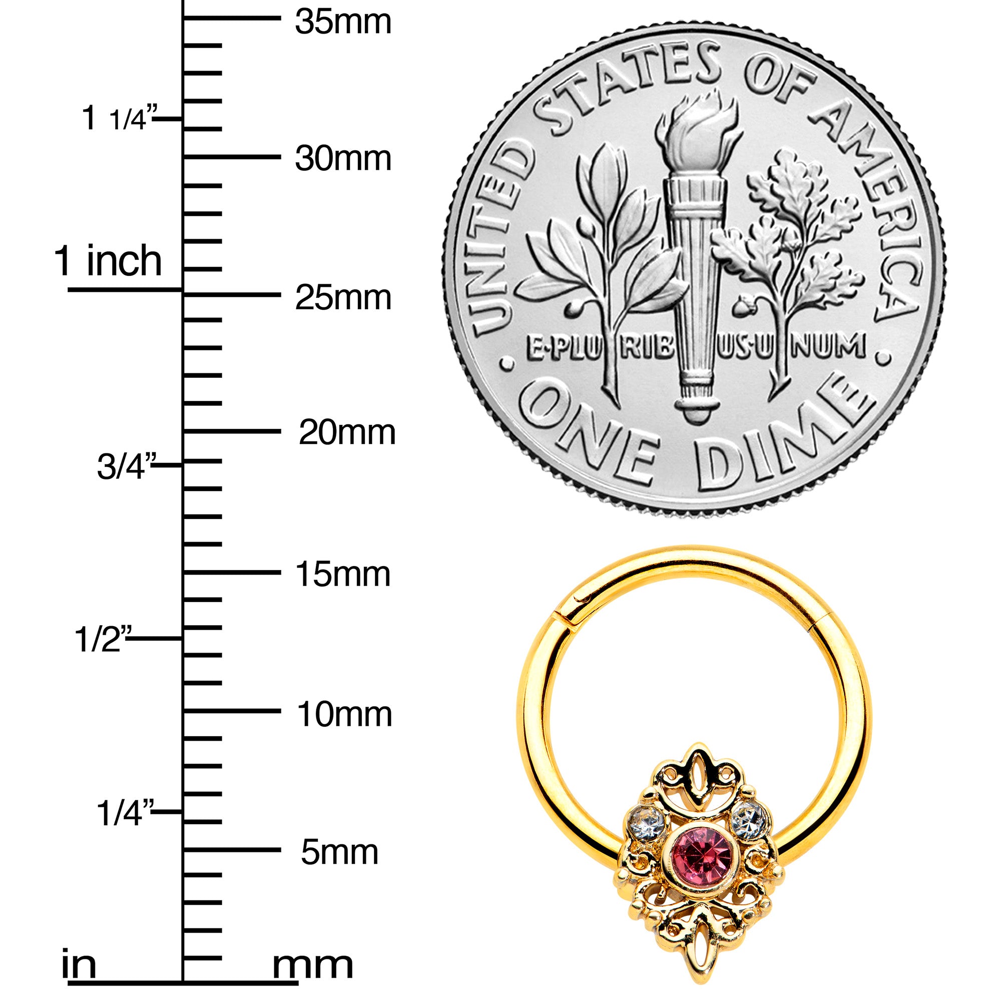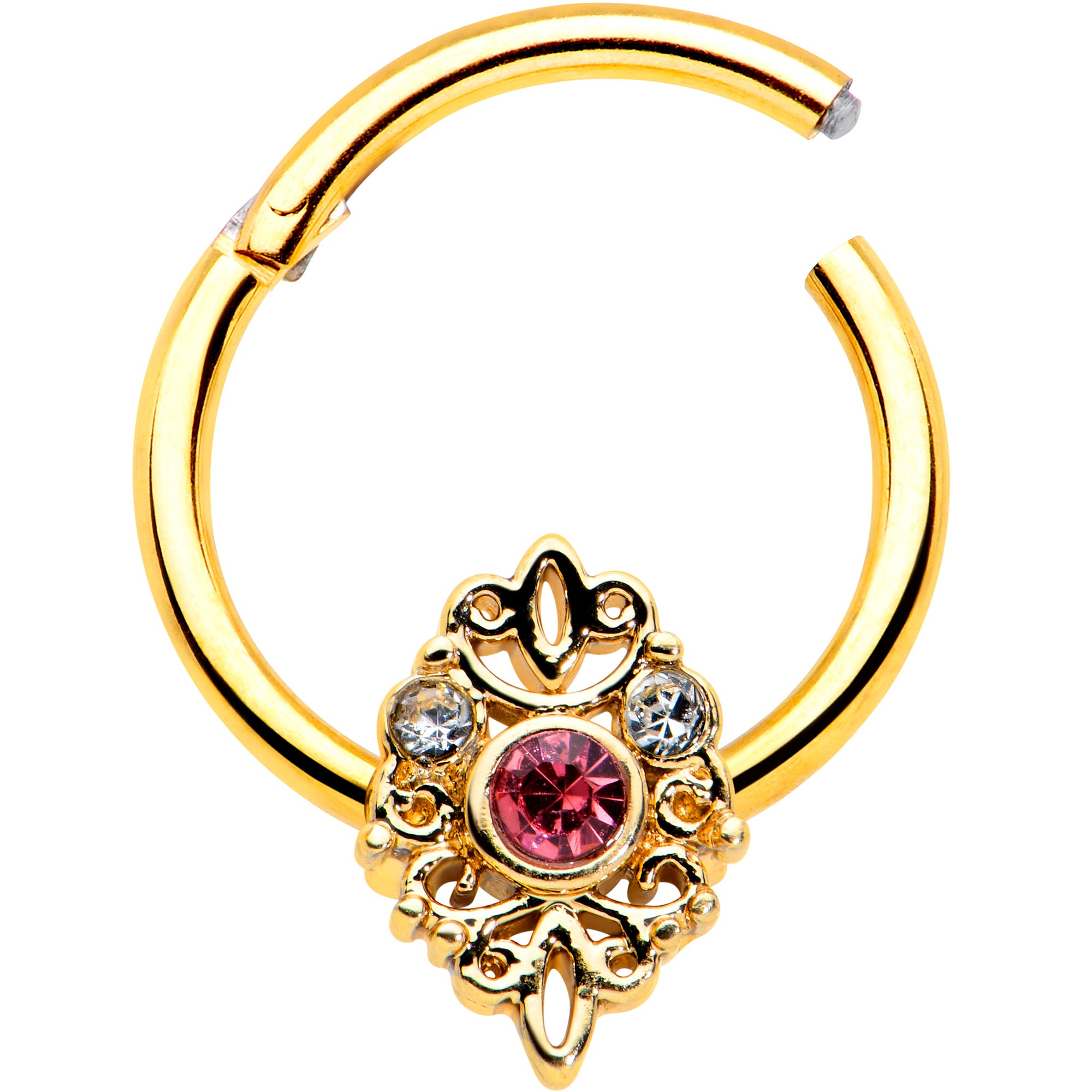 This 16 gauge septum ring is sure to make you love its lacy look! It's made with a 10mm gold tone PVD over 316L surgical grade stainless steel hinged circular ring. It features a lacy, openwork charm with looping details. It's set at the center with a large pink gem and is further embellished with a pair of small clear gems. It also features a non-removable, hinged segment that makes insertion and removal a snap and you can rock it in multiple piercings including tragus, helix, and some daith piercings. This cartilage piercing ring is sure to turn you into a lace lover!