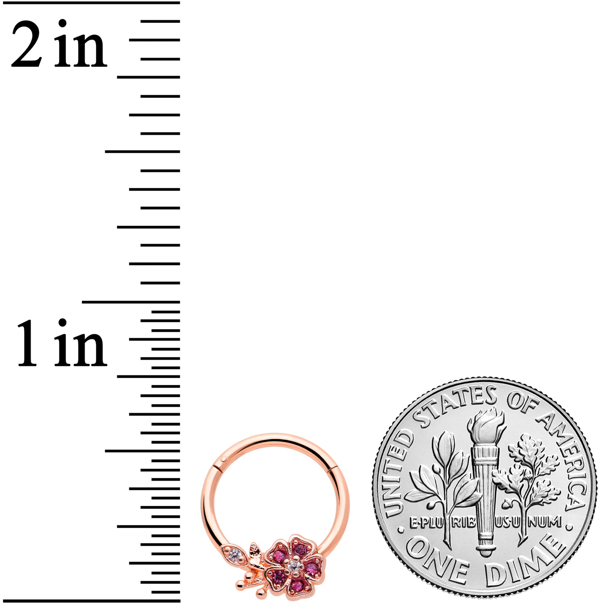 Dress up your cartilage piercing with flowers, with this 16 gauge septum ring! It's made with a 10mm rose gold tone PVD over 316L surgical grade stainless steel hinged circular ring. It features a flower charm with pink gem heart petals and a clear gem in the center. It also features a stem, with leaves set with clear gems and matching embellishment. This cartilage earring also features a hinged, non-removable segment that makes insertion and removala breeze and can be worn in multiple piercings such as helix, tragus, and septum piercings. This pretty spring flower is one you'll never want to let leaf your cartilage piercing!