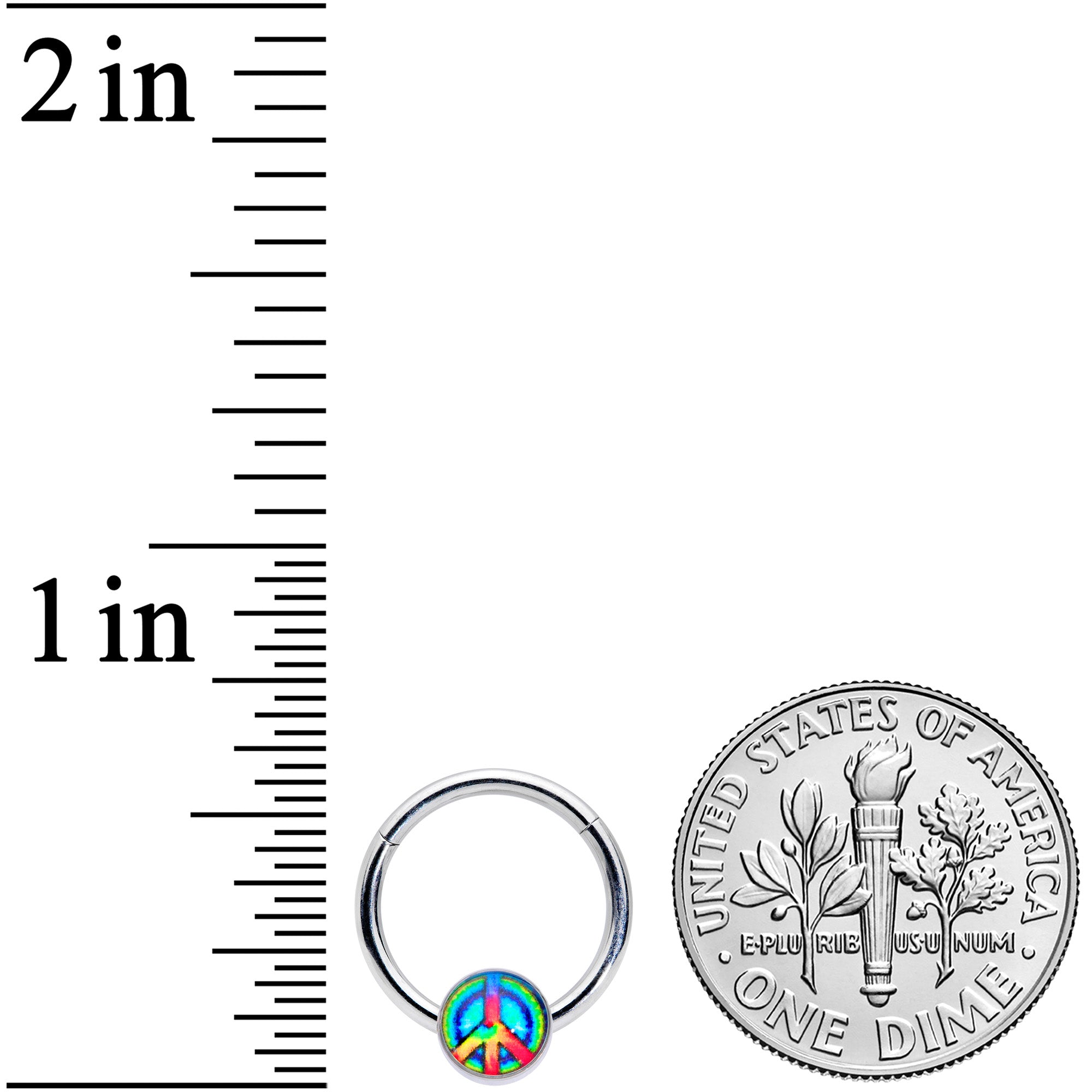 Peace packs a powerful punch of rainbow color on this 16 gauge septum ring! It's made with a 10mm durable 316L surgical grade stainless steel hinged circular ring and features a circular peace sign charm. The peace sign is on a rainbow color background with a tie dye pattern for a 60s feel on some very modern jewelry! It also features a non-removable, hinged segment that makes insertion and removal a snap. You can even rock it in multiple piercings including septum, tragus, and helix.. Support peace in every color of the rainbow with this rockin' retro cartilage jewelry!